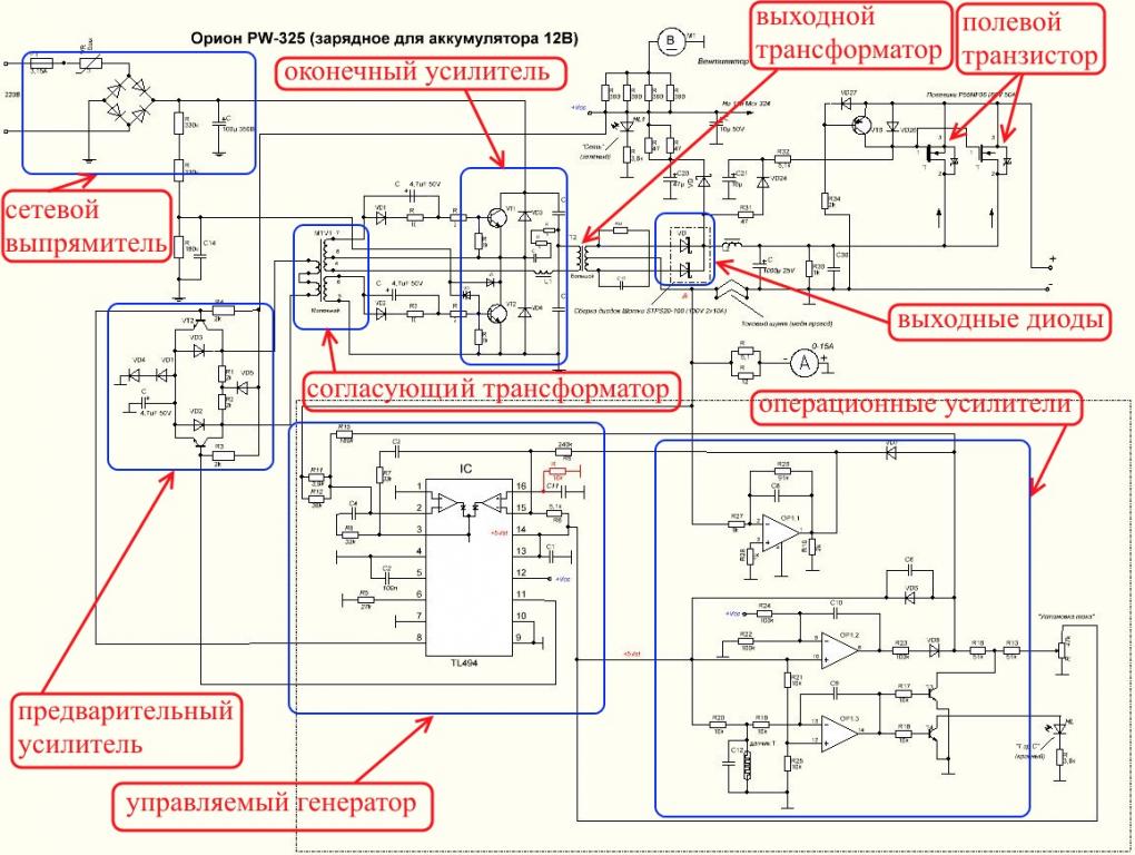 Оказывается Орионов теперь разных не меряно! Самые лучшие Петербургские. Но и у них присутствуют недостатки как то чисто декоративные радиаторы охлаждения транзисторов С2335 и диодной сборки(полумоста, диода Шоттки) SB 20200FCT (аналог MBR 20200CT) у которого радиатор-Al пластинка хоть немного больше... Говорят чаще летят средний транзистор С2335 между диодной сборкой и вторым(крайним транзистором С2335). Средний сгорает на КЗ, а крайний запирается и остается целым. Еще в дополнение часто сгорает диодная сборка Шоттки(но не у меня). Часто еще сгорает пара диодов in 4007(1n 4007) выпрямителя на входе, иногда черненький варьистор-термистор взрывается NTC 10D-11, у меня стоял NTC 5D-1Б или 5 на конце не понял-у нас дефицит, посоветовали нечто подобное синего цвета, но здоровее-это защита от КЗ.) Сейчас в интернете появились схемы прежде засекреченные производителями, что ИМХО оказало им медвежью услугу!... И множество сообщений и видео по ремонту! Вот я и решил восстановить свой Орион (завтра заколхозю цепь питания через лампу и попробую что наремонтировал...). Умельцы заменяют декоративные радиаторы радиаторами от блоков питания компьютеров и ставят более мощные вентиляторы. У меня неисправного БП от компа не оказалось, потому изобразил самодельные повышенной площади и эксклюзивной формы с отверстиями вверху. Посадил транзисторы и Шоттки, термодатчик на слюду с термопастой (производитель пожалел даже термопасты)... А, да, забыл. Микросхема МС TL494CN как понял у меня в норме и вообще она сгорает крайне редко. Еще перепаял себе провода идущие к аккумулятору на более толстые с хорошей изоляцией и чуть длиннее. Защита от переполюсовки у меня на 3 полевых транзисторах P55NF06.