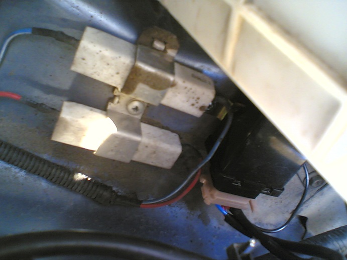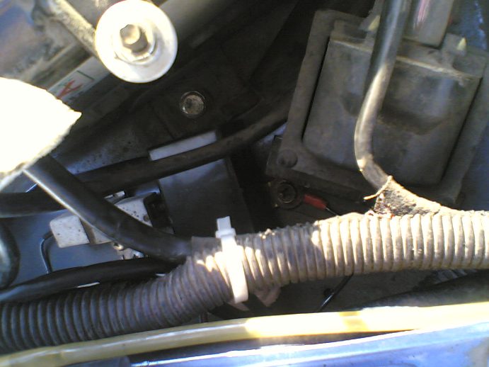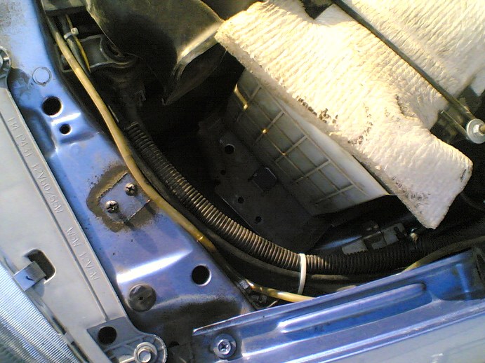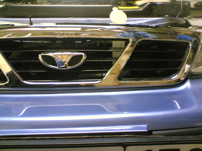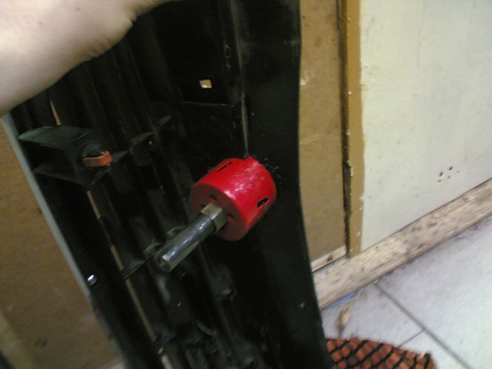 Теперь приступаем к сверлению отверстия в пластмаске на которой крепится решётка радиатора. Прикладываем её к авто, замечаем где трубка упёрлась в неё, хватаем коронку (мне попалась 50мм) и сверлим в этом месте дыру.