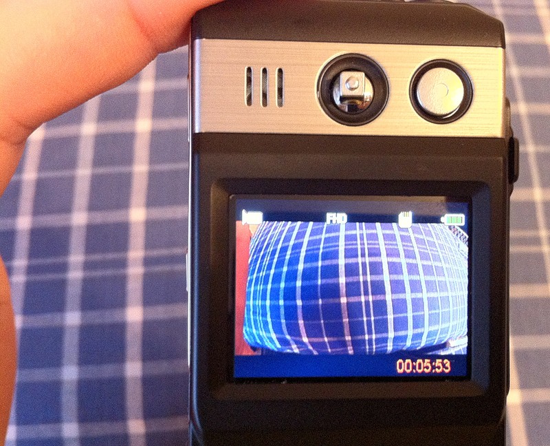 Сектор обзора радует, по краям картинки заметны скругления, как у профессиональной фотооптики типа фишай, "рыбий глаз" то есть. Сравнив съемку нового регистратора с Адвокам-ХД2 , пришел к выводу, что по визуальным ощущениям, угол обзора у обоих девайсов одинаковый. А он у Адвокама простите, 160 градусов. На фотке кстати видно, как я держу регистратор, и все равно рука попадает на край кадра, хороший лупоглаз.