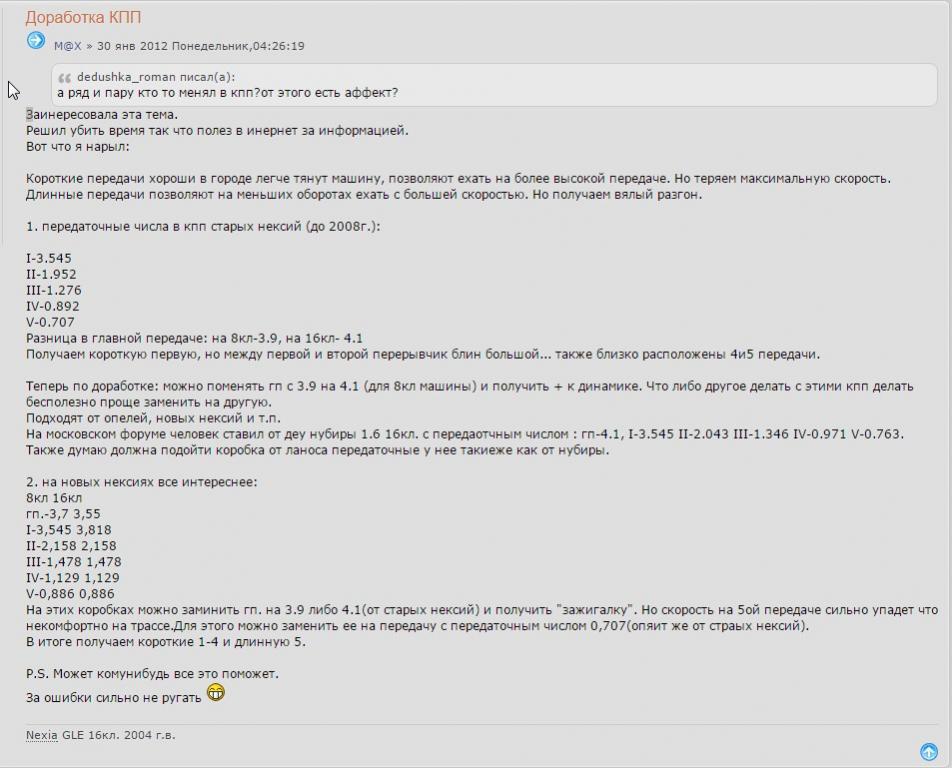Понятие "медленно набирает скорость" - абстрактное... и у каждого оно, это понятие, свое... То, что для меня - пуля, для тебя - черепаха... Динамика любит цифры... Вот если выложил бы цифры, то и разговор был бы серьезным... А так - ни о чем... Да и для 75 лошадок, Нексия, машина тяжеловата... Какая тут может быть динамика?! ИМХО.