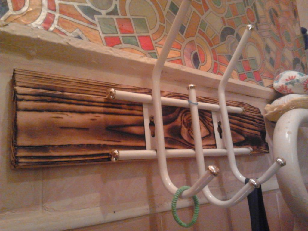 Декоративная обработка огнём "в чистом виде" тут ящичек и перемычки для ванной. А вот на первой фотке не только окаймление окон но и сам вид "досок" или "брёвен" домика - выжжено выжигателем. Вешалки в ванной - совмещение выжигания (структура древесины выжжена "орнаментом") и обработки огнём (вся остальная площадь).