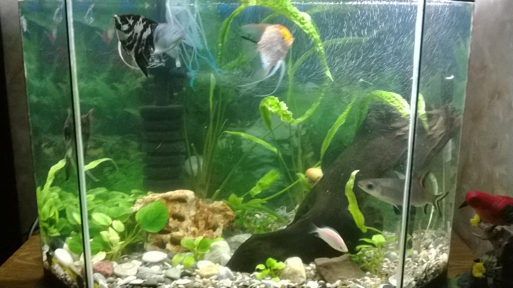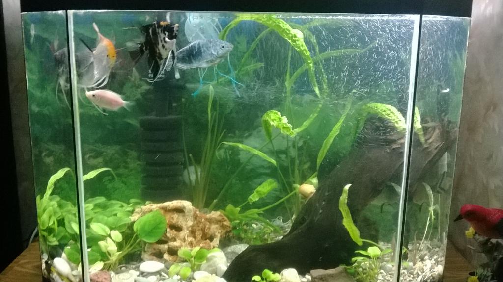 И еще я вижу аэрация у тебя есть, а фильтр есть для воды? Если да то где он? Выглядит литров на 100. Грунт из разноцветных камушков? Искусственные?