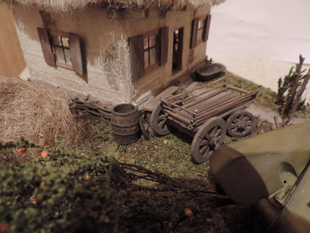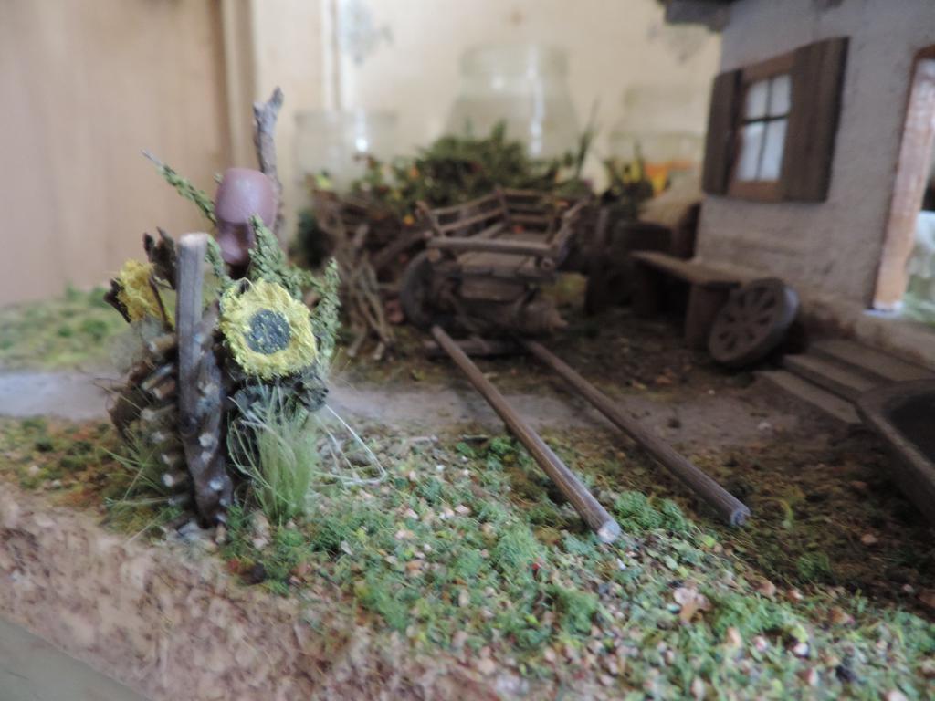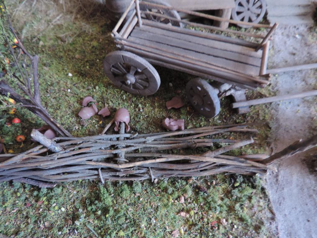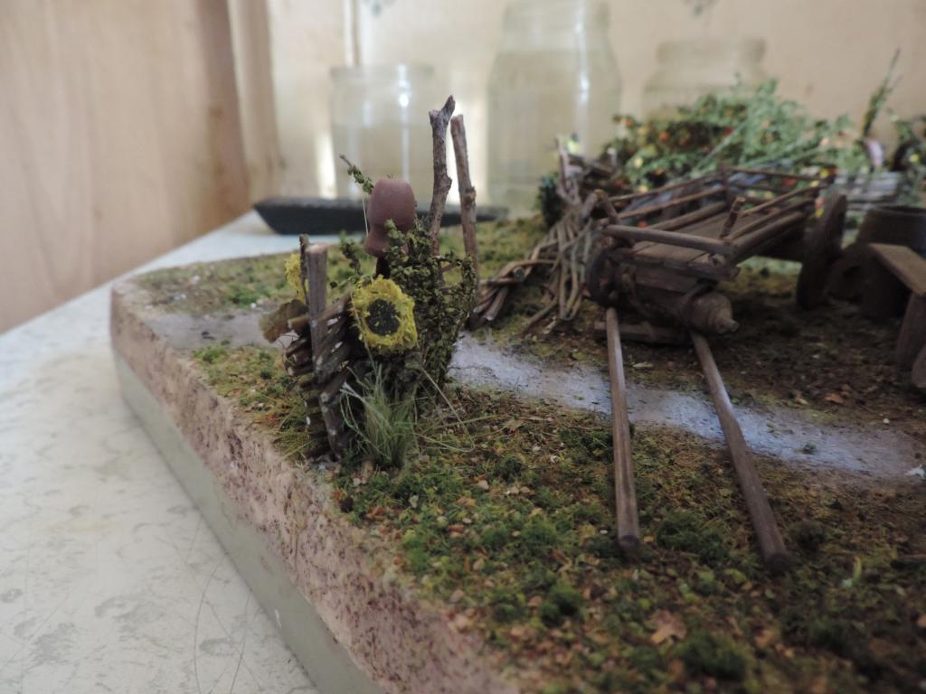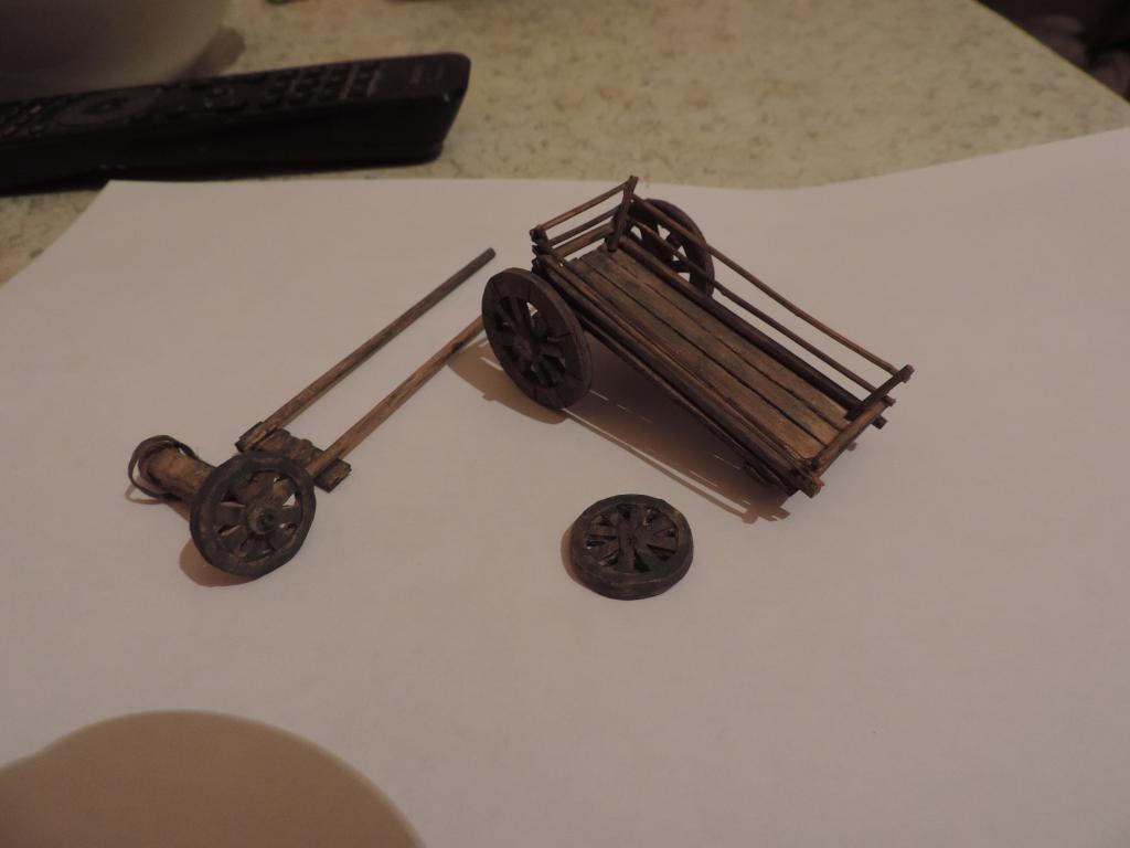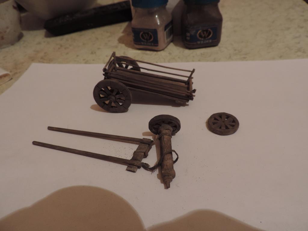 Следом изготавливаю остальные части телеги, устанавливаю колёса, крашу всё под старое дерево слабо разведённой серой акриловой краской и запыляю пигментами. Когда всё подсохло, устанавливаю телегу на диораму. Пока не приклеиваю, потому что её окончательное место зависит от расположения фигур.