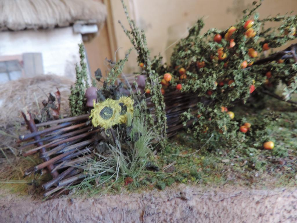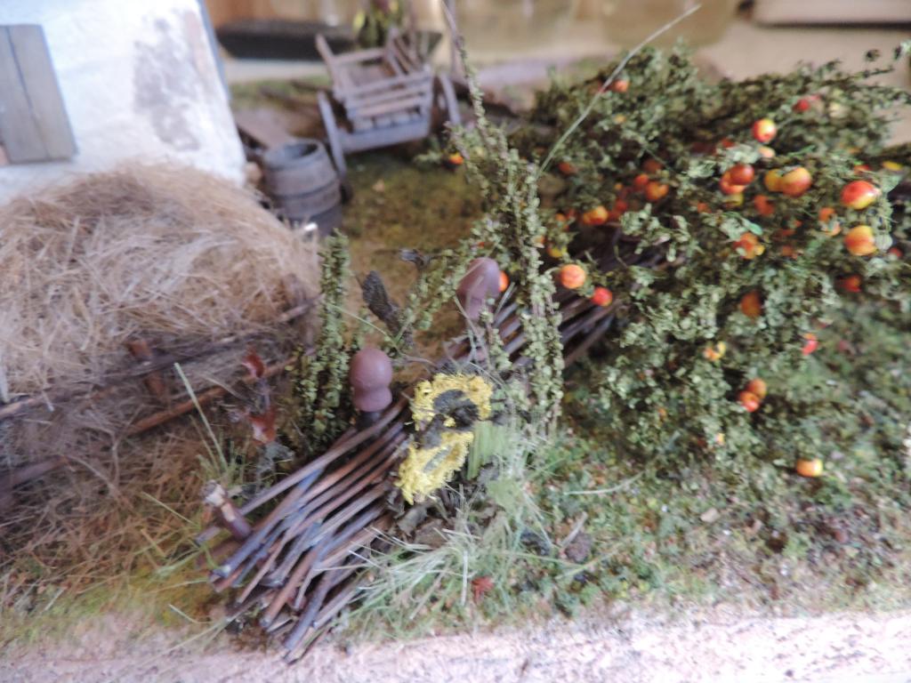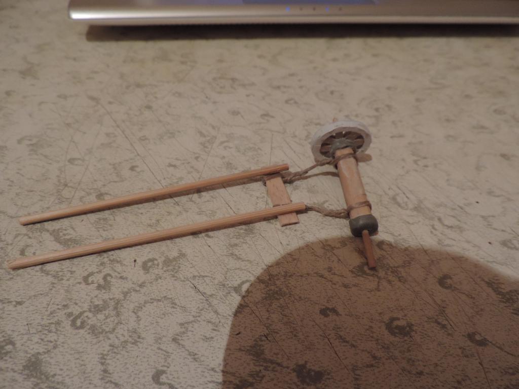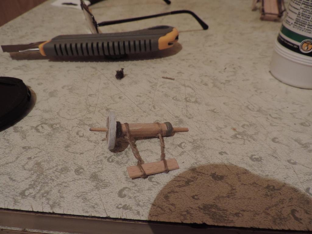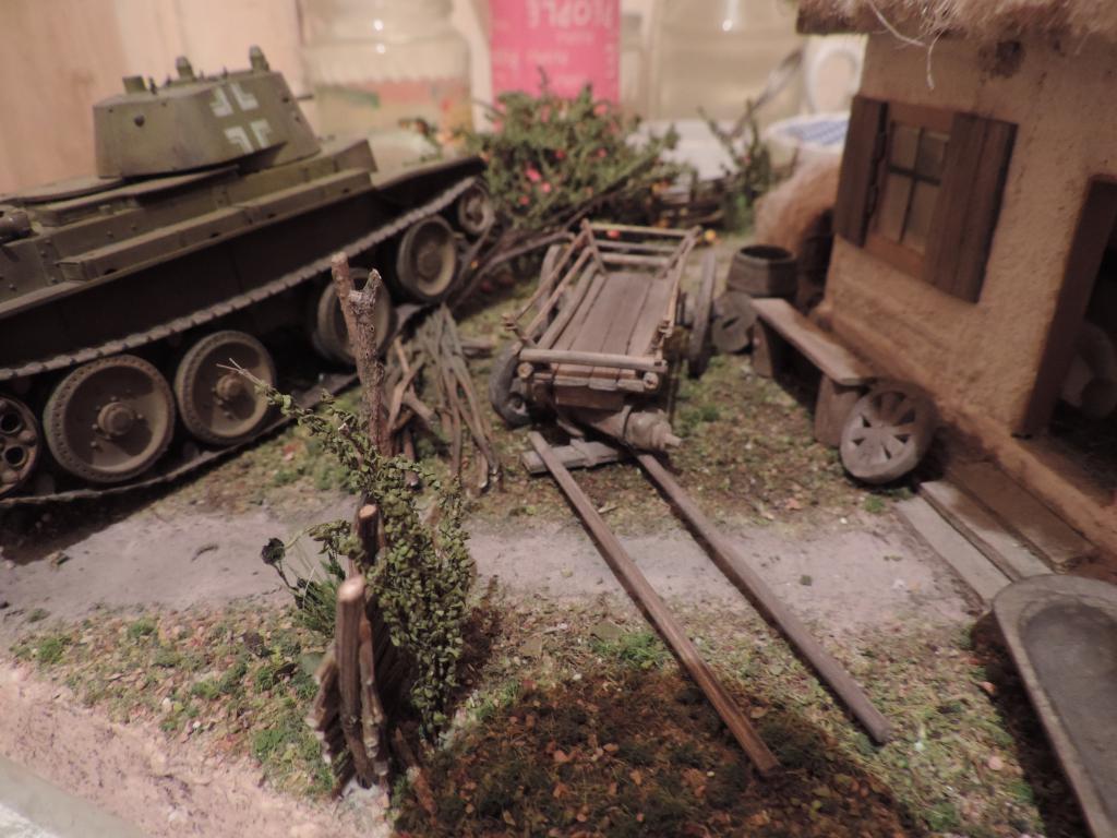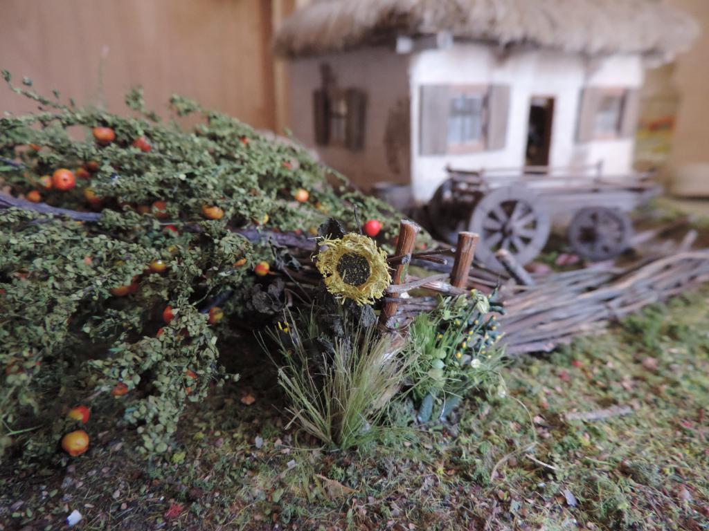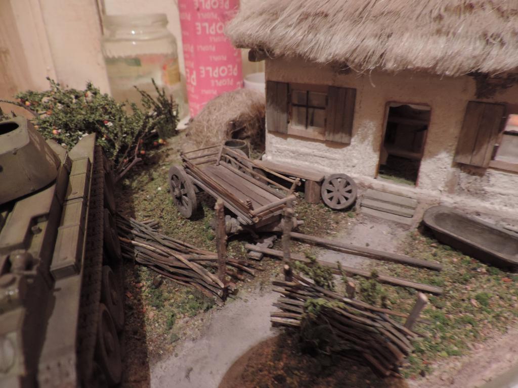Следом изготавливаю остальные части телеги, устанавливаю колёса, крашу всё под старое дерево слабо разведённой серой акриловой краской и запыляю пигментами. Когда всё подсохло, устанавливаю телегу на диораму. Пока не приклеиваю, потому что её окончательное место зависит от расположения фигур.