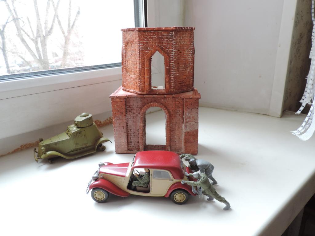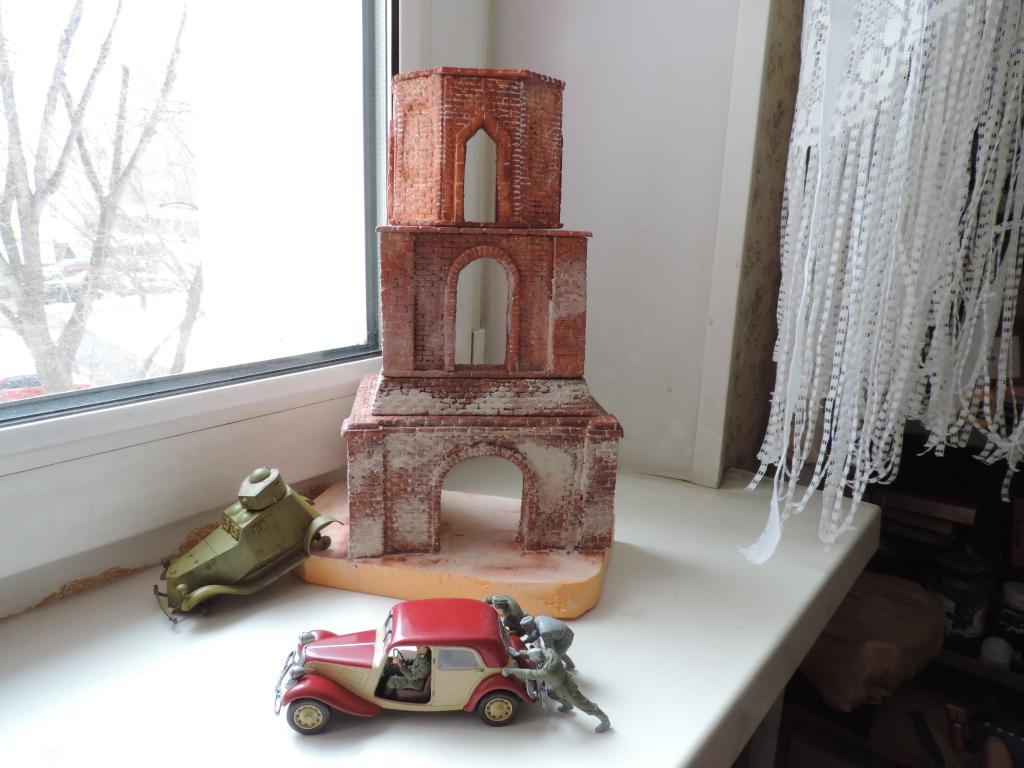 Я вот ещё что подумал - если колокольню оставить с нижним ярусом, приделать к ней небольшую верхушку и потом всё строение чуть наклонить над всем происходящим на диораме, то может даже сложиться в воображении некая аллегория нависания грозной русской духовности над германским нашествием. Но это уже из серии "А что художник этим хотел сказать...". В-общем, жду Ваших мнений, парни.