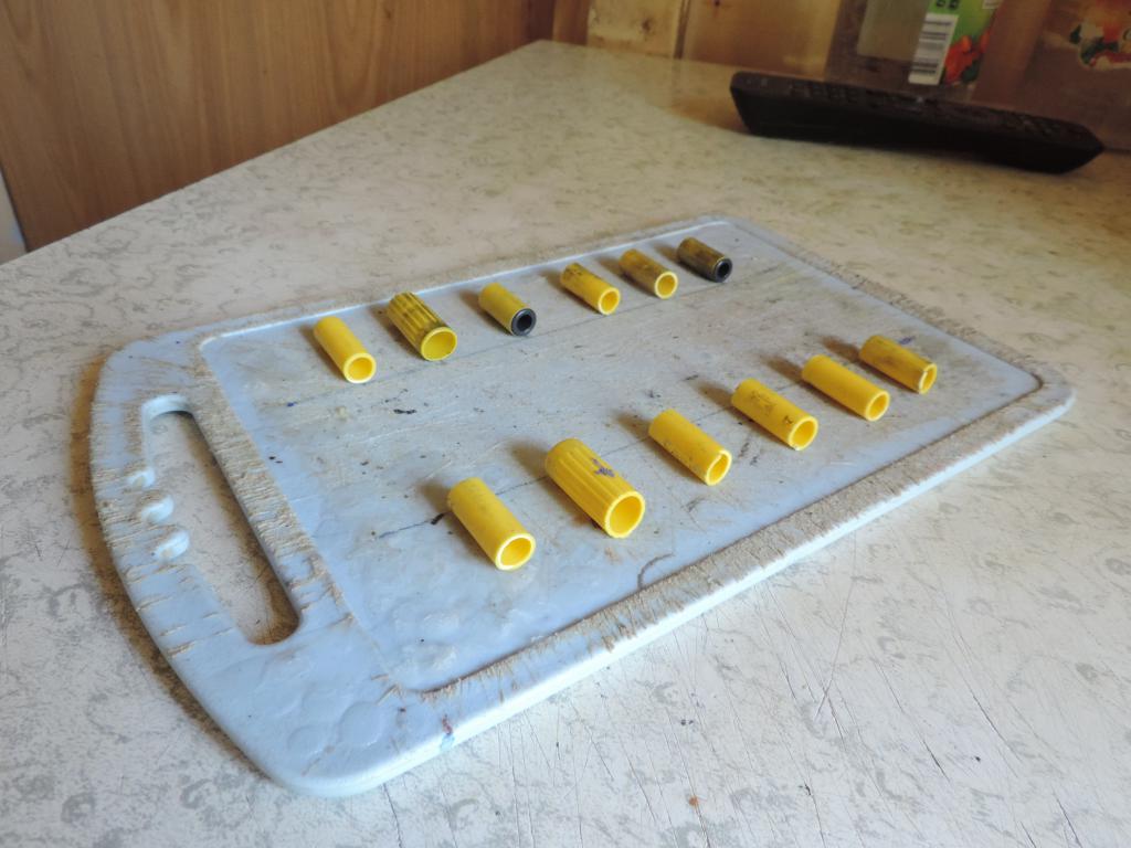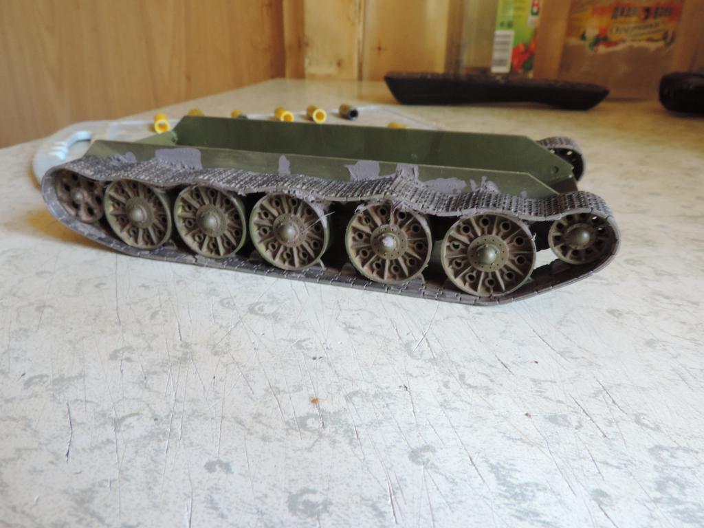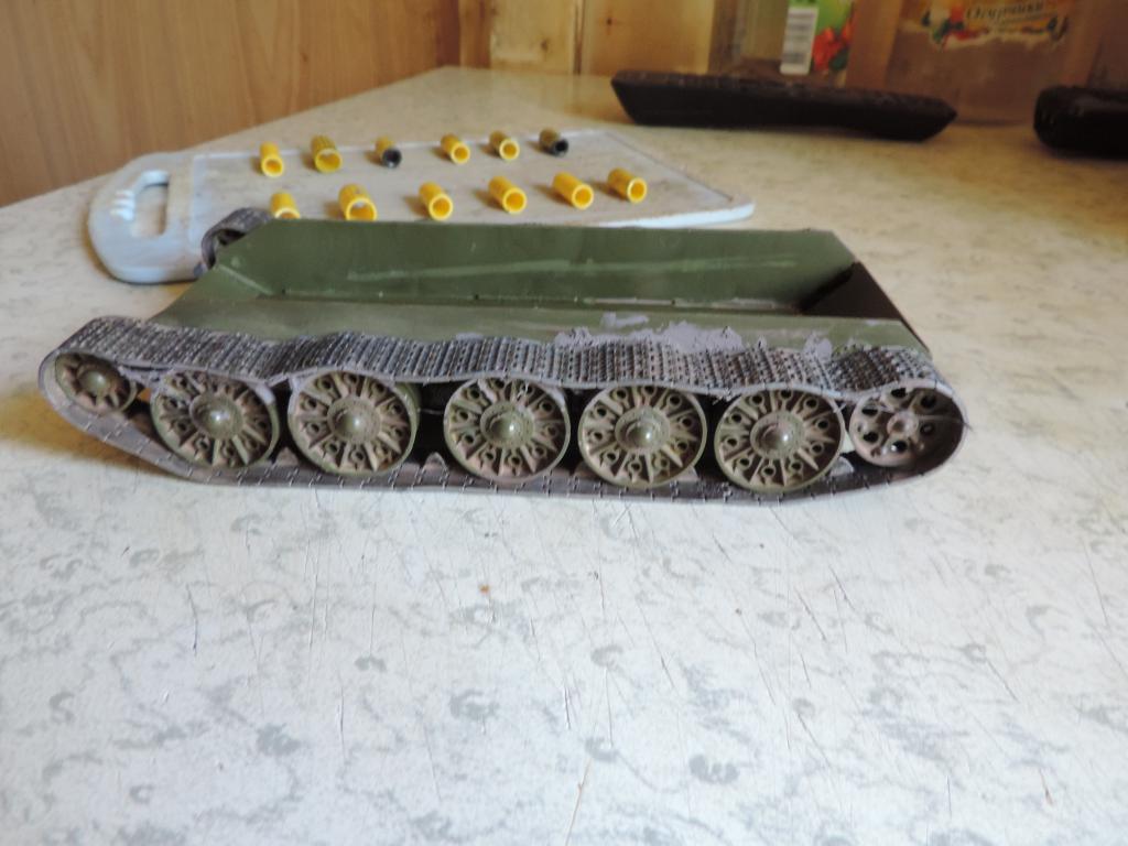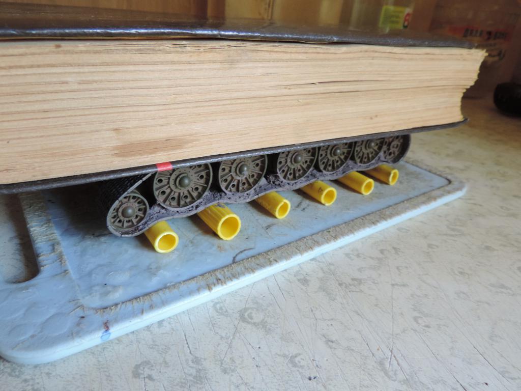 Долго думал, как решить проблему у танка с провисом гусениц. Гусеницы в наборе были резиновые, и никакой клей к ним не цеплялся, чтобы приклеить к колёсам и сформировать провис. Наконец, мысль озарило решение, которое представляю на фотографиях. Разрезал на цилиндры два старых фломастера и приклеил их суперклеем к пластмассовой основе. Потом промазал гусеницы и колёса клеем момент-монтаж, смешанным с пигментом цвета грязи. Наложил заготовку на гусеницы и всё прижал грузом (книгой). После высыхания получилось то, что нужно.