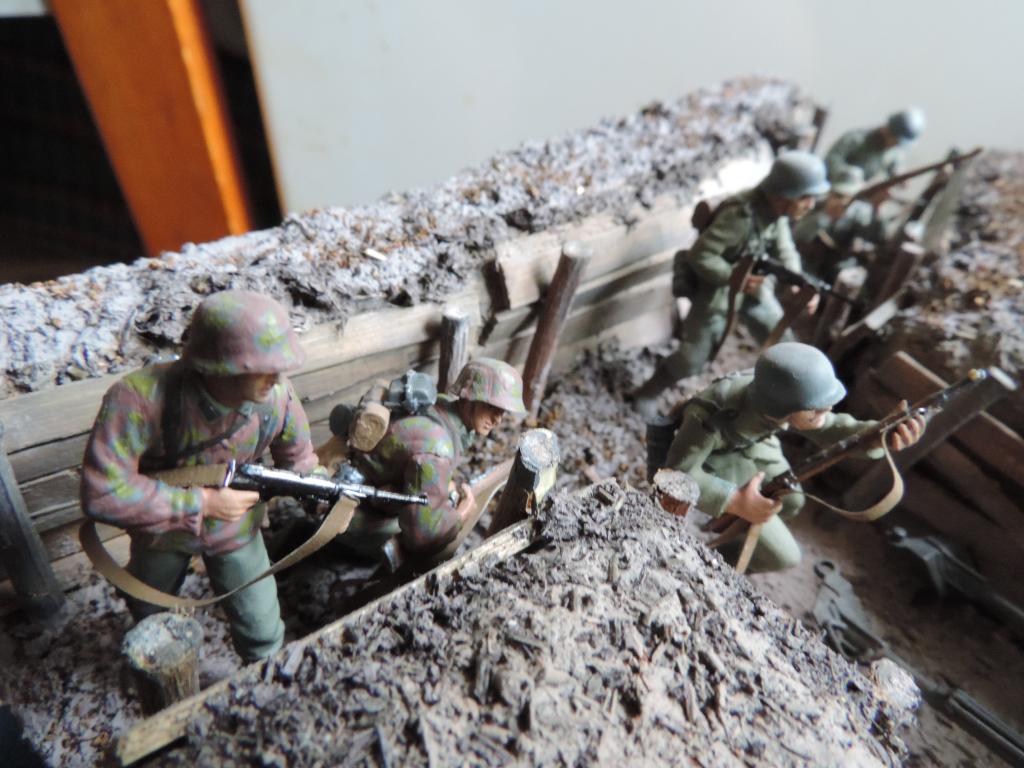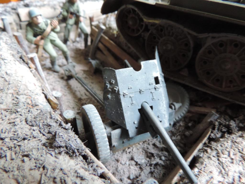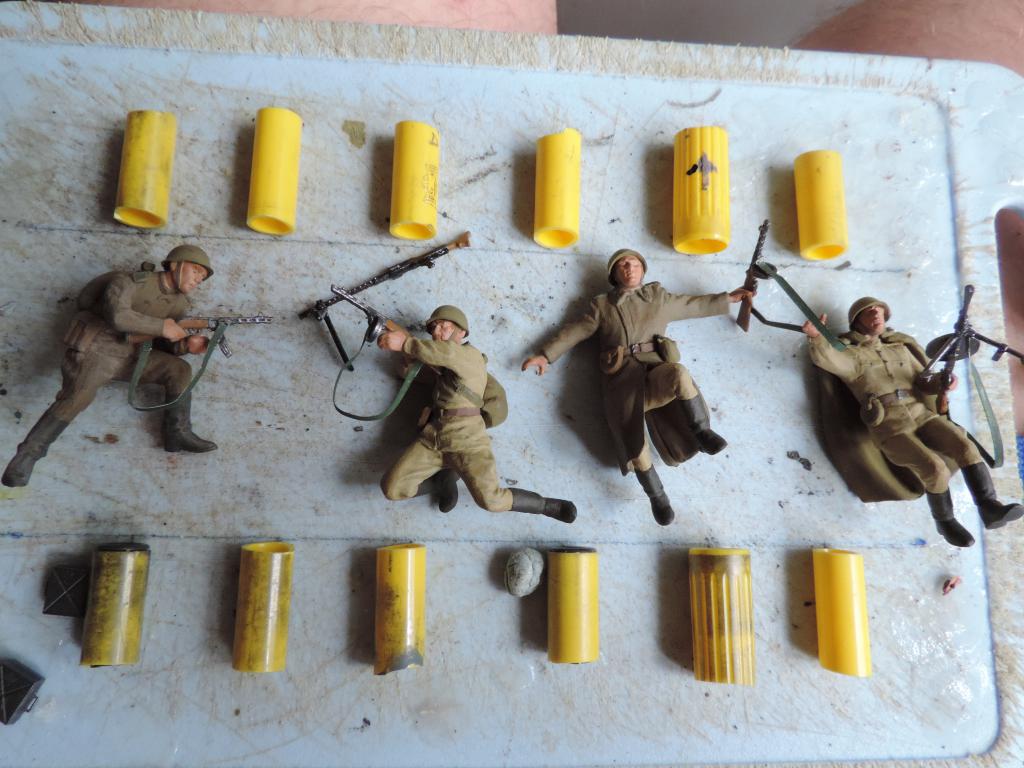 Работа над диорамой постепенно продвигается, но, поскольку новых идей и технологий там не наблюдается, отчитываюсь редко. На данный момент покрашены и расставлены в окопы немцы, добавлена почва к окопам и к воронке и поставлена в окопчик подбитая пушка. Почву для подсыпки к окопам и в воронку делал из засохшей и размельчённой смеси грунтовки, ПВА, кофе и чая, которая осталась от покрытия основы. Ещё покрасил и подготовил к установке в диораму красноармейцев. Это набор от "Звезды" - "Советский танковый десант".