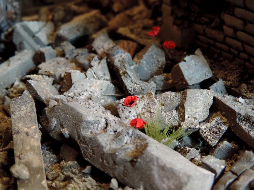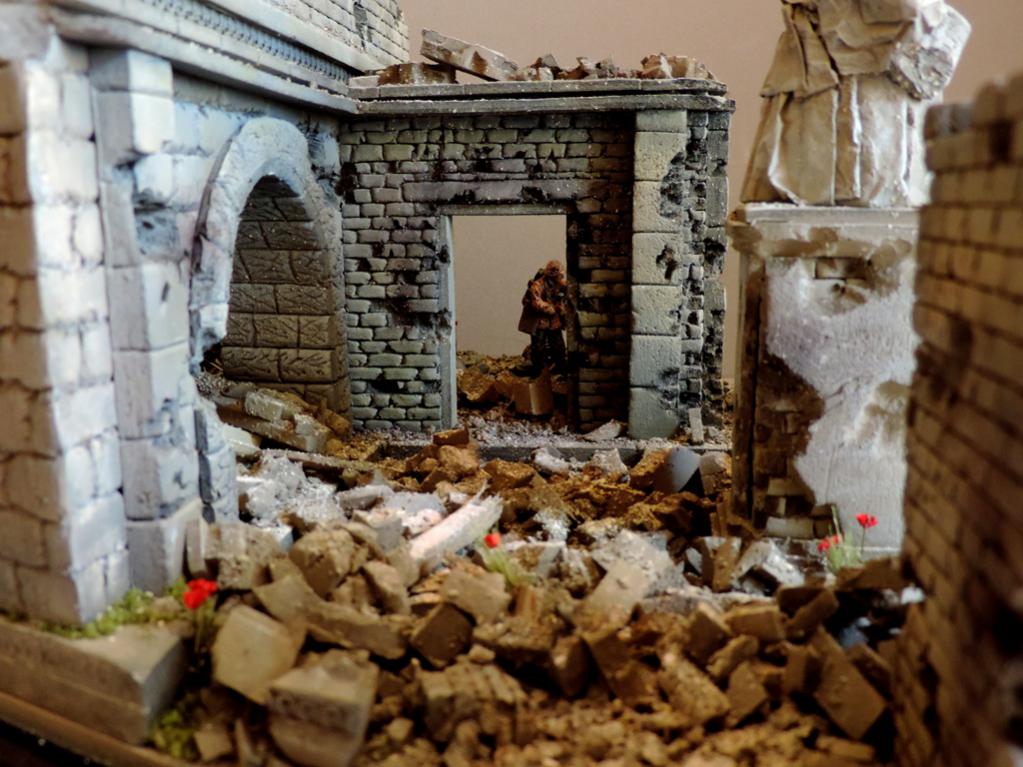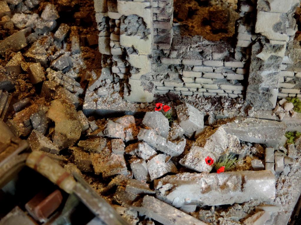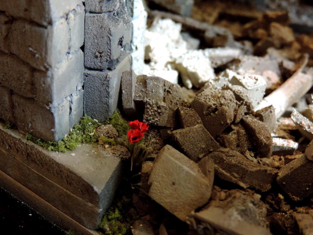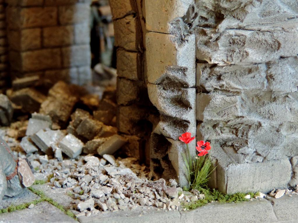 Основание, архитектура и каменюки сделаны из гипса и пенополистирола. Цветы из обыкновенной бумаги для принтера, покрашенной в красный цвет. Трава – сантехнический лён. Вроде всё. Приятного просмотра.