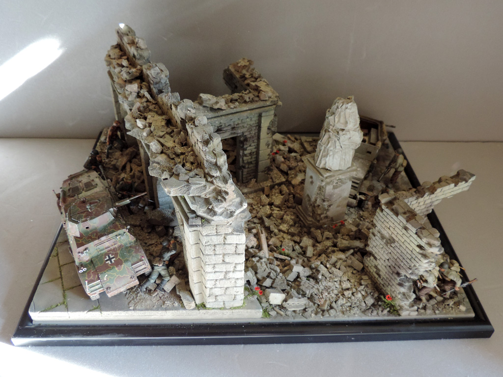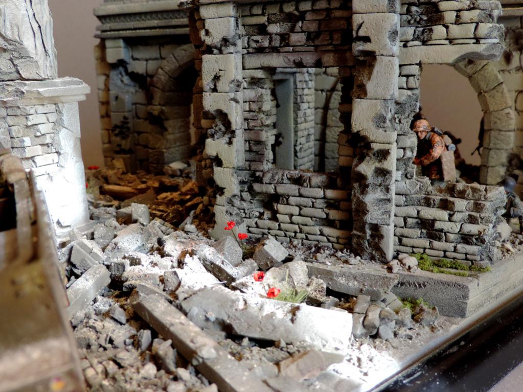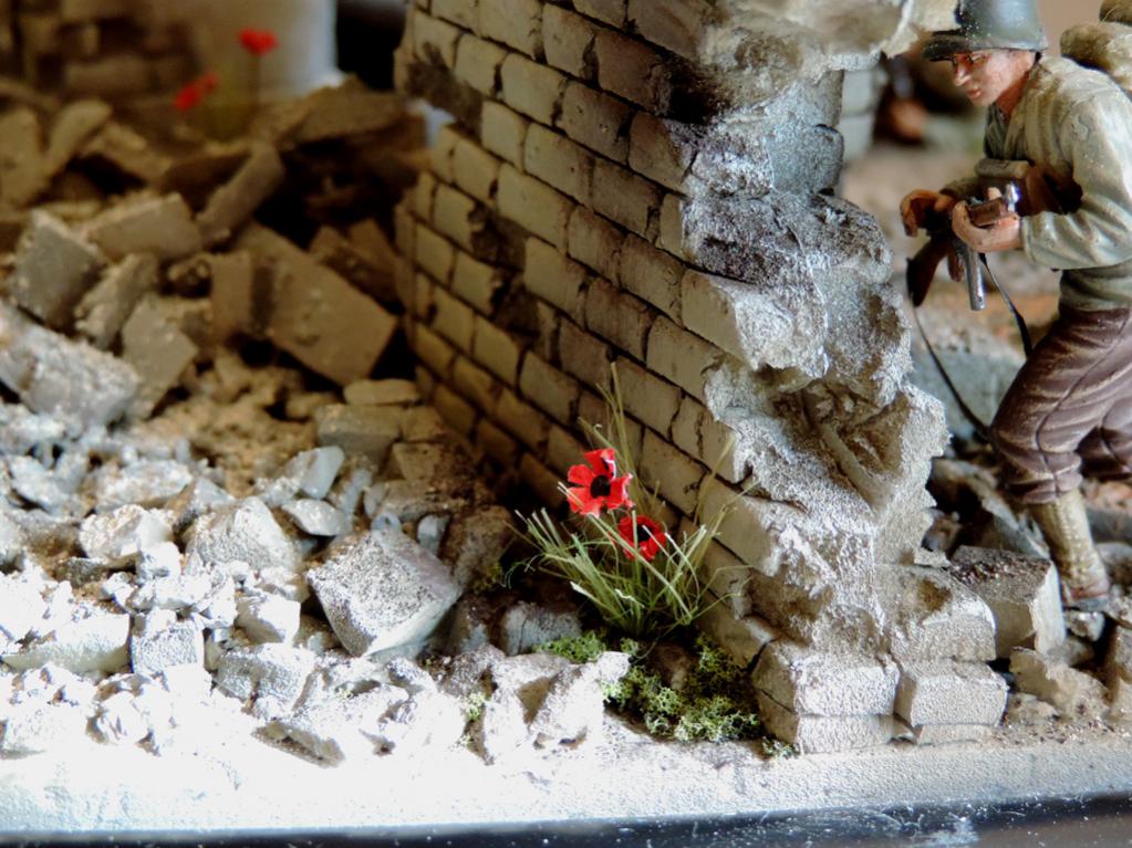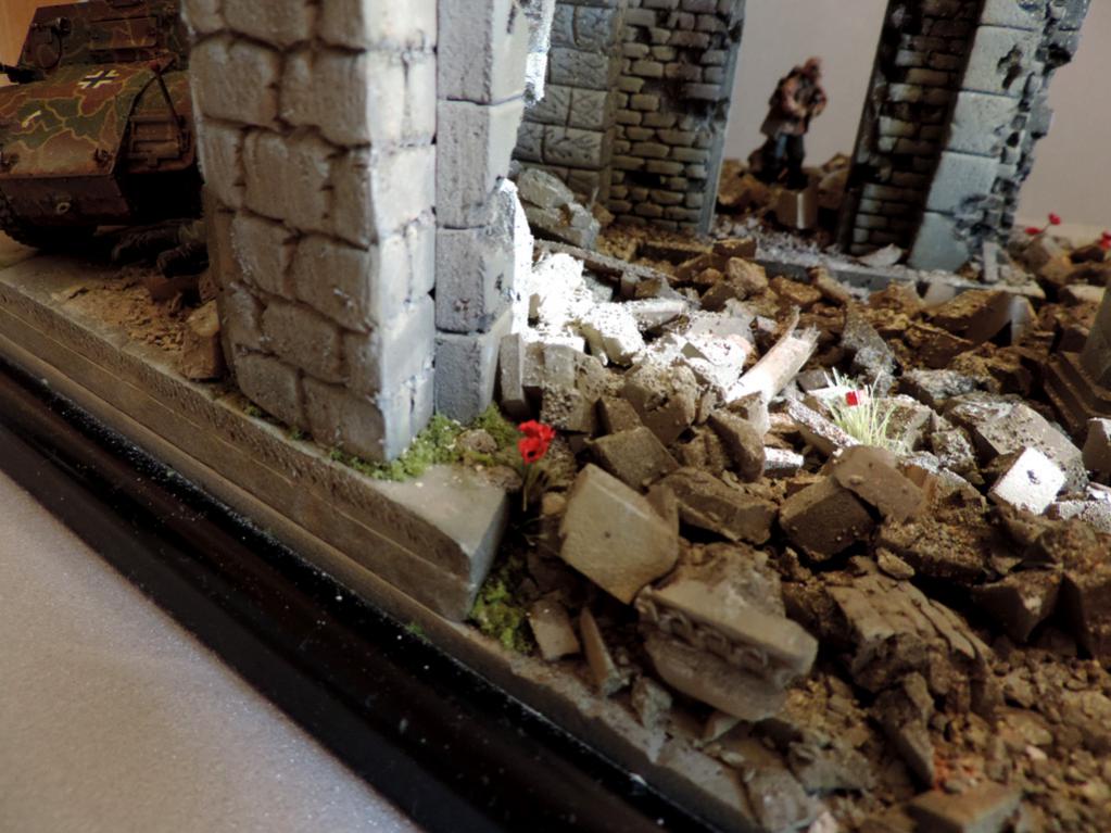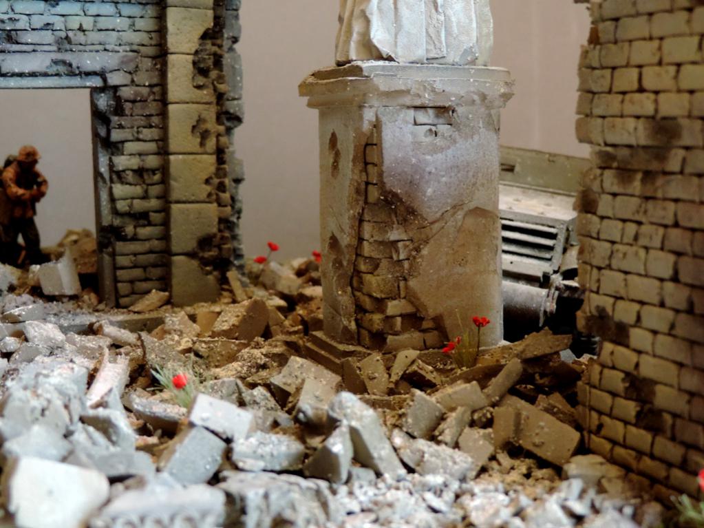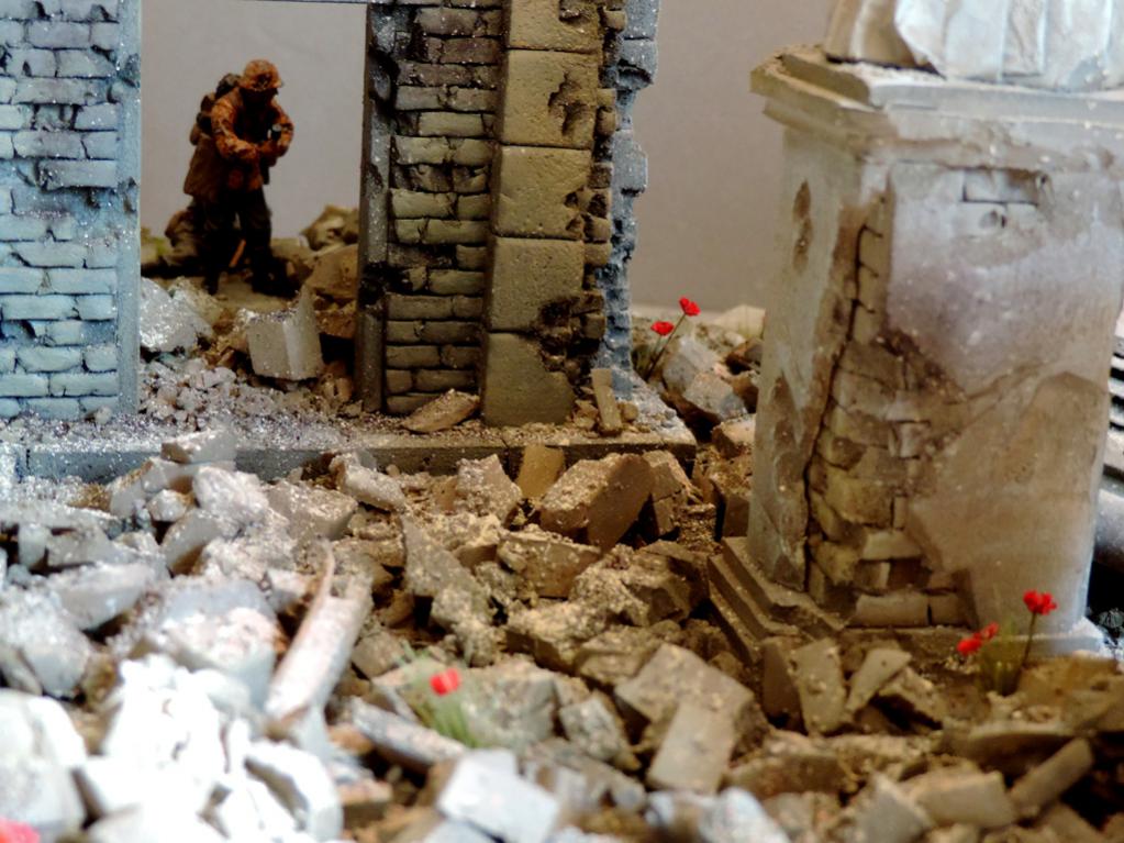 Основание, архитектура и каменюки сделаны из гипса и пенополистирола. Цветы из обыкновенной бумаги для принтера, покрашенной в красный цвет. Трава – сантехнический лён. Вроде всё. Приятного просмотра.