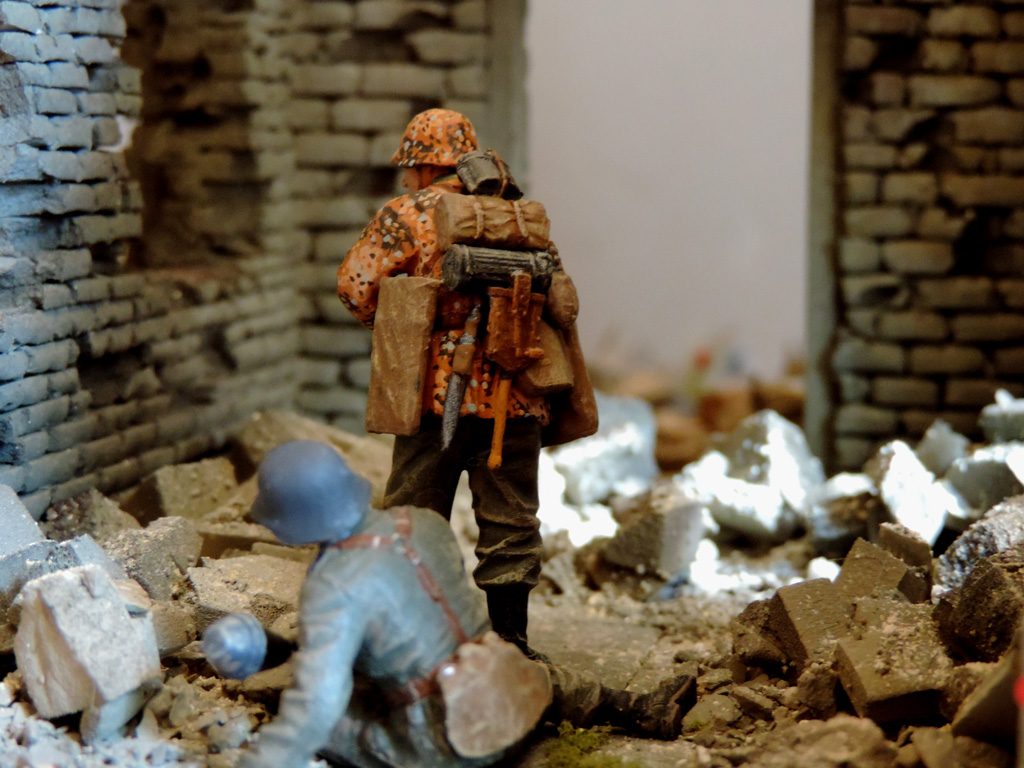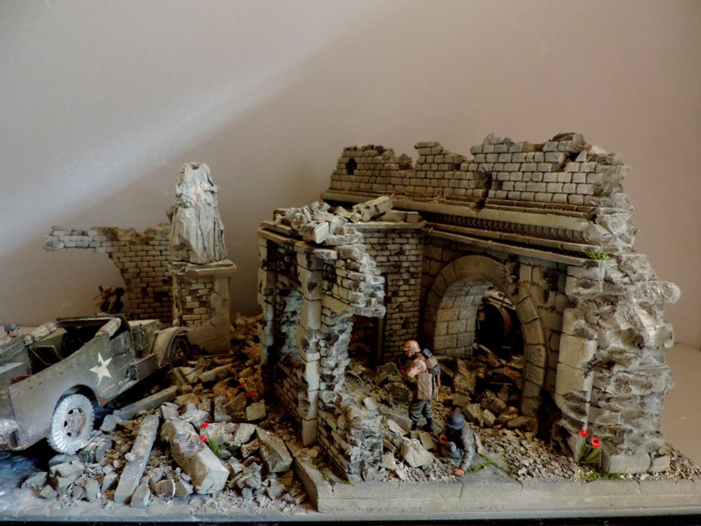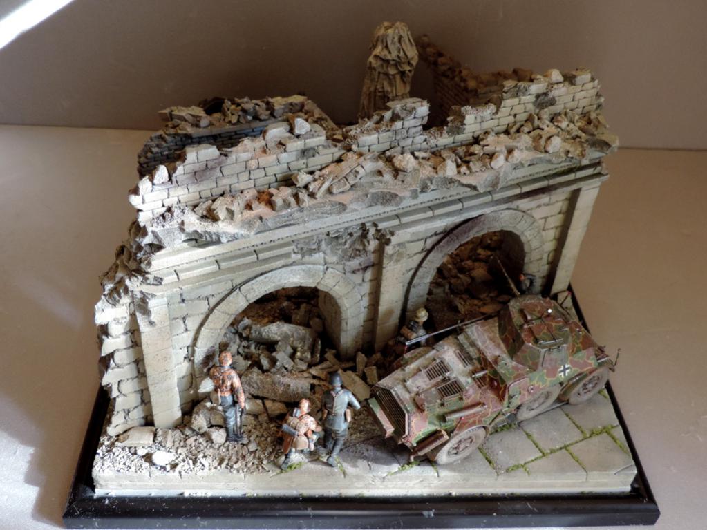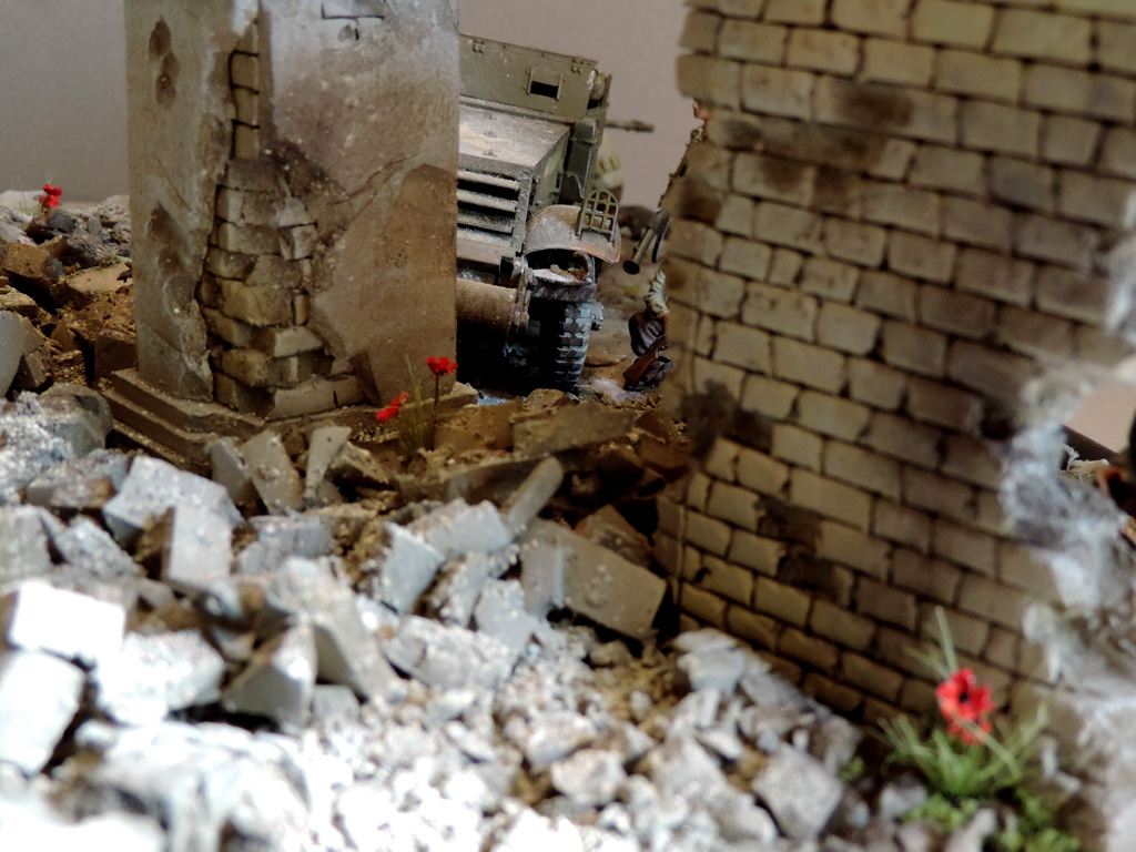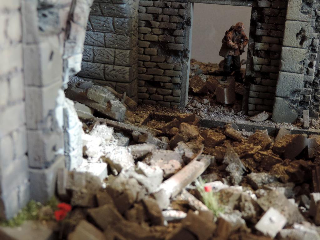 Основание, архитектура и каменюки сделаны из гипса и пенополистирола. Цветы из обыкновенной бумаги для принтера, покрашенной в красный цвет. Трава – сантехнический лён. Вроде всё. Приятного просмотра.