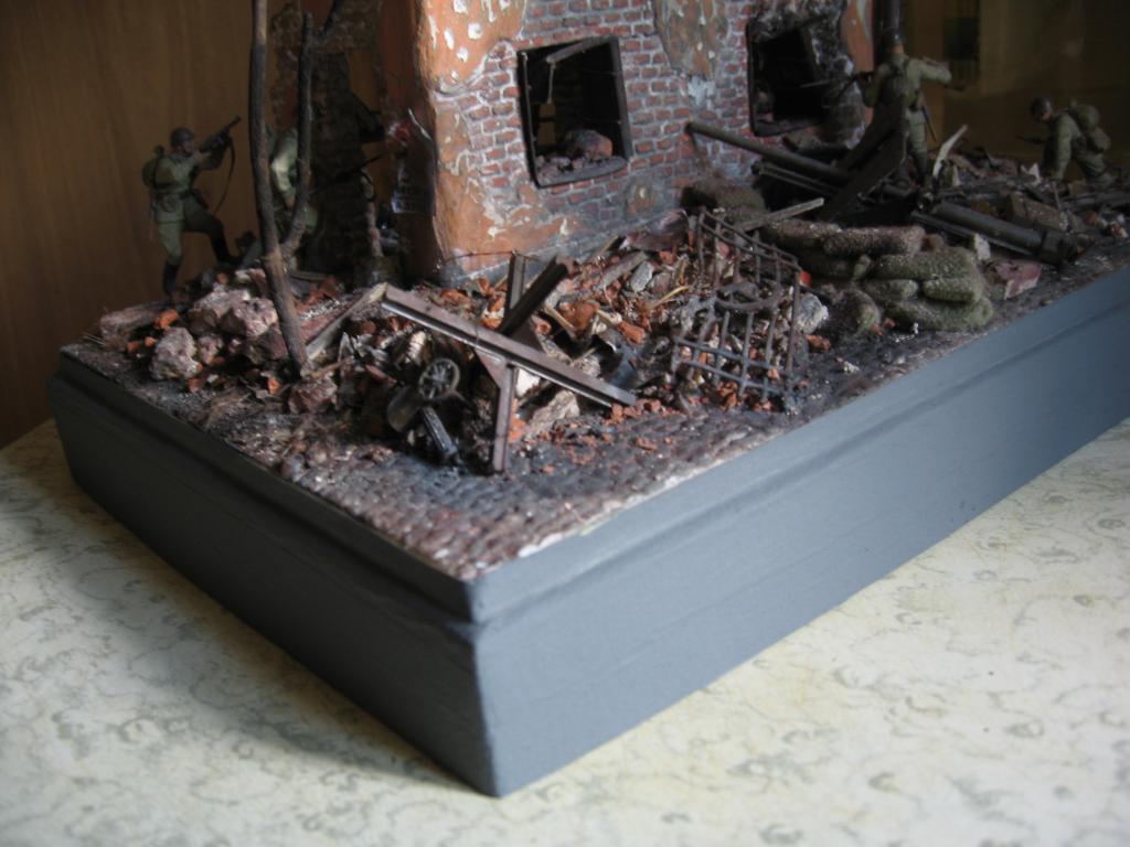Попытался прибавить маскировки в окнах немецким снайперам и бросил несколько снарядных гильз возле пушки. Гильзы покрасил сначала цветом латуни, потом сверху добавил ржавчины и пигменнтной пыли.
