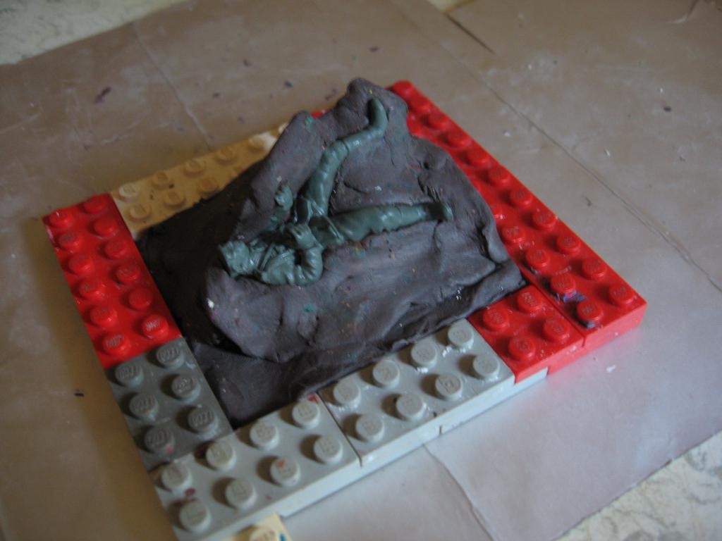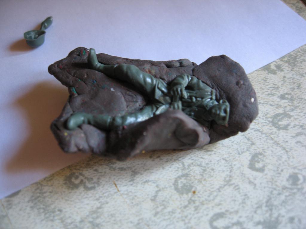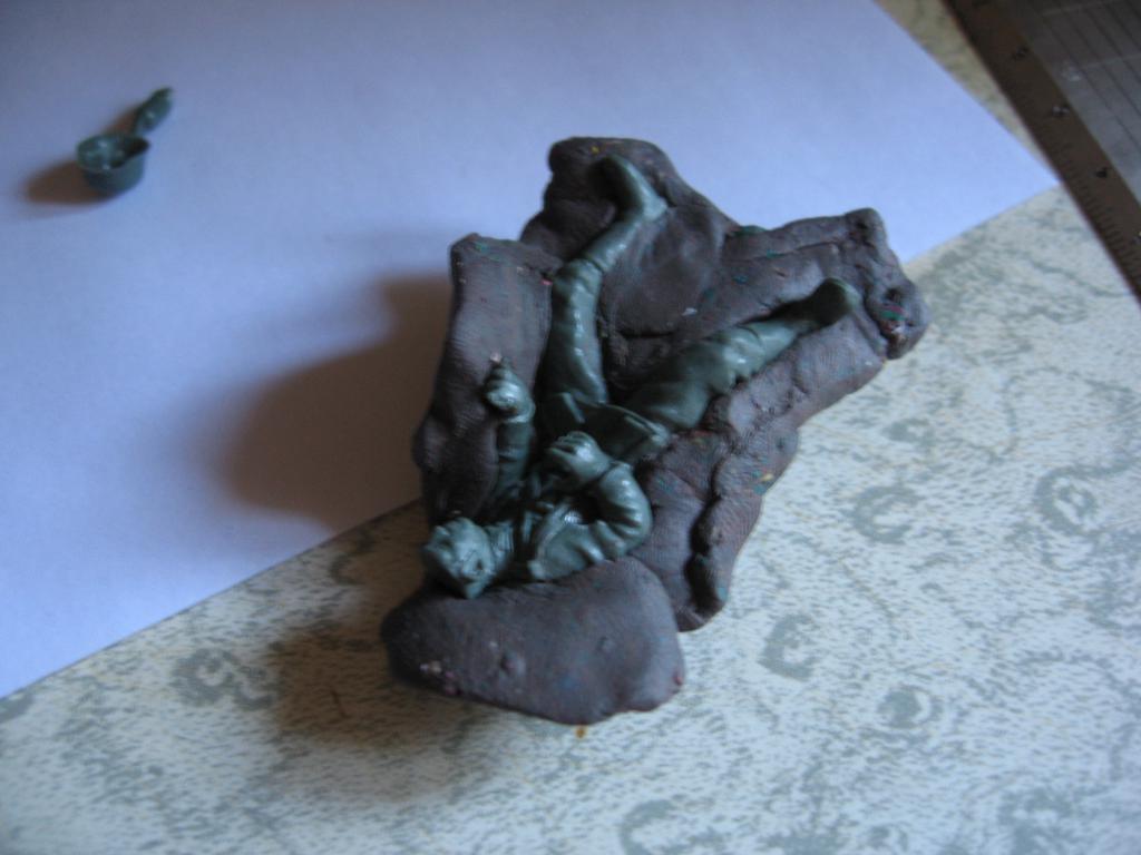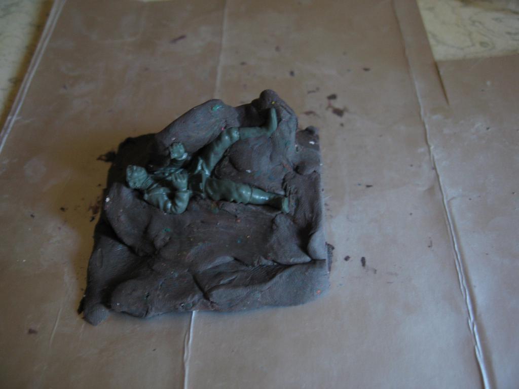 Настала очередь какой-то рамки. Посчитав, что диорама - не картина, вместо рамки сделал основание из крышки от обувной коробки и раскрасил цветами советского камуфляжа армейской разведки - коричневые "амёбы" на светло-зелёном или защитном поле. Очень надеюсь, что завтра закончу всю работу и произведу фотосессию. Остались, в принципе, мелочи вроде пыли, грязи и кирпичей. Пошёл спать.