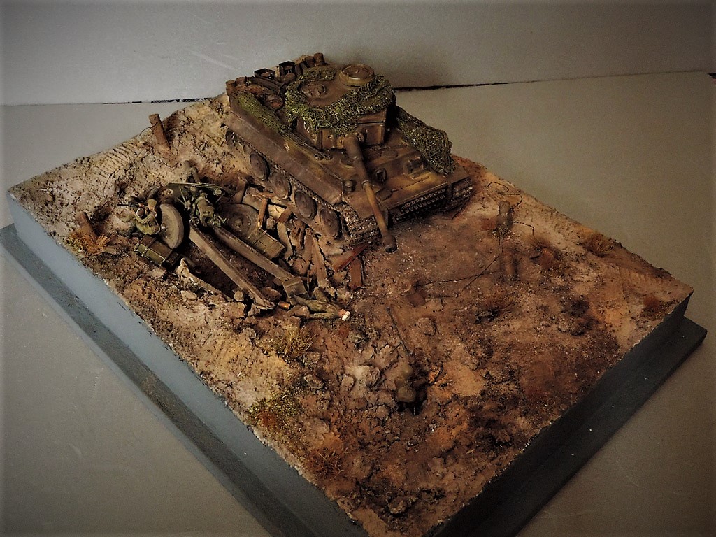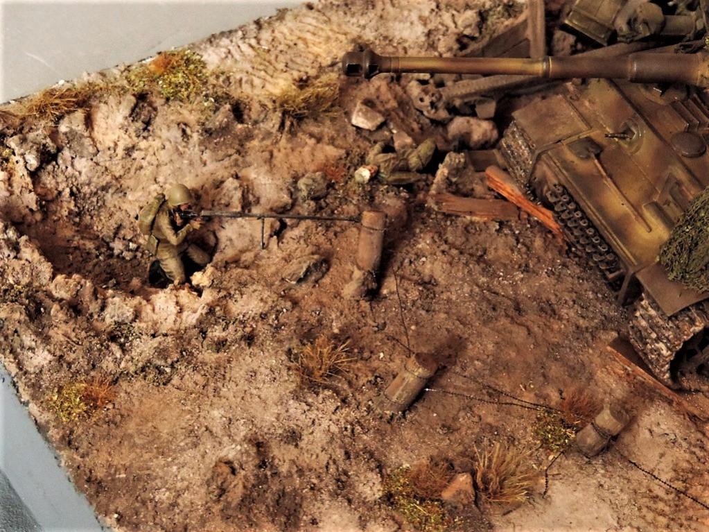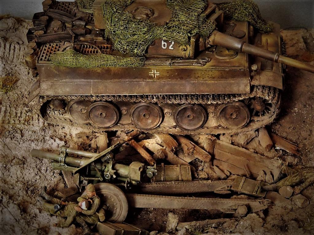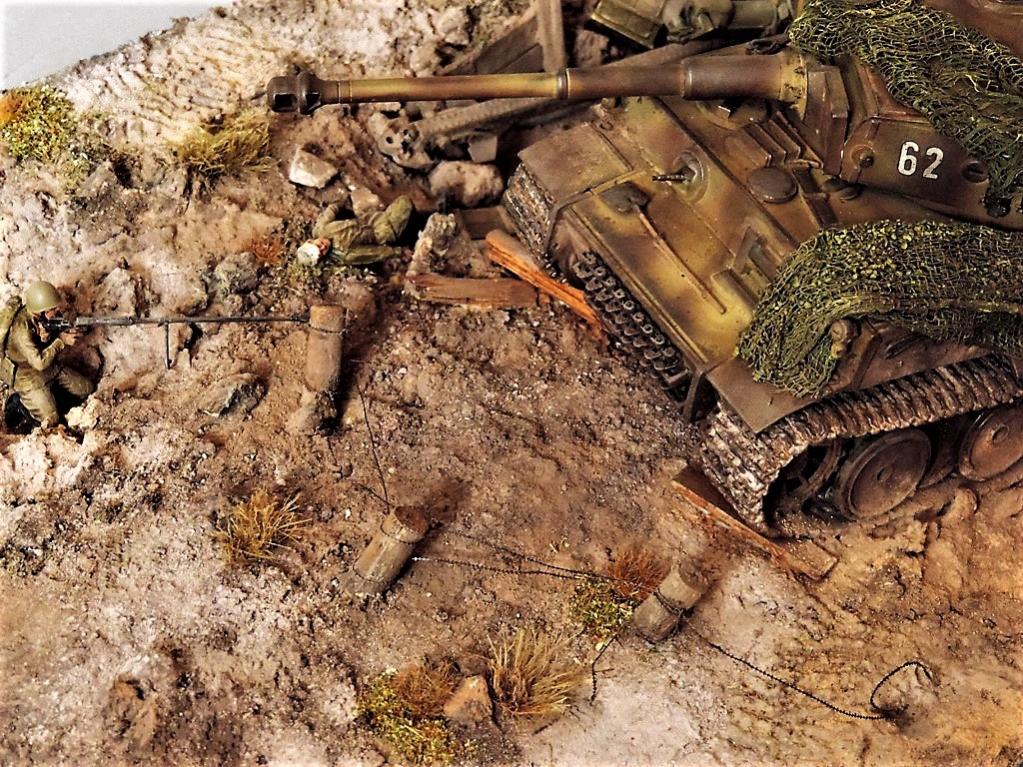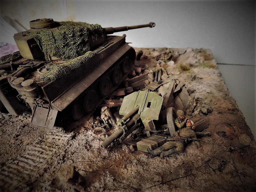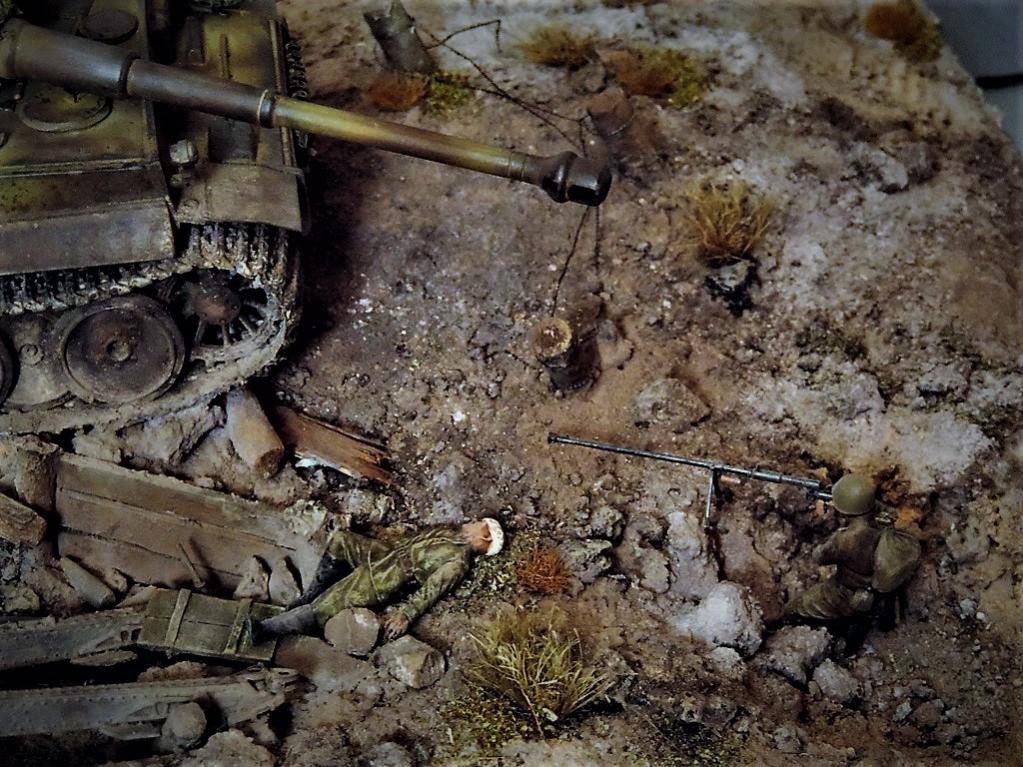 Это верно, Тигра из ПТР не убить и поэтому всё отдаёт большой фантастикой, но история создания диорамы такова: стоял на полке танк, собранный детьми 15 лет назад. Собран был так качественно, что его пришлось переламывать и перетачивать, чтобы привести в какой-то более-менее нормальный вид. А потом стал думать, что можно изобразить с таким танком. Ничего лучшего не придумалось. Получилось "По мотивам фильма". Ну, как-то так...