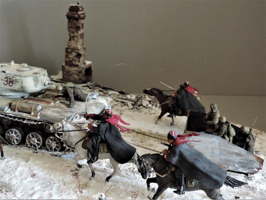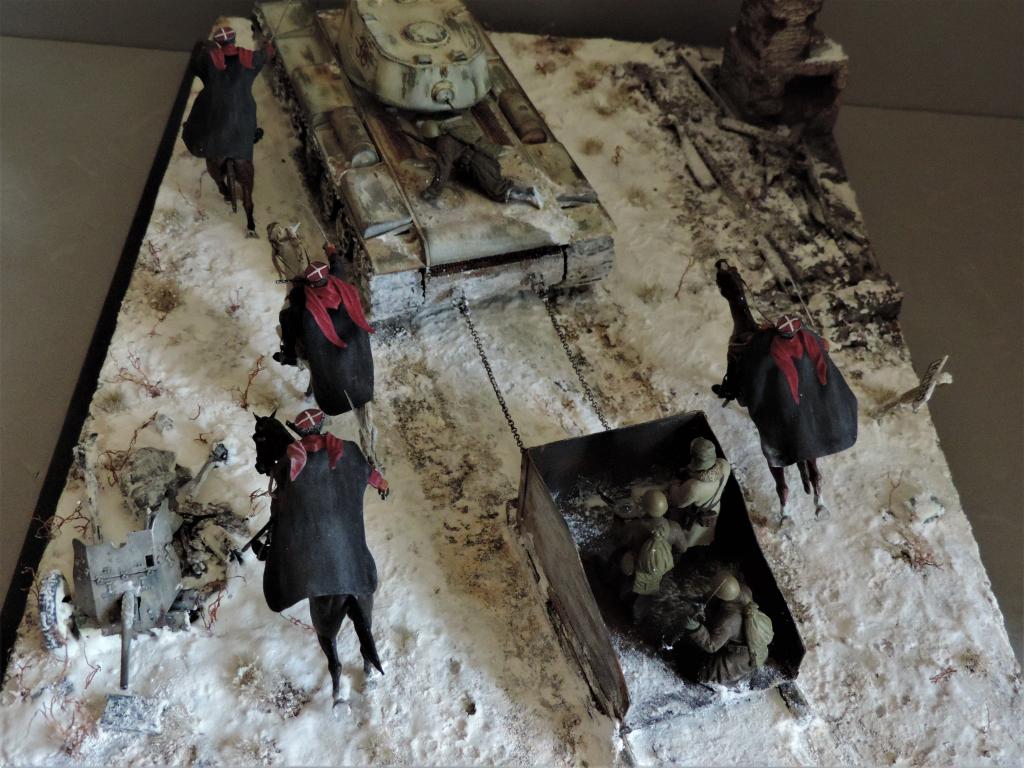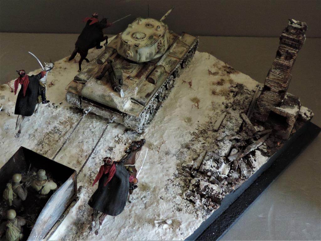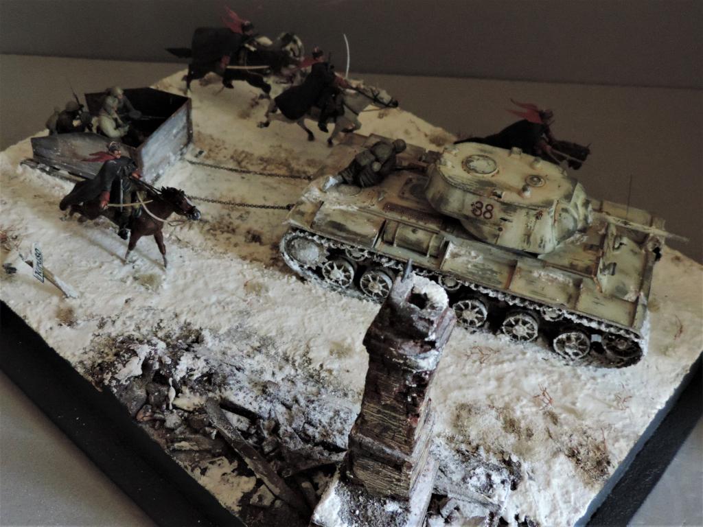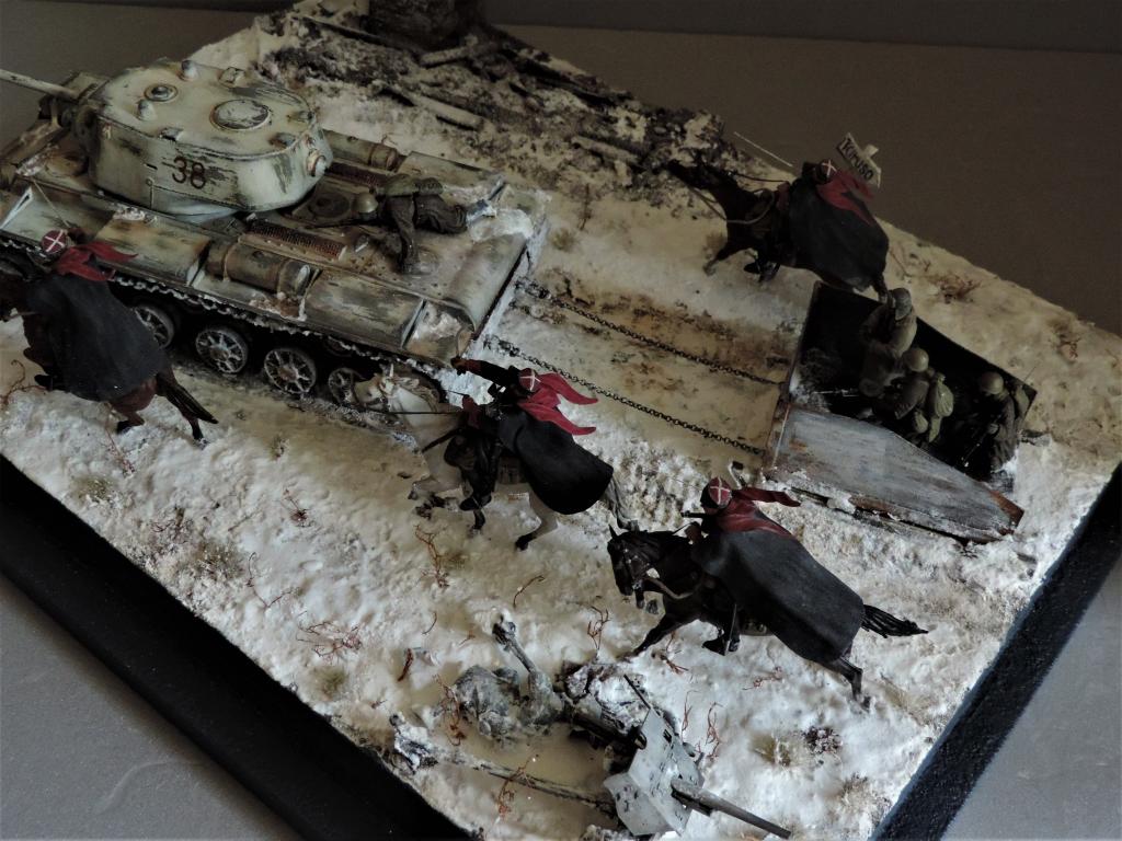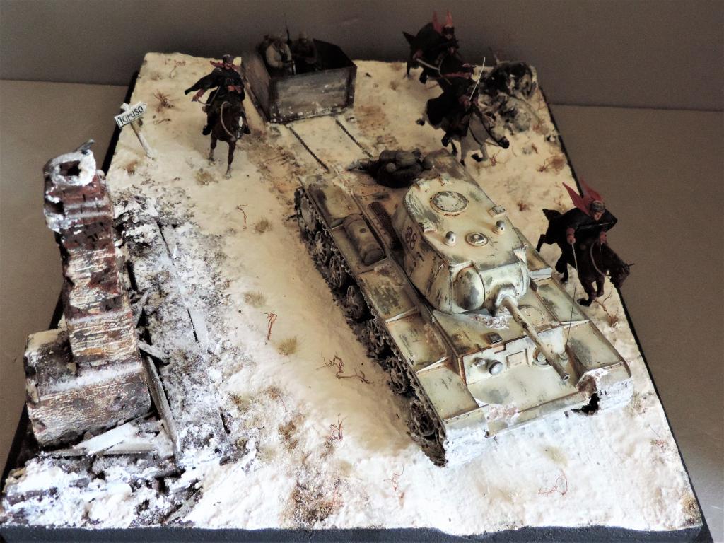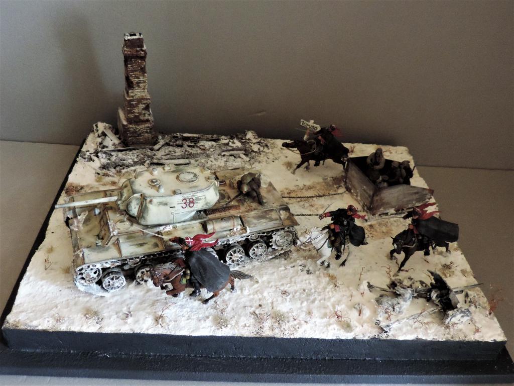 Снова всем привет. Нашлось время для постройки ещё одной диорамы. В качестве названия выбрал строчку из песни "На врага, за Родину, вперёд!". Постарался отобразить фрагмент контрнаступления Красной Армии зимой 1941-1942 года. На место действия показывает дорожный указатель - где-то в районе Тарусы, Калуги, Малоярославца. Стройка диорамы производилась в Групп-билде на страницах контактной группы "Modellers of Fortune". Если кому-то интересно, прилагаю адрес: https://vk.com/topic-79532563_35285772. В-общем, прошу к просмотру.Чуть не забыл. Сзади к танку прицеплена броневолокуша - популярное приспособление, широко используемое при нехватке бронетранспортёров.