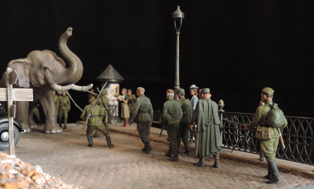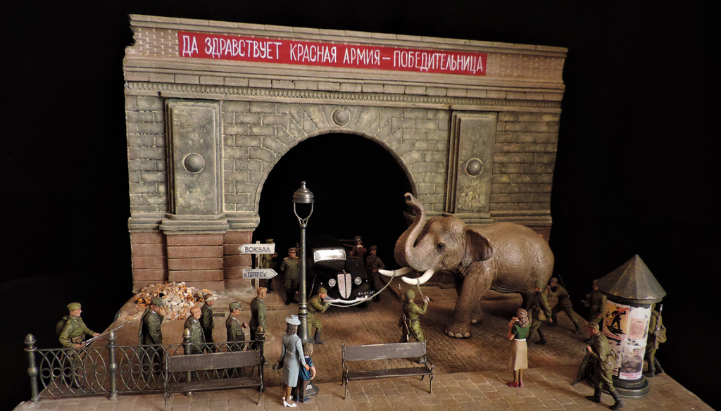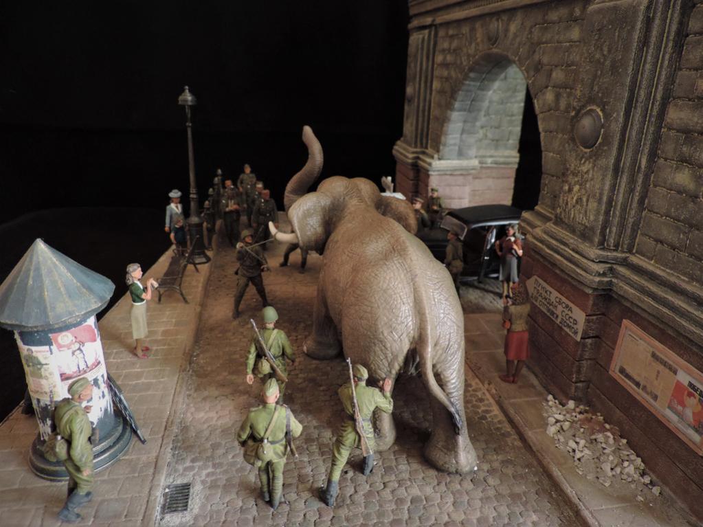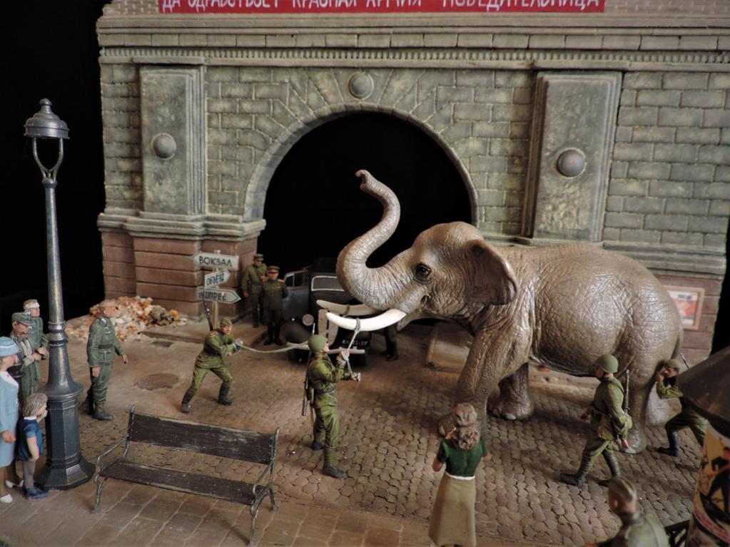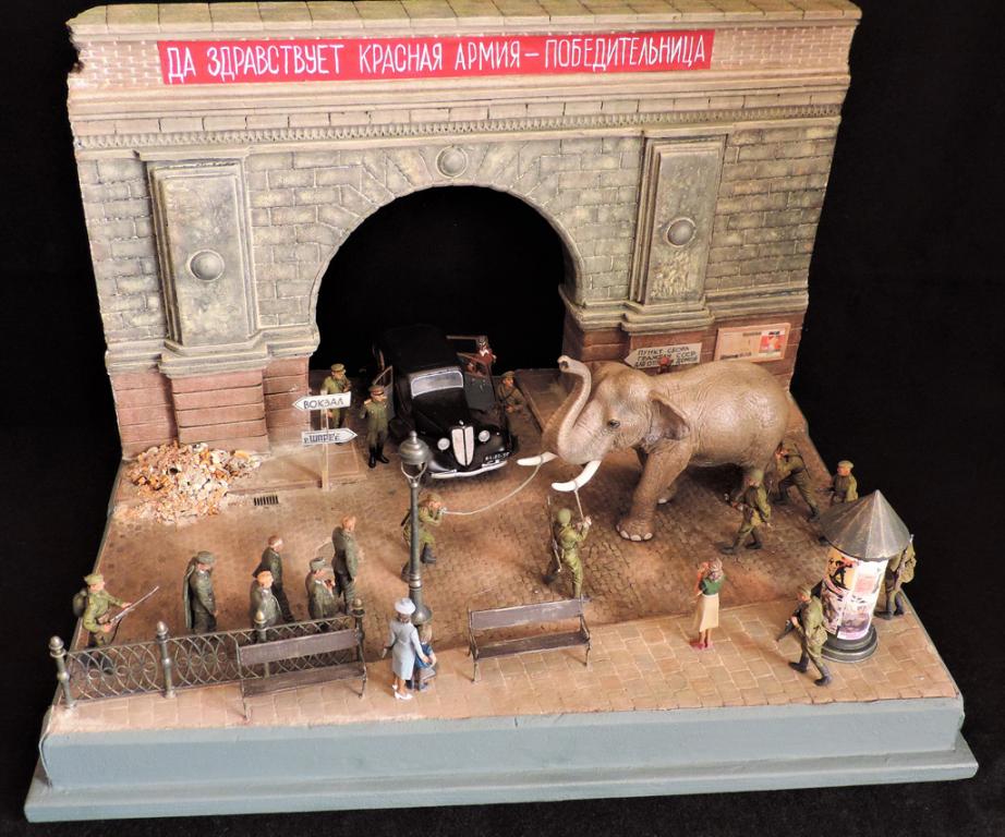 Прошёл год. Прошу простить, что за это время не отчитывался о своих работах. Их за год построено целых ПЯТЬ.Сегодня постараюсь всё восполнить. Сначала покажу диораму, которая построена по мотивам фильмов "Солдат и слон" и "На пути в Берлин". Сюжет простой - советские солдаты освободили нашего слона, которого немцы вывезли из советского зоопарка из оккупированного города. Слона ведут к вокзалу. По дороге встретилась группа пленных немцев, на которых слон рассердился за своё интернирование. Приятного просмотра. Сейчас сбегаю на работу, потом загружу ещё четыре диорамы.