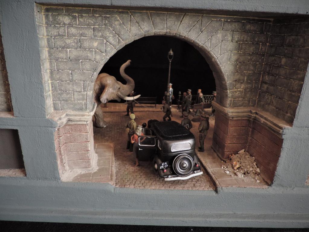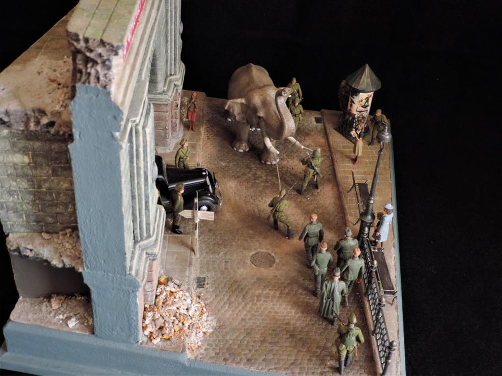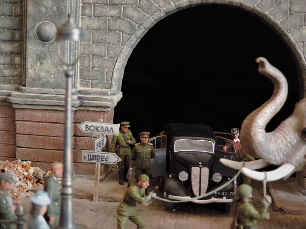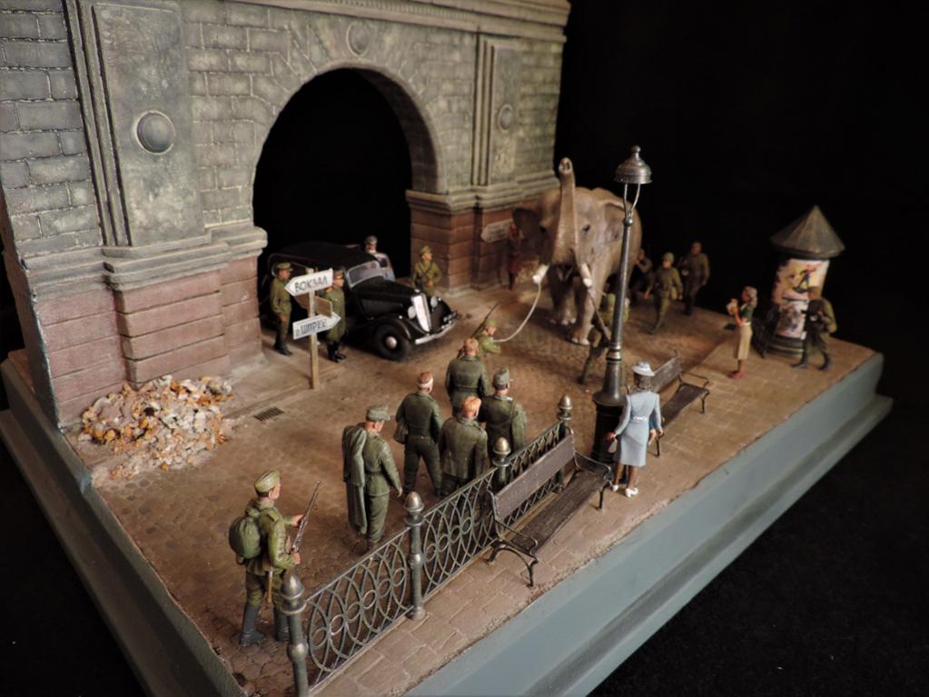 Прошёл год. Прошу простить, что за это время не отчитывался о своих работах. Их за год построено целых ПЯТЬ.Сегодня постараюсь всё восполнить. Сначала покажу диораму, которая построена по мотивам фильмов "Солдат и слон" и "На пути в Берлин". Сюжет простой - советские солдаты освободили нашего слона, которого немцы вывезли из советского зоопарка из оккупированного города. Слона ведут к вокзалу. По дороге встретилась группа пленных немцев, на которых слон рассердился за своё интернирование. Приятного просмотра. Сейчас сбегаю на работу, потом загружу ещё четыре диорамы.