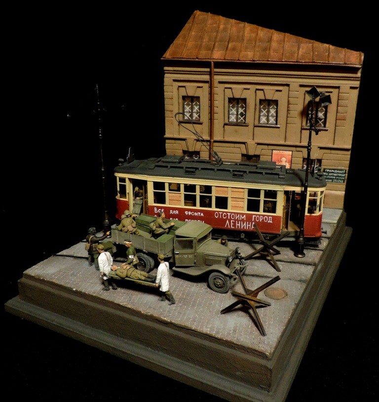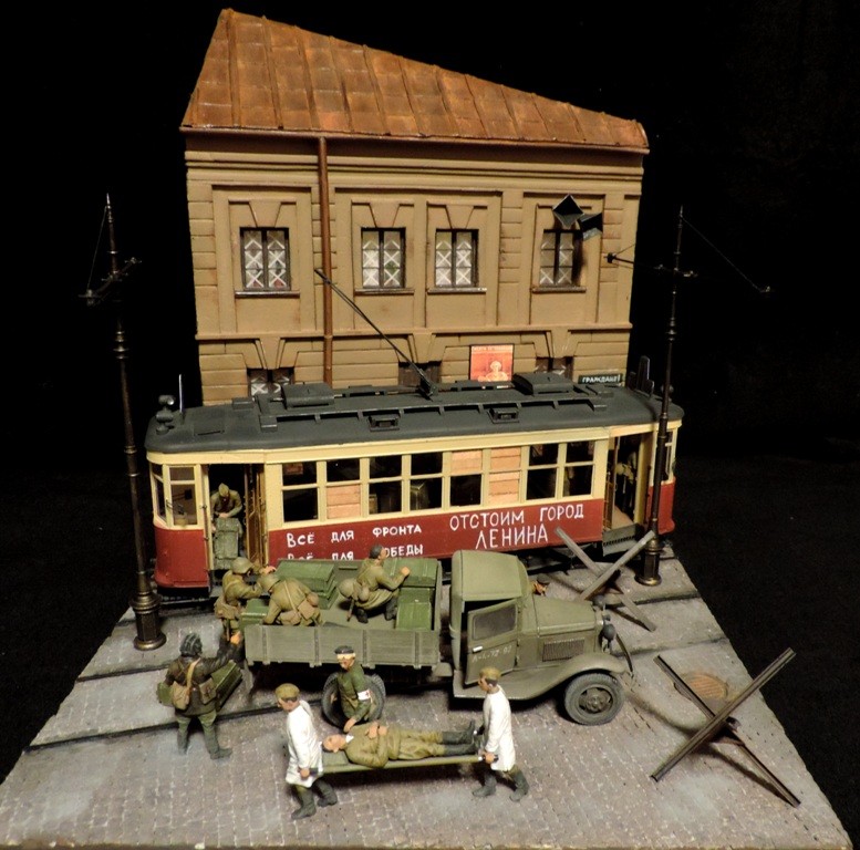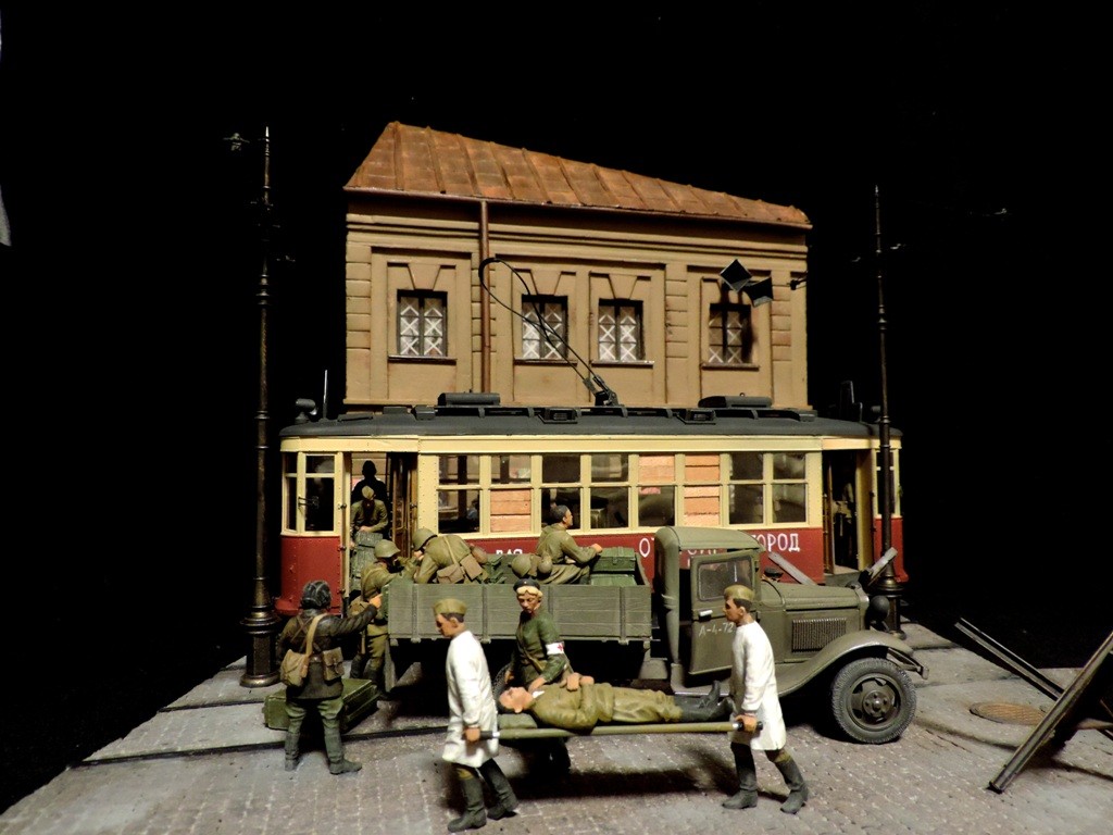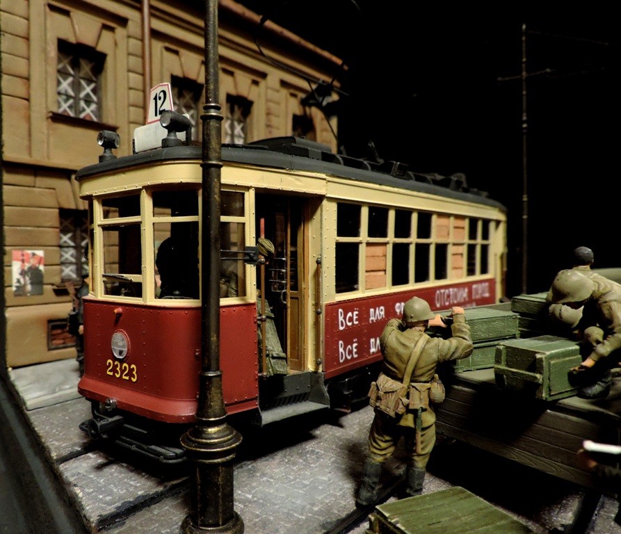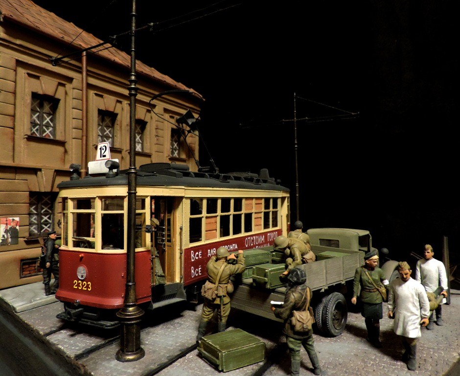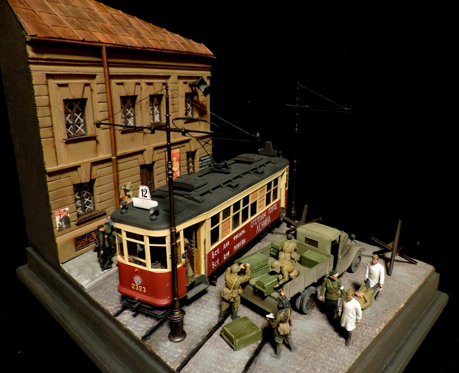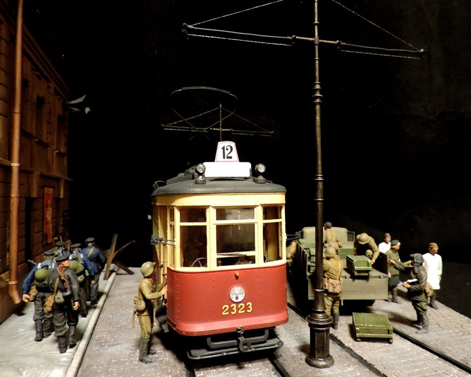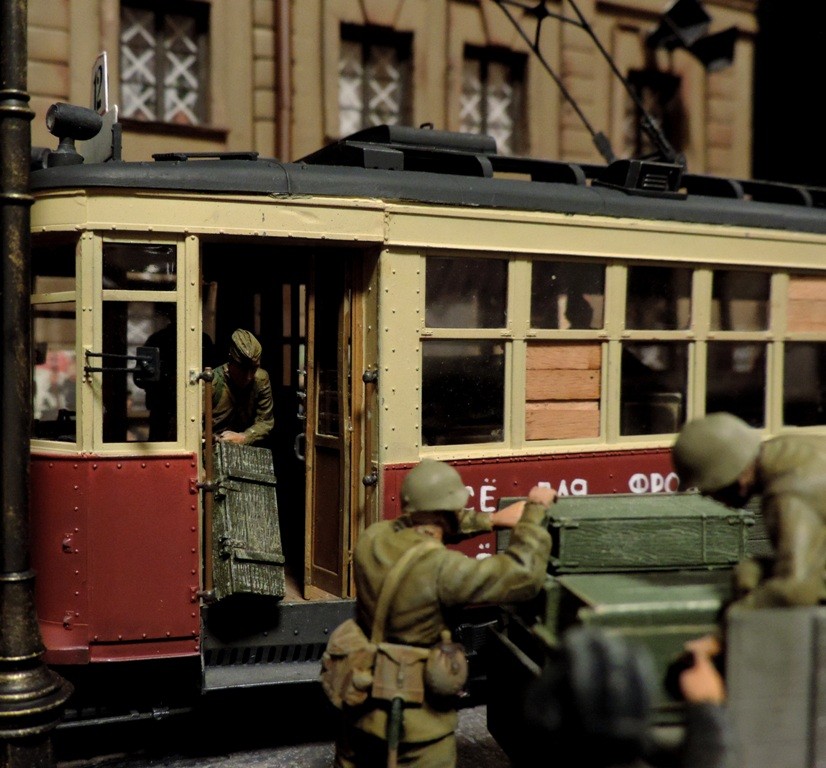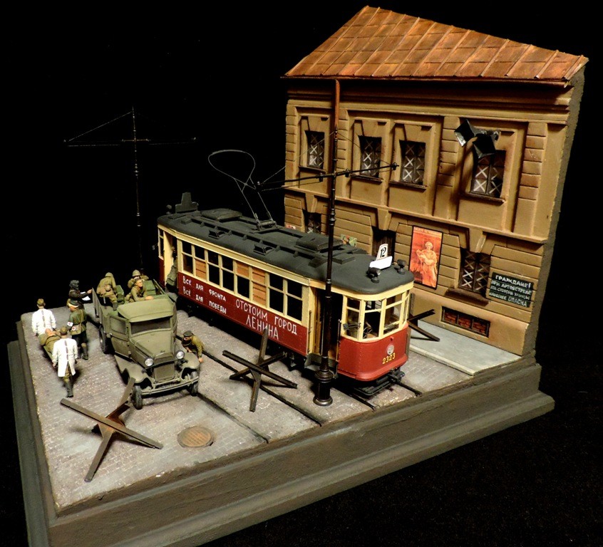 Вроде бы, получилось загрузиться на "радикал". Сейчас постараюсь разместить фотографии. Итак, завершена очередная диорама. Называется "Трамвай идёт на фронт".Посвящена обороне Ленинграда в начальный период войны, когда кольцо блокады ещё не сомкнулось. Название диорамы, идею и сюжет подсказали архивные фотографии и строки стихов Веры Инбер: