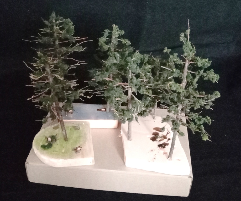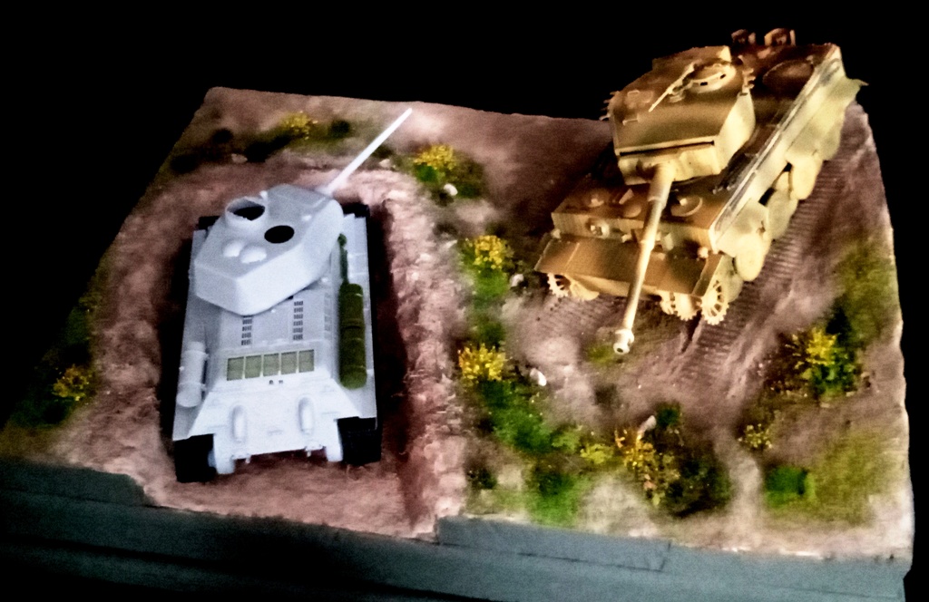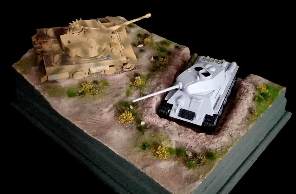 Расскажу о небольших продвижениях в работе над диорамами. К диораме с танковой засадой создан ландшафт, собраны немецкий "Тигр" и наша "Тридцатьчетвёрка" и сделаны шесть сосен, которые также украсят эту работу. Если интересно, из чего сделаны сосны - расскажу. Стволы - палки для суши и старые отработанные кисточки. Ветки - натуральные маленькие ветки от кустов. Листва - прессованный мох, приклеенный на цианкрилатный клей.![]()