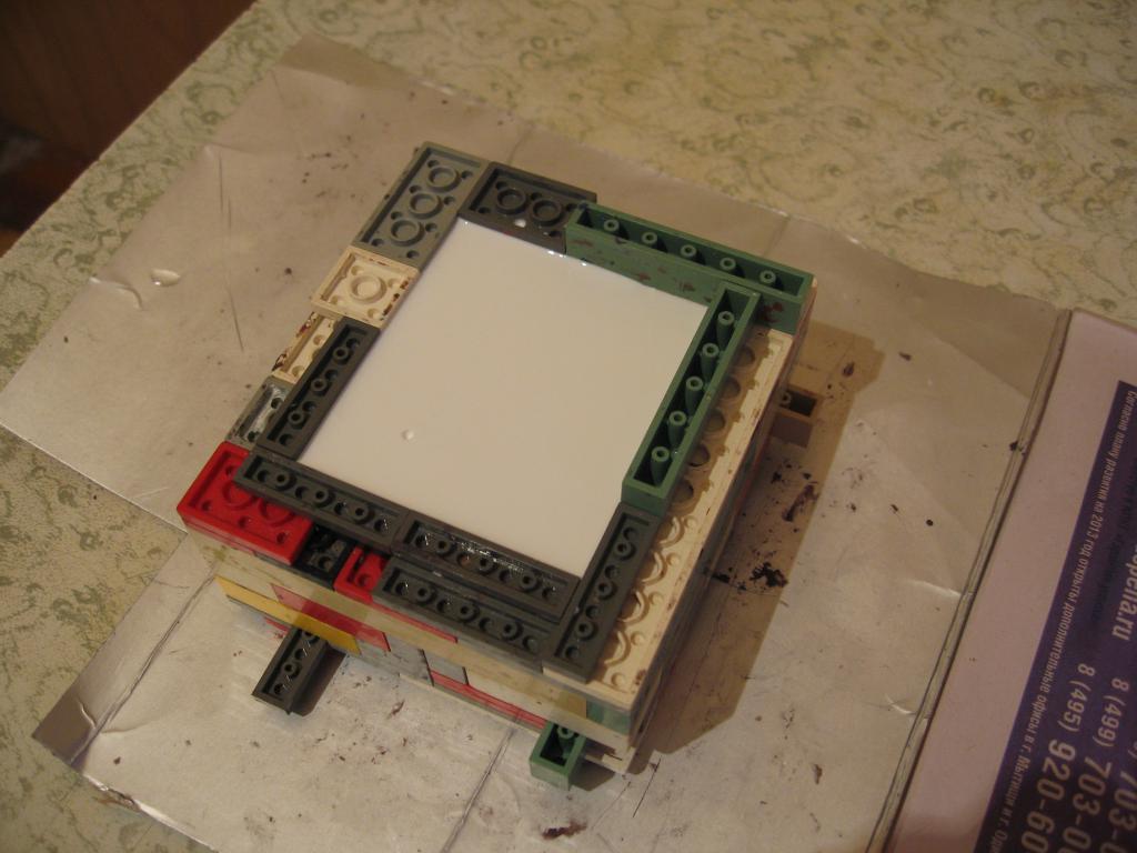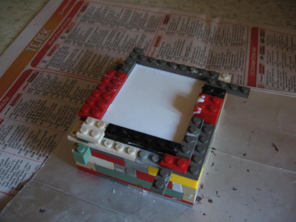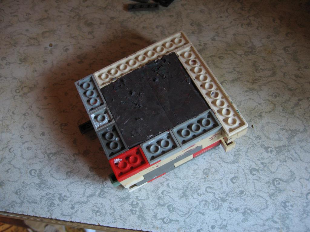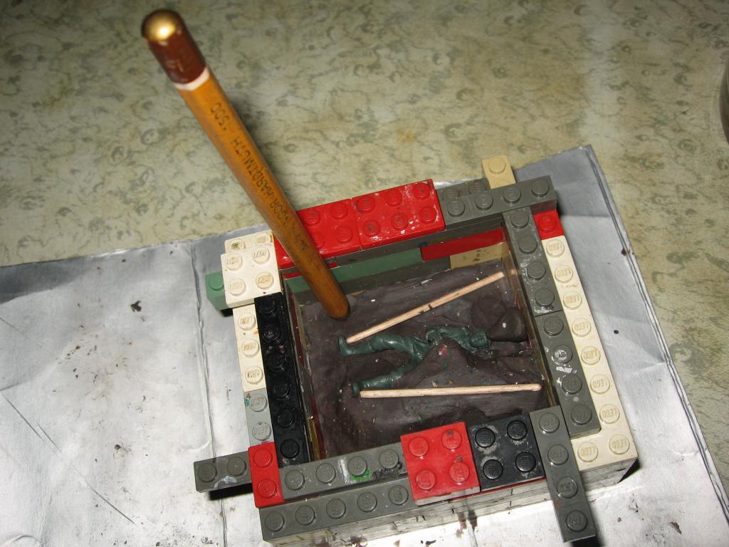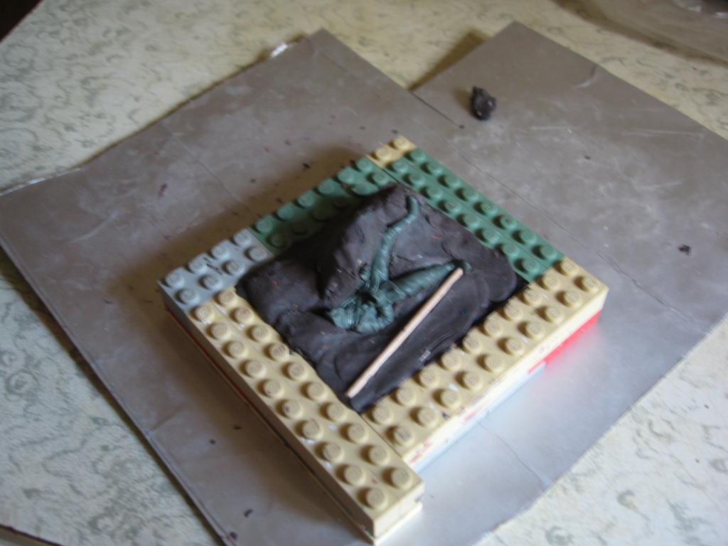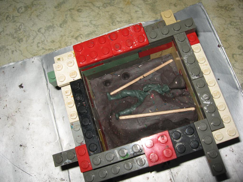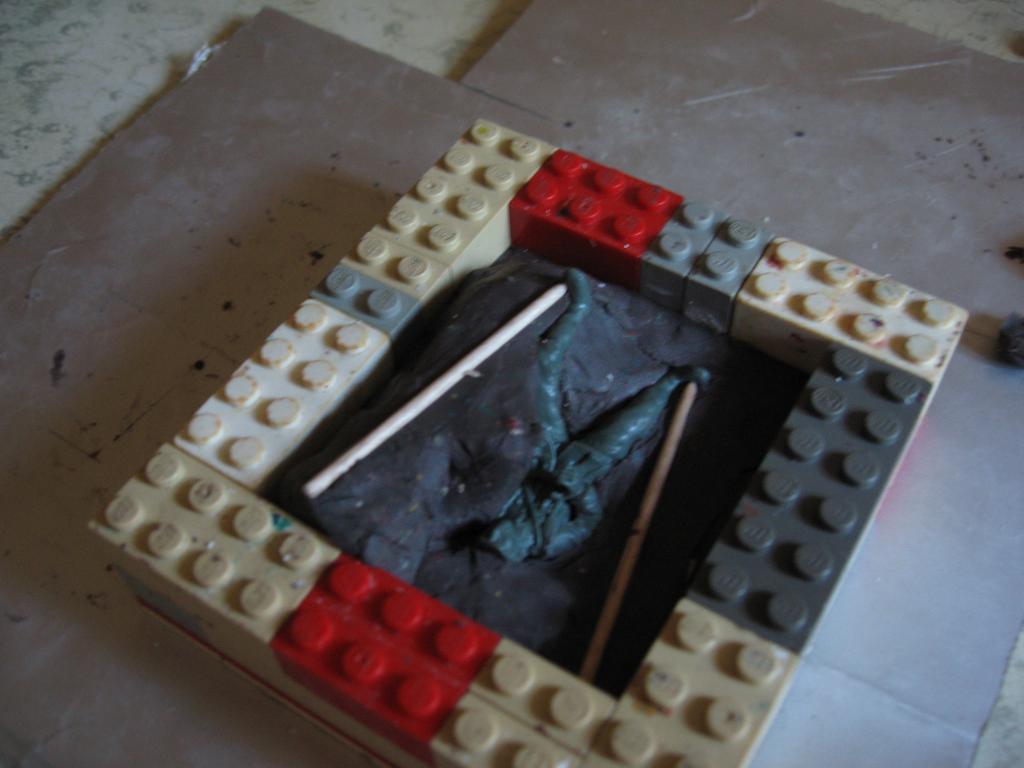 Фигуру в пластилине примазываем к основной пластилиновой лепёшке и всю конструкцию со всех сторон отбортовываем. Лучше всего для бортовки подходит конструктор "Лего". Хотя можно делать борта из того же пластилина, но это дополнительный геморрой.