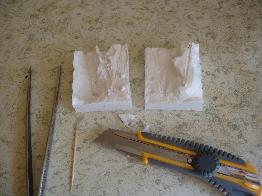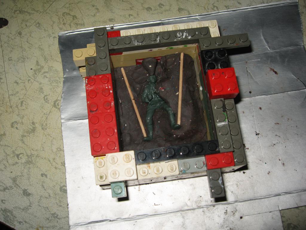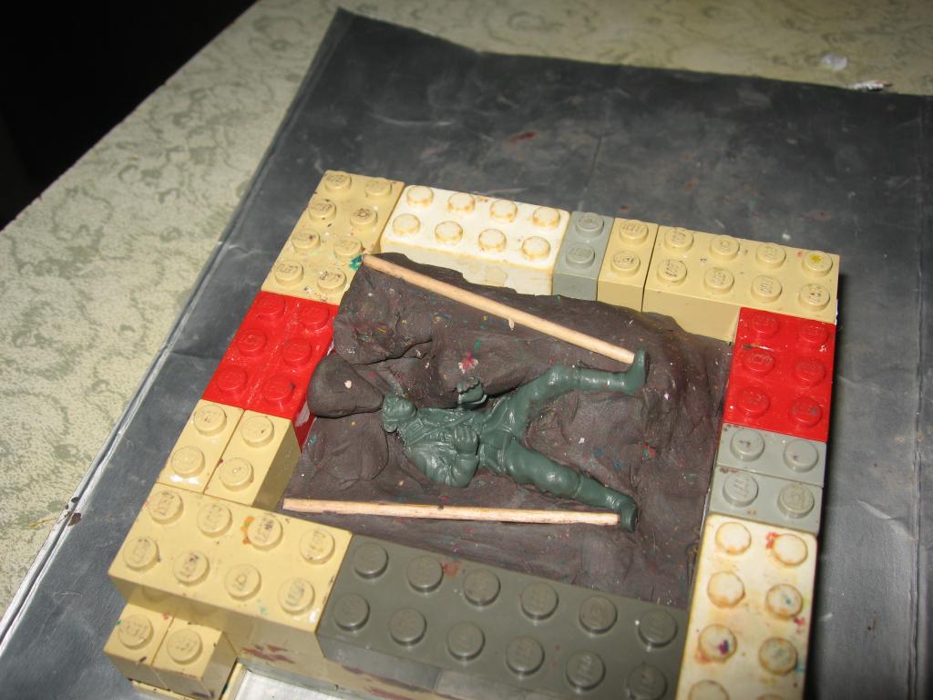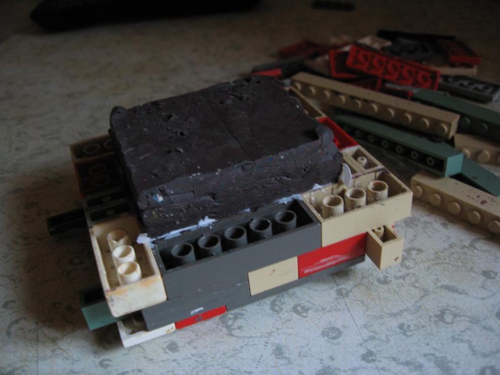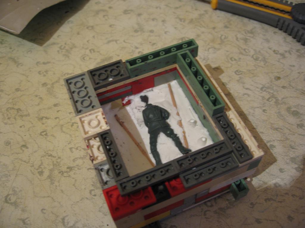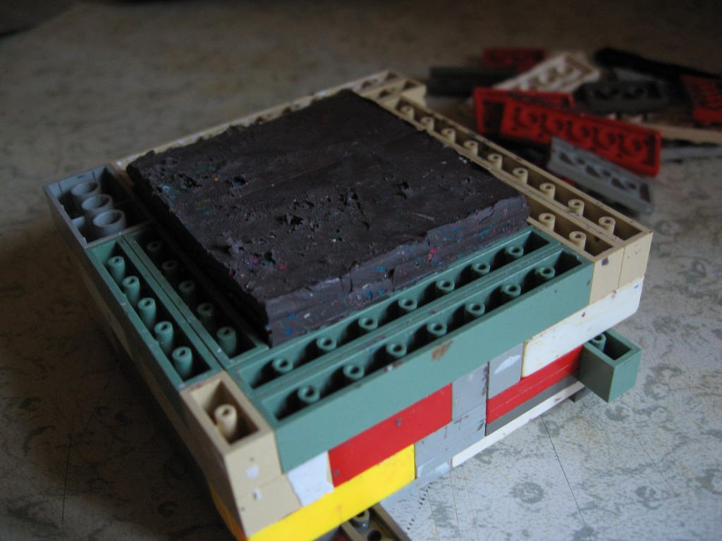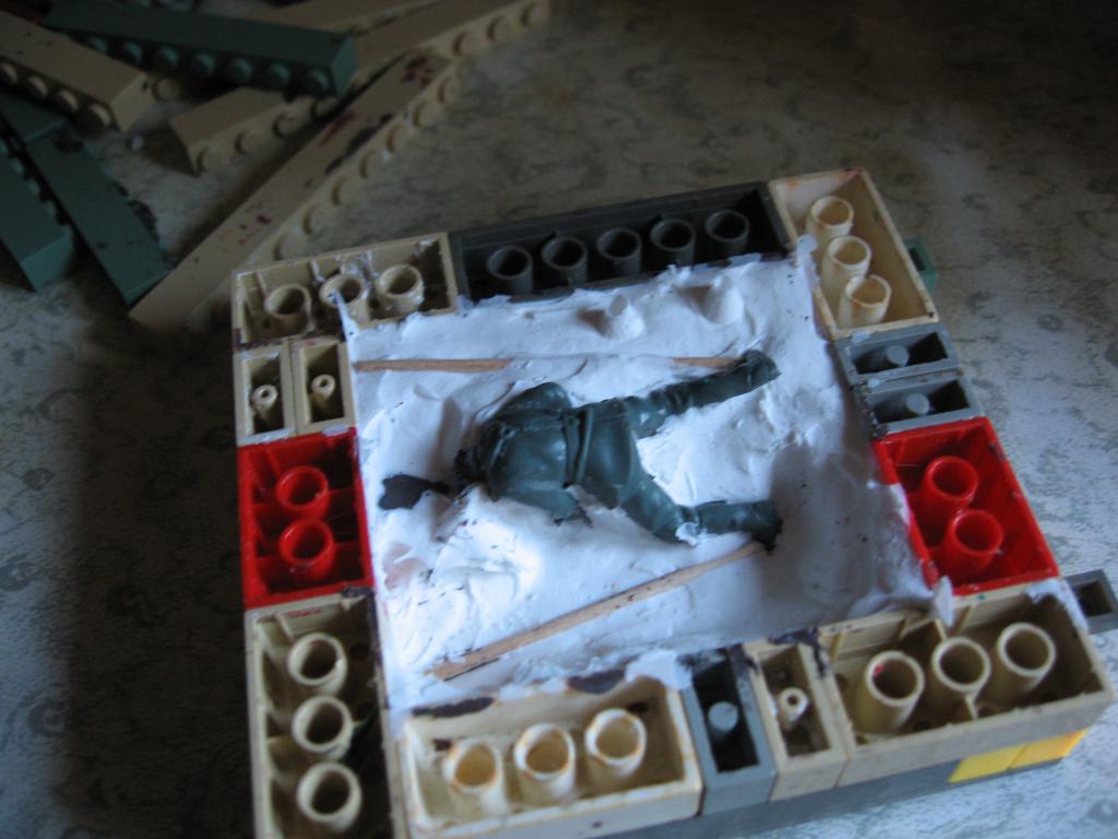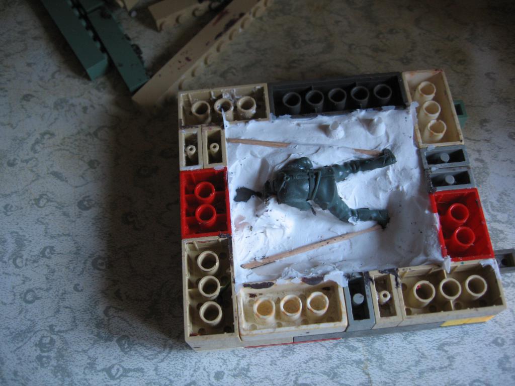 Фигуру в пластилине примазываем к основной пластилиновой лепёшке и всю конструкцию со всех сторон отбортовываем. Лучше всего для бортовки подходит конструктор "Лего". Хотя можно делать борта из того же пластилина, но это дополнительный геморрой.