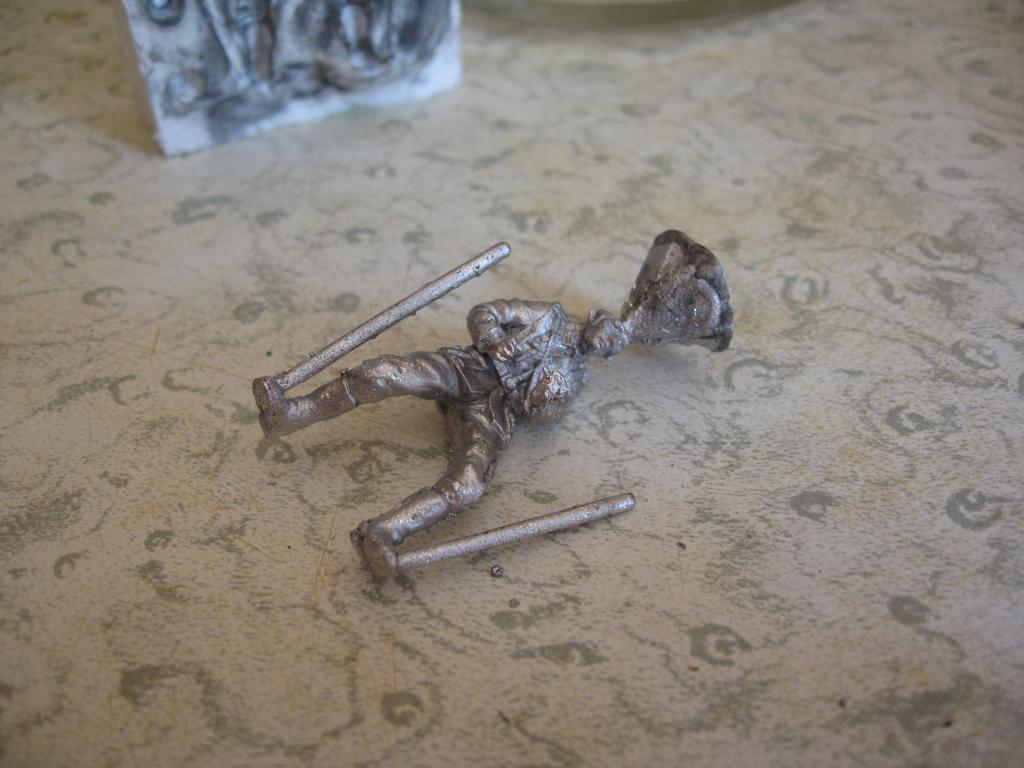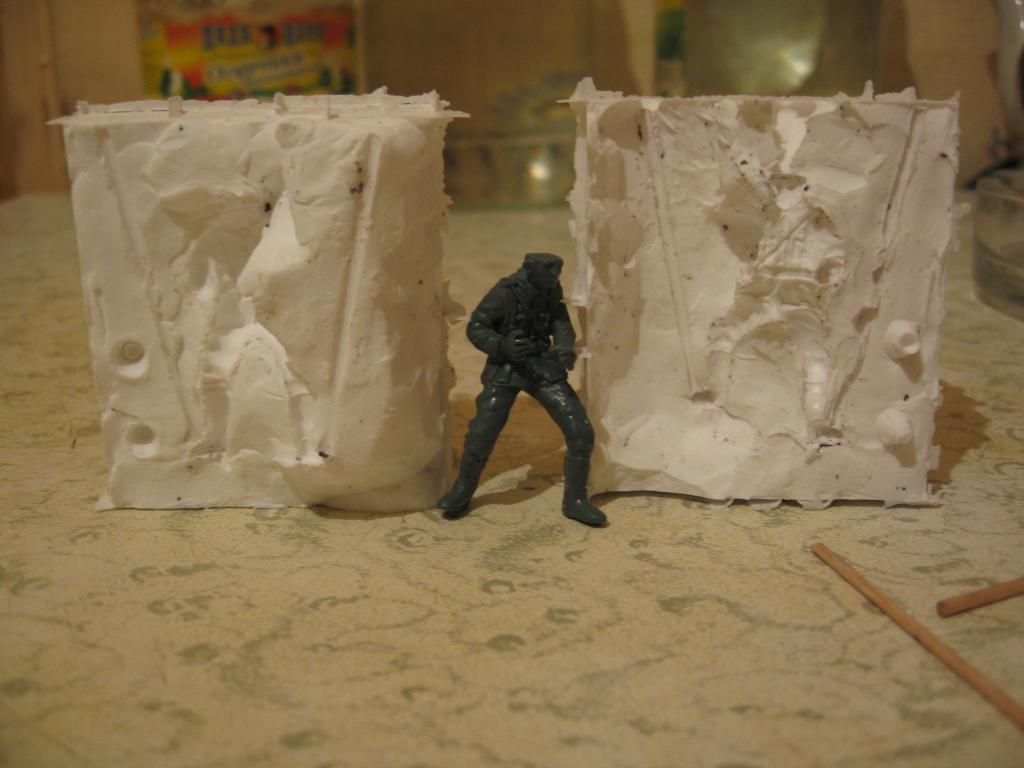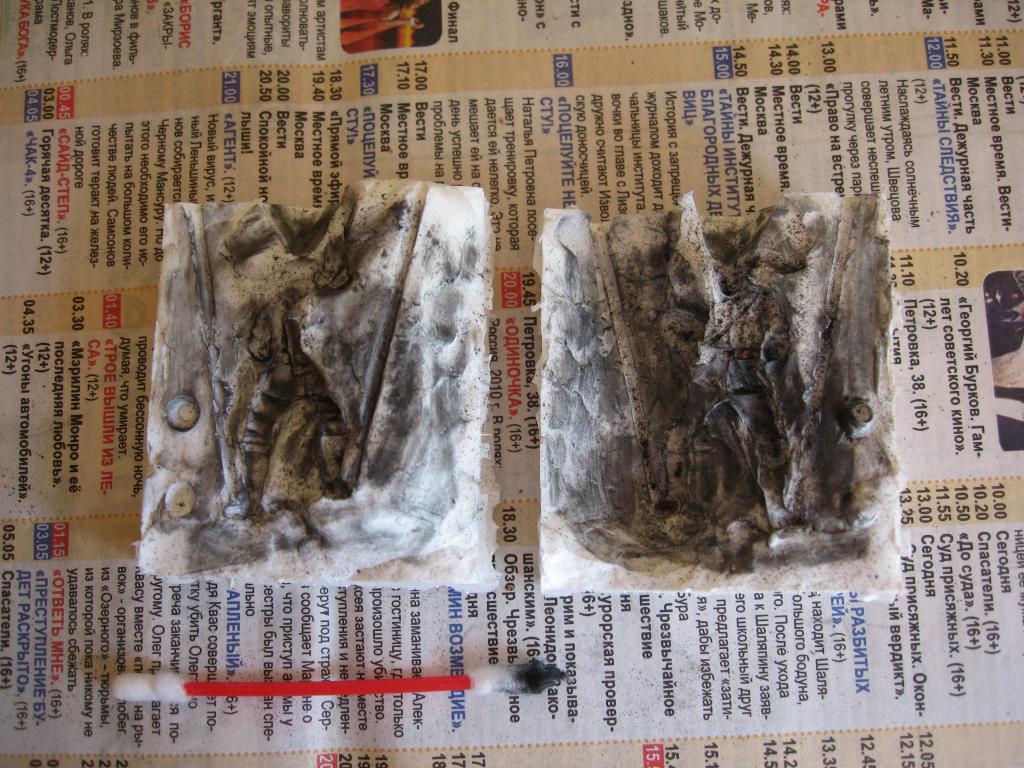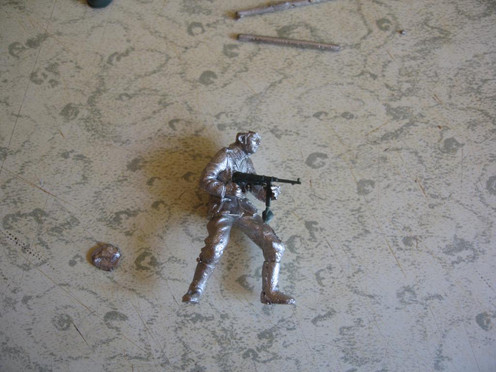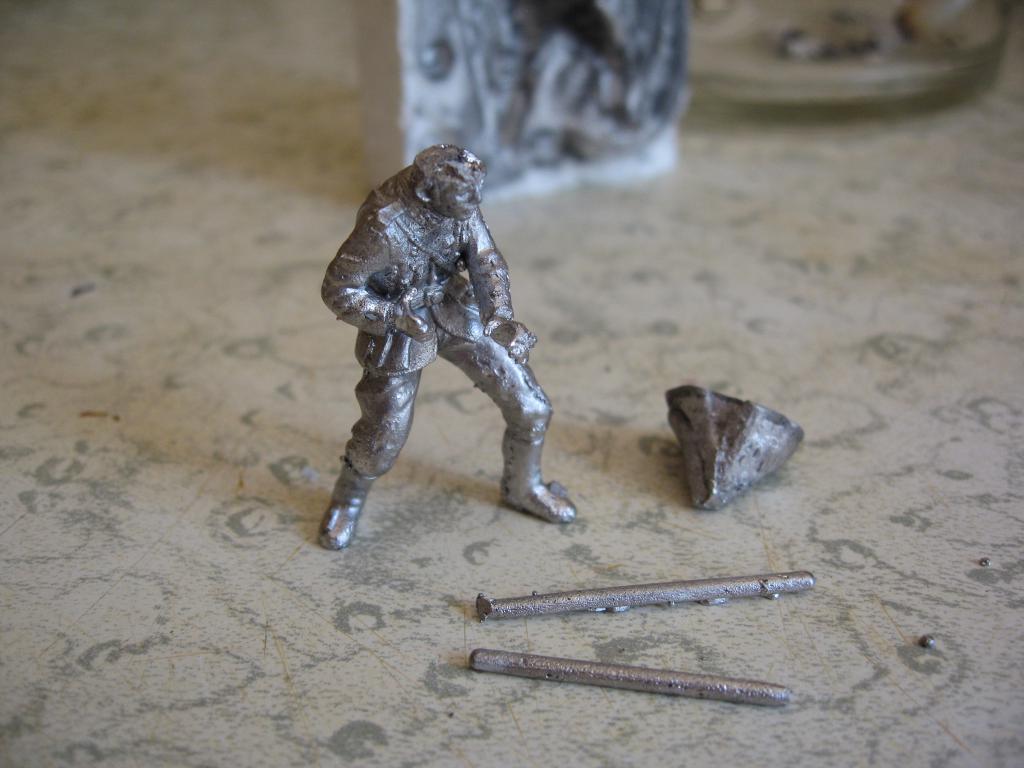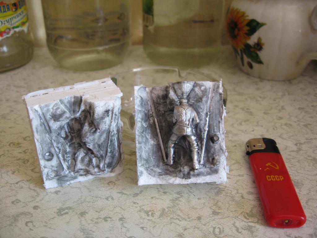 Закончив с этой диорамой, к следующей приступлю, наверное, значительно позже - собраться с силами, мозгами, потренироваться в раскраске солдат. Ведь, действительно, надо признать, что раскраска далека от совершенства. Но пока суть да дело, выполняю обещание рассказать о процессе отливки солдатиков и всякой другой амуниции. Вообще-то, отливать нужно солдатиков, созданных собственной фантазией, но это будет тогда, когда приступлю к новой диораме. Пока для примера возьму солдатика из набора. Это, конечно, получается в некотором роде плагиат, но простят меня создатели этого солдатика, тиражировать я его не собираюсь. Дополнительно нужно будет отлить касок и автоматов. Стволы пластмассовых автоматов обычно ломаются, если фигурка случайно вылетит из рук и упадёт на пол. Так что это - вынужденная мера. А каски пригодятся к тем немецким солдатам, которых я буду отливать к будущей диораме.