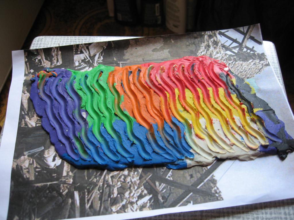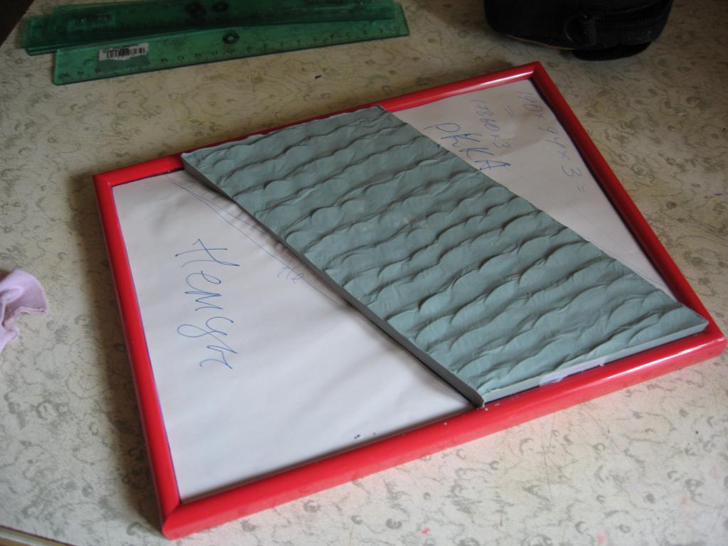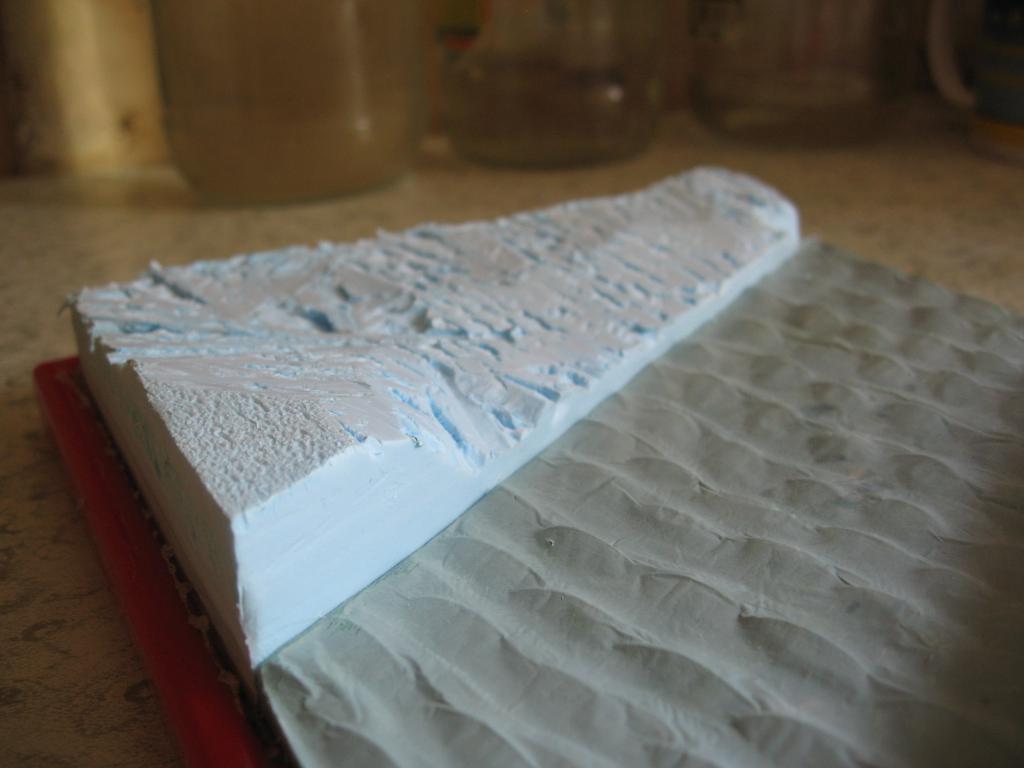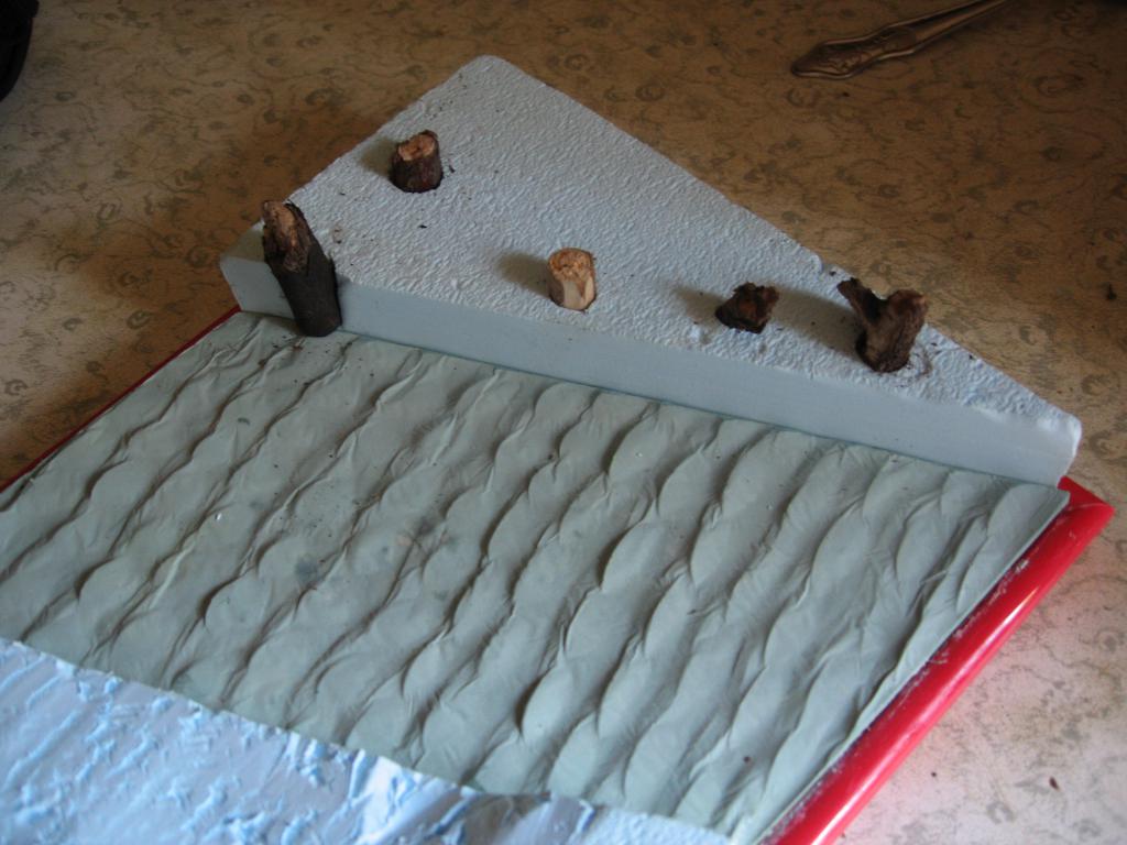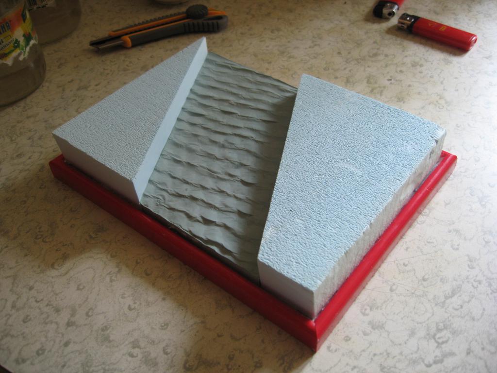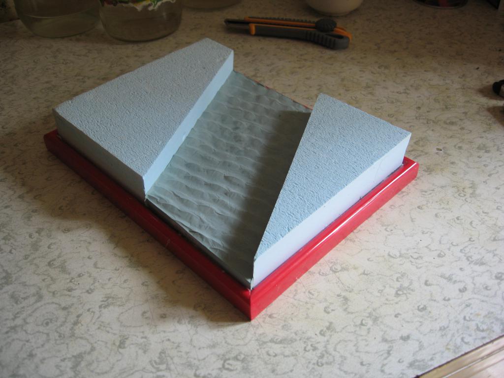 Ну, вот и первый косяк. Слава Богу, проявилось в самом начале. Волны на гипсовой отливке получились небольшими. Осторожничал я, боялся сделать их глубокими для такого ручья. Когда залил эпоксидкой и стал выравнивать на гипсе рельеф воды, тот получился вообще никакой. Как говорил проф. Преображенский - "В печь!" В-общем, залил гипсом по-новому, с более глубокими волнами. Весь процесс не фотографирую - он такой же, а фотографии новых волн прилагаю. Опыт, однако! Завтра высохнет эпоксидка, с которой сегодня экспериментировал, чтобы можно было что-то анализировать о процессе.