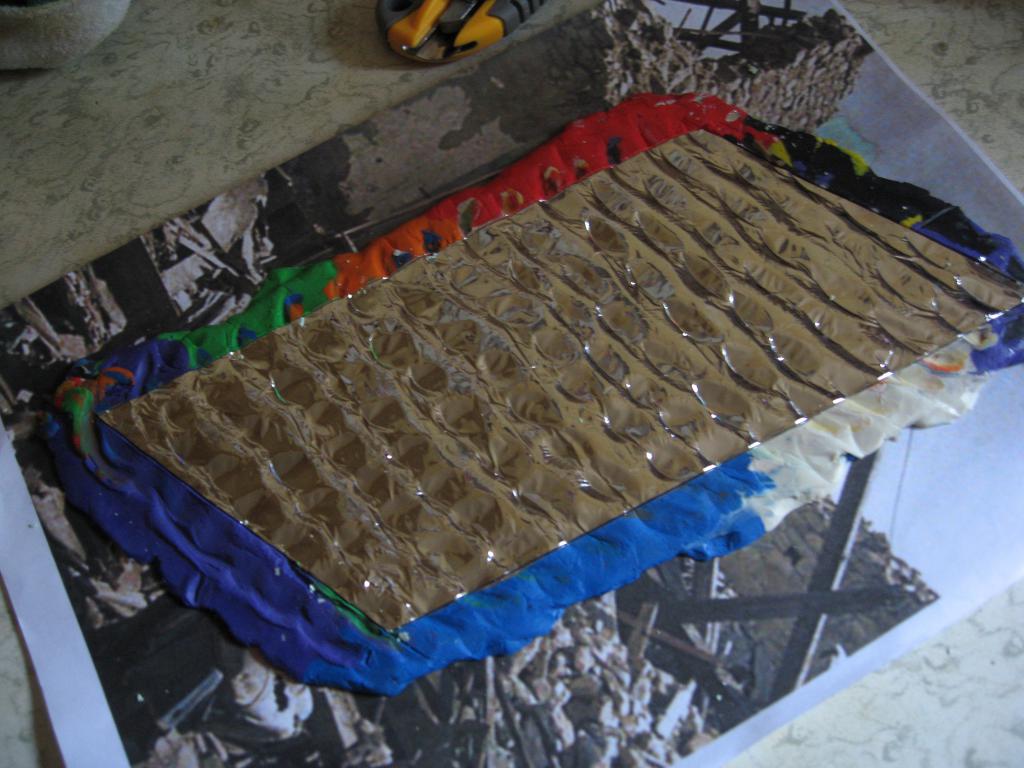 Пока герметик застывает, поделюсь некоторыми выводами, которые выявились в ходе экспериментов с эпоксидкой. Рассаживать растительность и вставлять в "воду" фигуры солдат нужно в момент практически полного застывания эпоксидки. Для высаживания растительности лучше будет не сверлить отверстия в застывшей смоле, а перед полным застыванием "насажать" в смолу кучу тонких иголок, концы которых смазаны маслом, чтобы было легче вытаскивать из застывшей "воды". Те предметы, которые были расставлены до заливки эпоксидкой, оказались при застывании обрамлены смолой (как бы в кучке воды). А если расставлять перед полным застыванием, то вокруг иголок и ног солдат образуются и впоследствии застывают некие воронки, очень напоминающие расходящиеся волны. Чтобы имитировать волновую рябь, в момент схватывания смолы нужно покачивать модель в разных направлениях, даже переворачивая её "столбом". Эпоксидка начинает принимать форму гипсовых волн. Это несколько долгая процедура - может занять около часа, пока движение смолы не прекратится. Чтобы передать цвет водной поверхности, лучше всего, на мой взгляд, красить не эпоксидку, а гипсовую основу, на которую заливается смола. Тогда передаётся прозрачность верхних слоёв "воды". Чтобы сделать мутную "воду", нужно добавить в жидкую смолу масляную художественную краску. Краски Тамия и Цитадель не дают смоле застывать зеркально, образуя на поверхности матовость. И в завершении опытов ещё одно наблюдение - зеркальную водную поверхность можно сделать, заливая эпоксидку не на гипс, а на форму из фольги с выдавленными "волнами". Чтобы передать цвет воды, в этом случае нужно заливать несколькими слоями, окрашивая поверхность каждого из высохших слоёв. В этом случае "лицом" водной поверхности будет сторона, Фотографии участков этих экспериментов очень нечёткие из-за "мелкости" исследуемых фрагментов. Думаю, что и без фото довольно-таки подробно описал их суть.