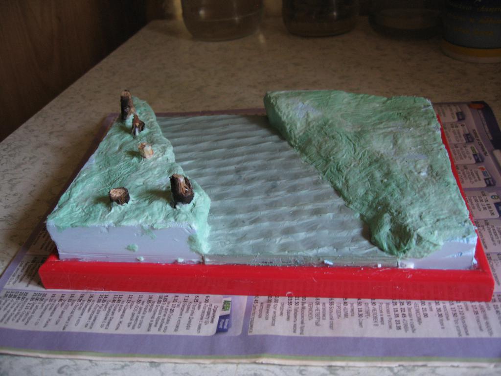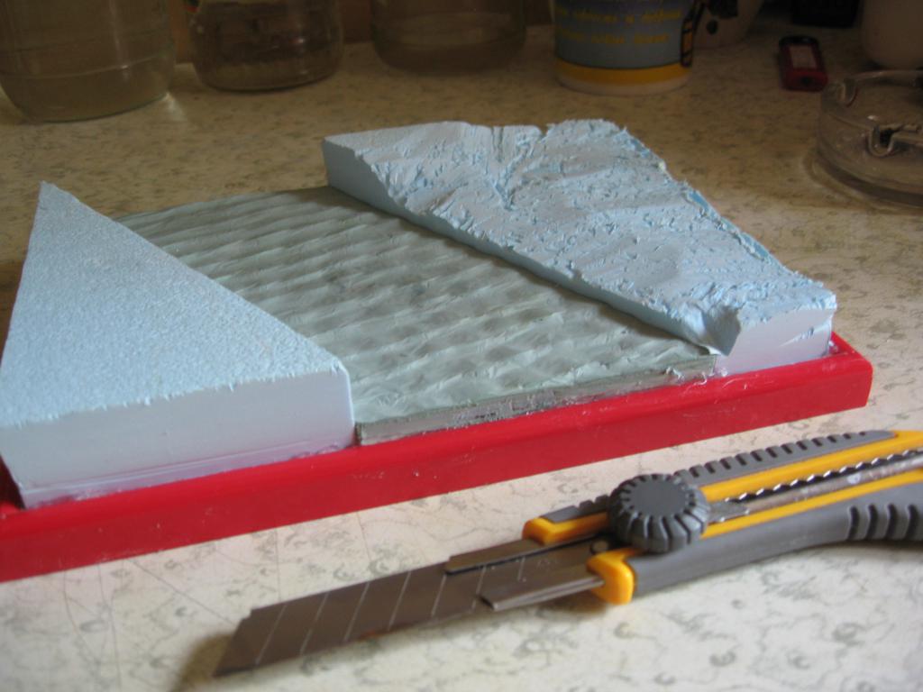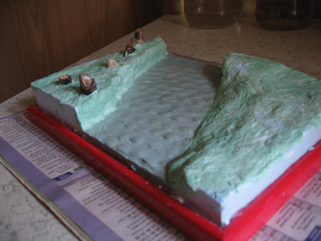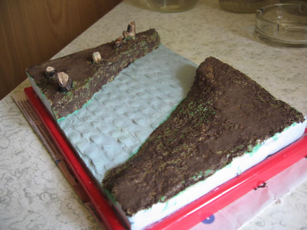 Начинаю формировать рельеф. С нашей стороны берег будет крутым, а на немецкой стороне попробуем сделать пологий пляжик. Порадуем оккупантов речным песочком. Ненужный пенопласт на первой фазе просто срезаю ножом.