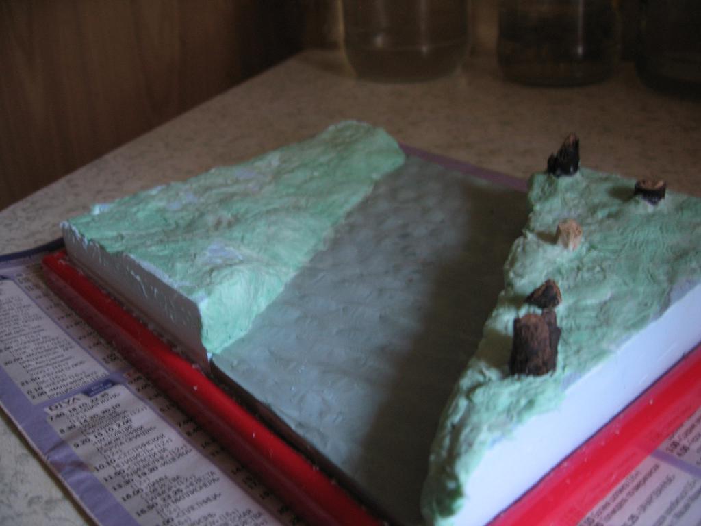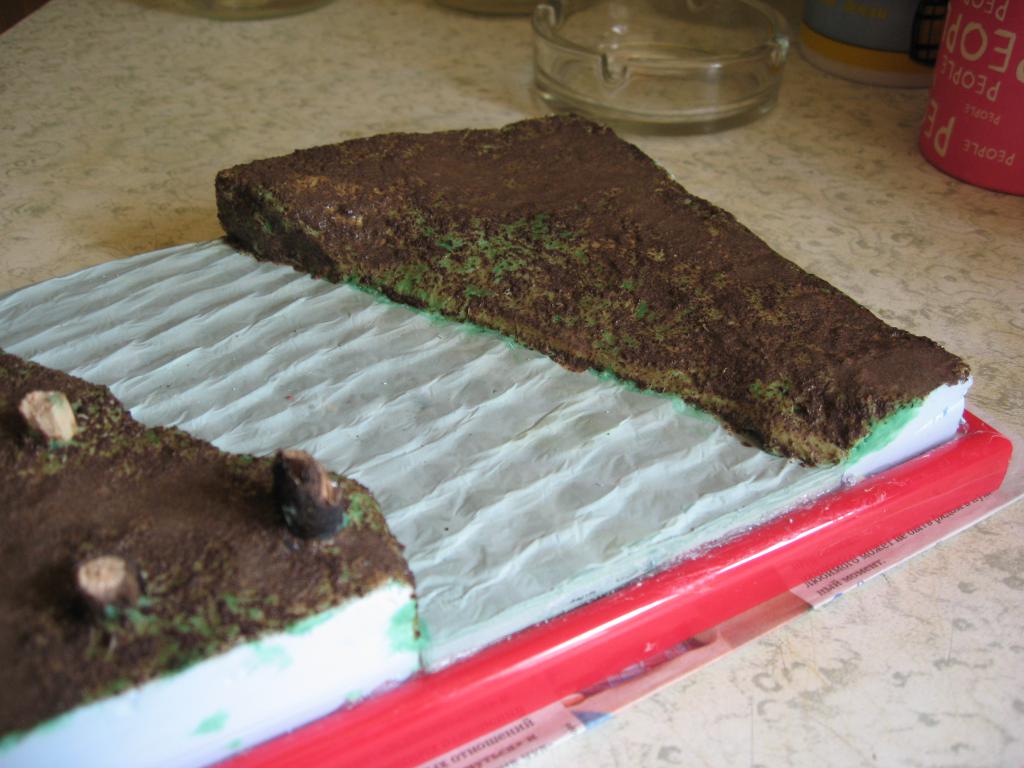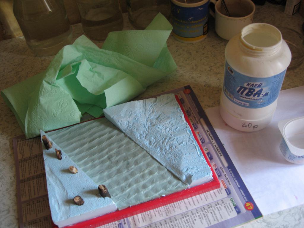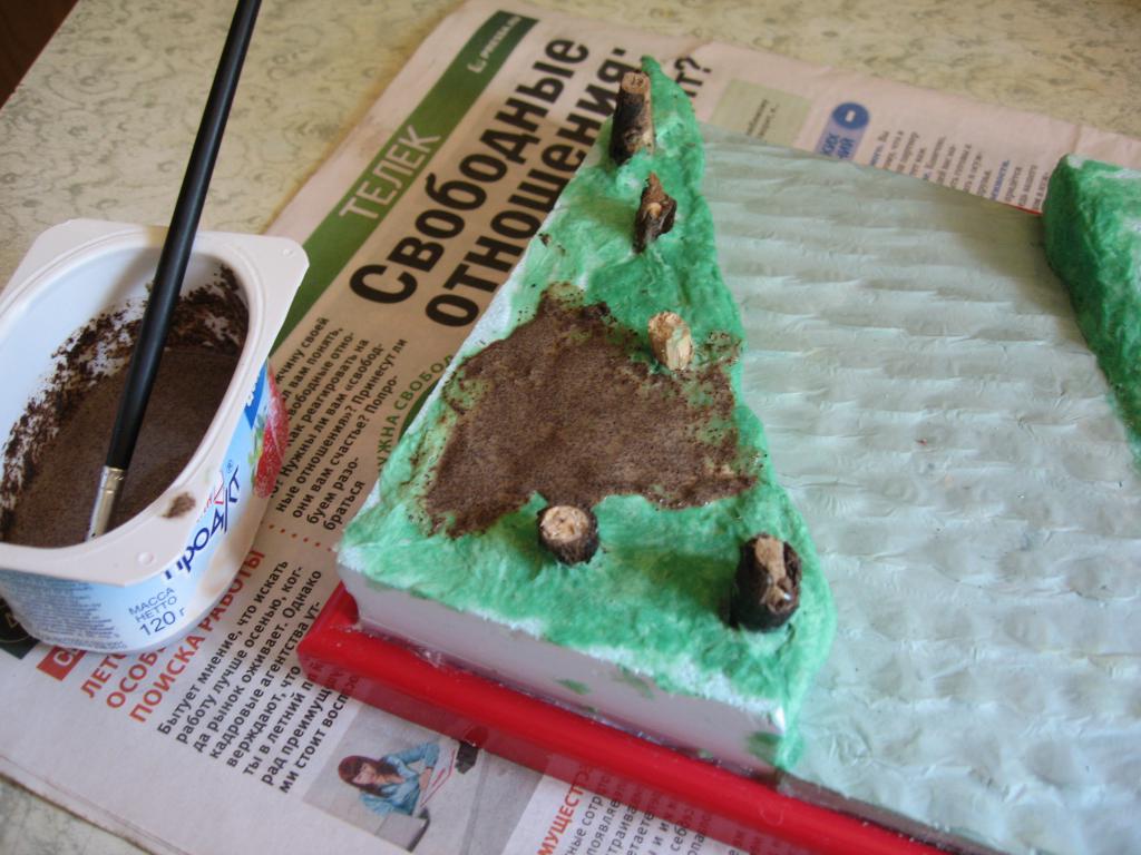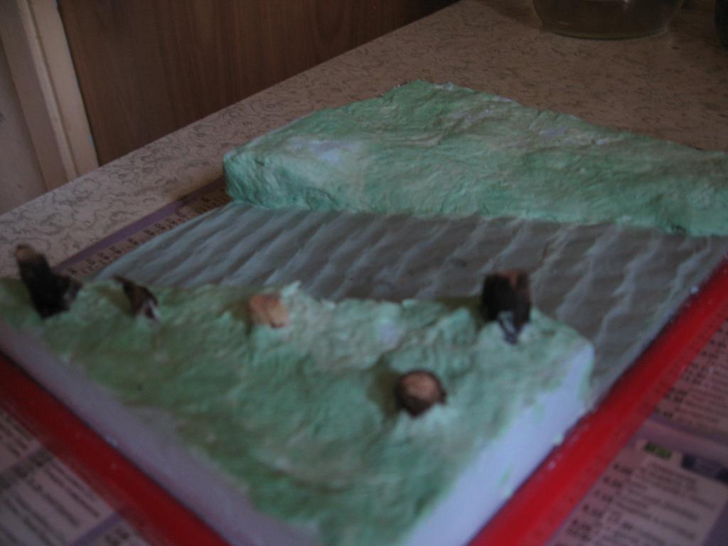 И теперь, методом создания папье-маше формируем ландшафт. Кусочки туалетной бумаги смачиваем в ПВА и приклеиваем туда, куда считаем нужным. Затем выравниваем и разглаживаем пальцем или кисточкой. Когда всё готово - отправляем сохнуть. Вероятно, до завтра (в лучшем случае).