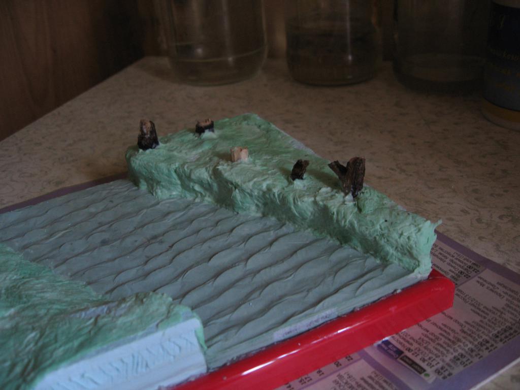 Также на улице была подобрана замечательная веточка, из которой будут нарезаны прибрежные пни для советского берега. Для лучшего приграничного обзора прибрежные деревья, наверное, были вырублены и остались лишь пеньки. Ну, это, конечно, моя фантазия. Ноя думаю, что такое вполне могло быть. Иначе, без прибрежных пней не оправдать корней, свисающих в воду (для естественности ландшафта). А деревья на этой диораме будут лишними и займут слишком много места, которое будет нужно для размещения пограничников.