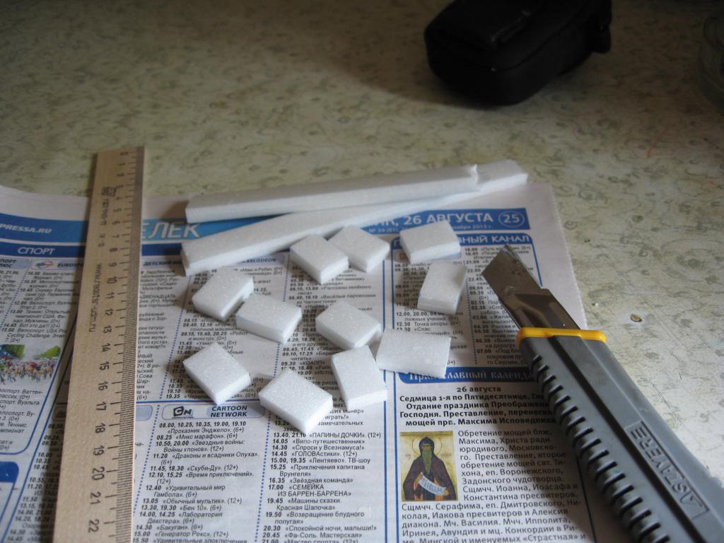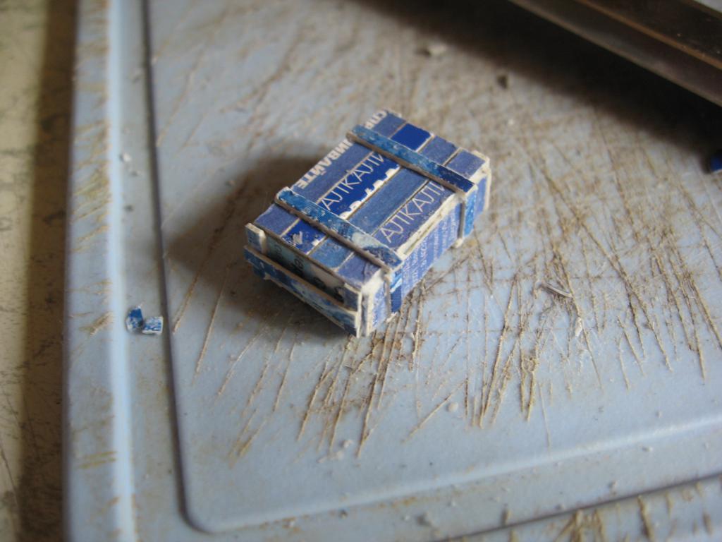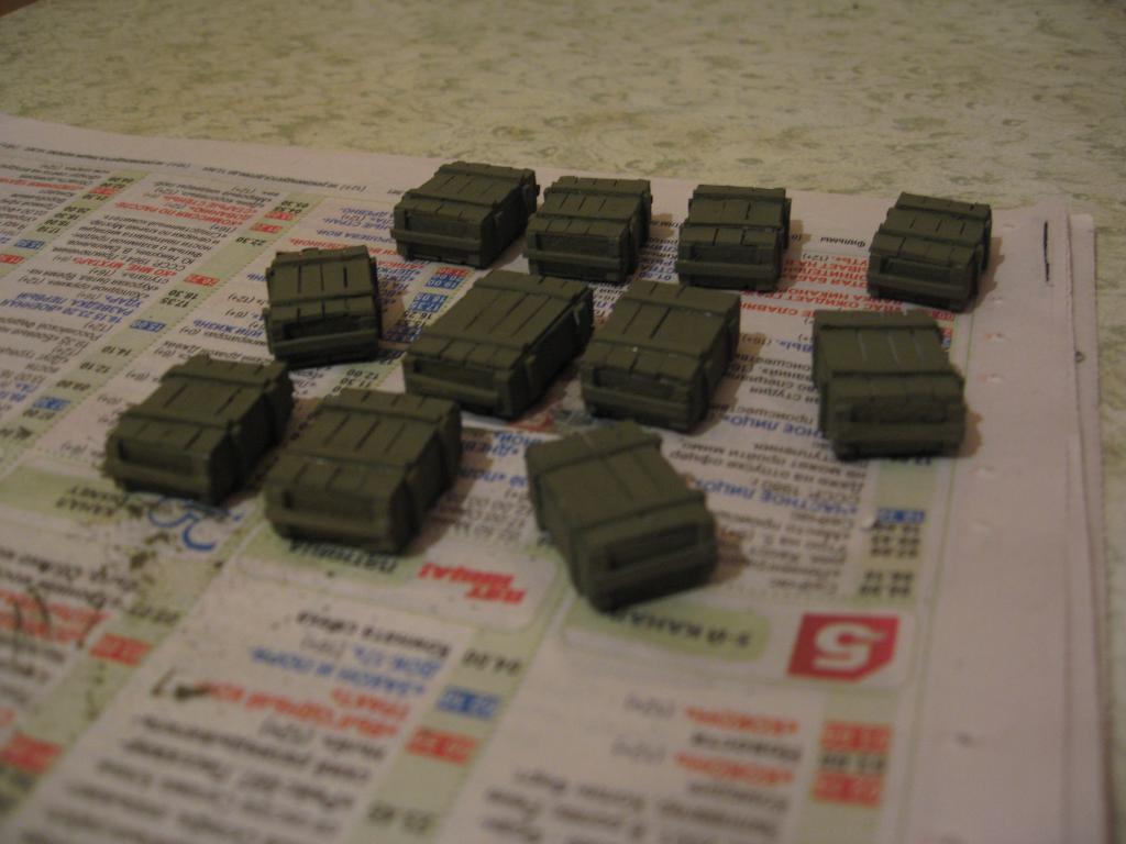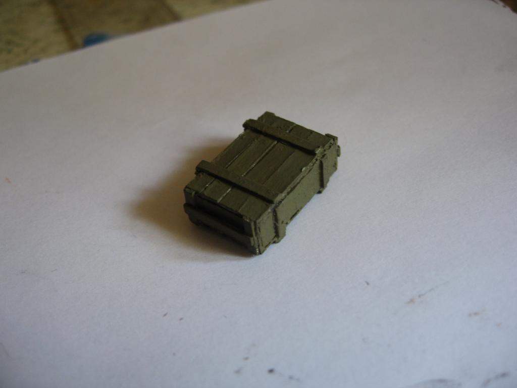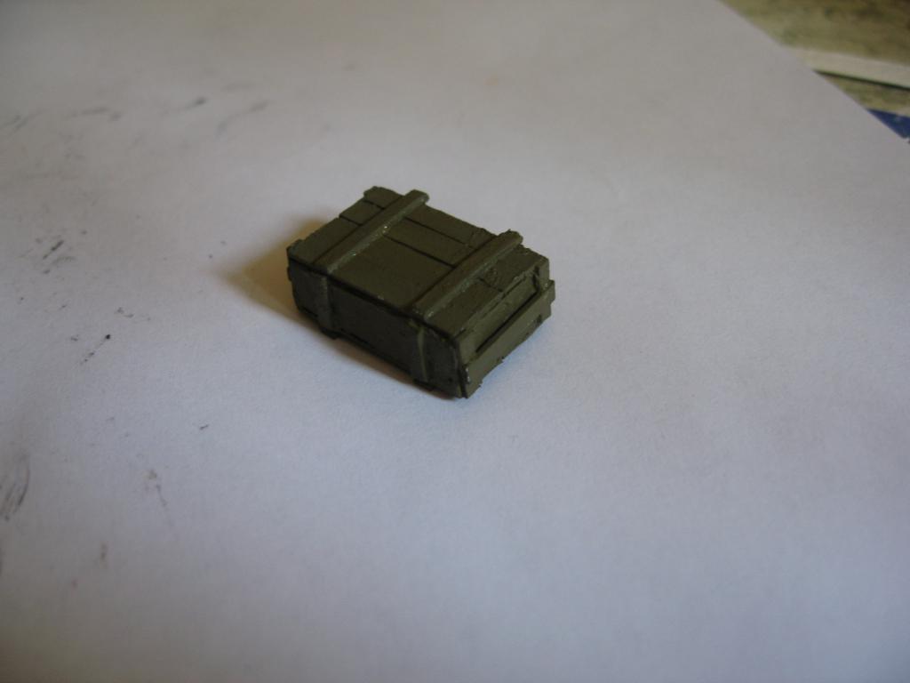 Сделал первый ящик, и рассказываю, как мастерил. Полоски тонкого плиточного пенопласта склеил между собой, увеличивая по толщине. Затем из пенопласта нарезал заготовок по размерам стандартных ЗИПовских ящиков. Теперь мне нужен толстый плотный картон, из которого буду изображать доски ящика. В-общем, что не в мусор - то в диораму. Из картона нарезал "досочек", которыми оклеил пенопластовую заготовку. Как финал - окрашивание в защитный цвет.