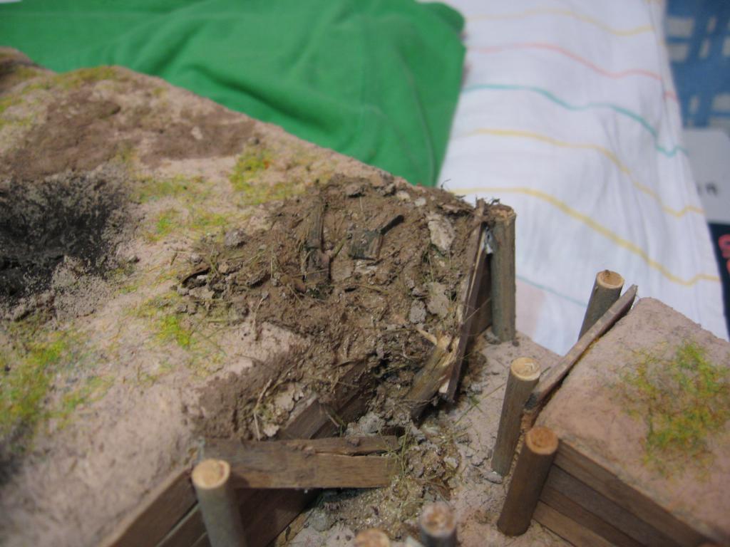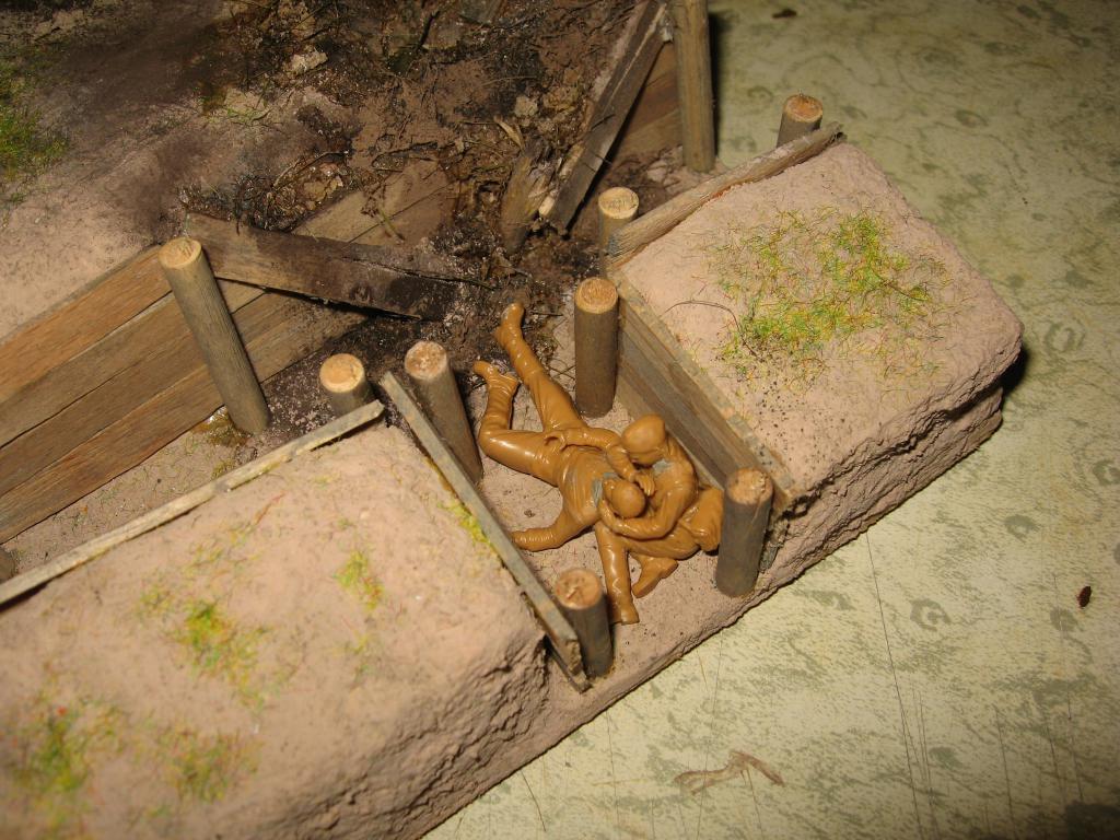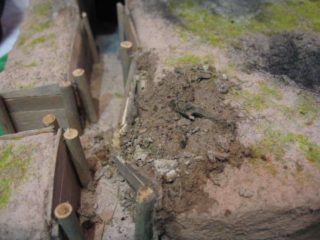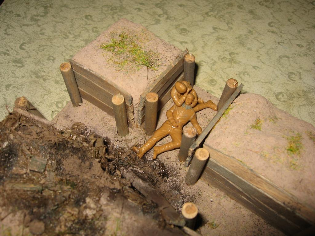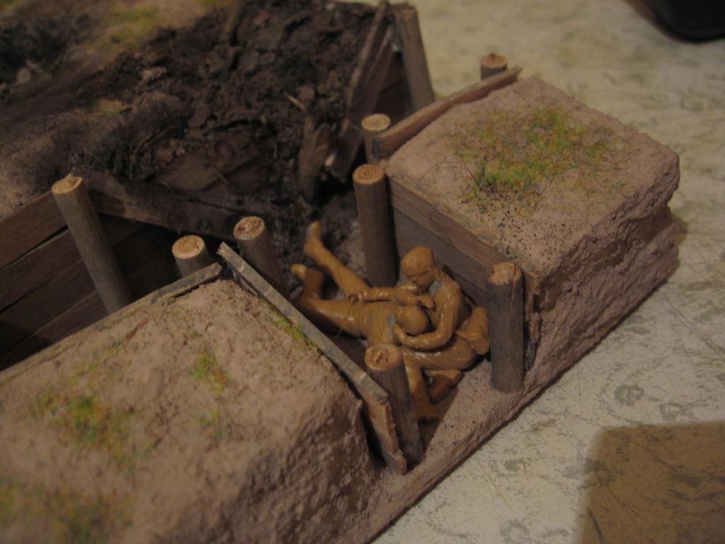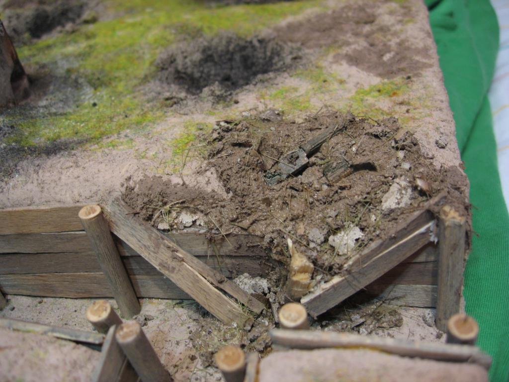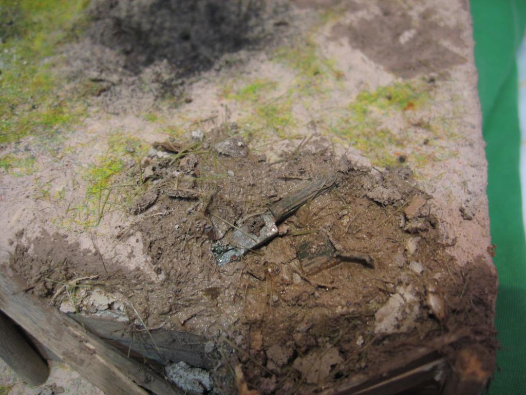 Смотрел-смотрел на диораму, да и раскурочил кусок окопа - якобы от попадания мины прямо в бруствер, где находилось пулемётное гнездо. Делал всё по тому же принципу - вырезал ножом воронку и обложил её "почвенной" смесью и набросал сверху сухих комков этой смеси. В эту воронку ещё всунул разбитый пулемёт "Максим", который валялся в коробке без дела. На фото видно, что ещё всё сырое, поэтому не пигментировал и не тонировал почву в разбитом окопе. Наверное, потом буду тонировать сразу весь окоп, когда все его фрагменты будут "окультурены" снарядами, минами, да пулями.