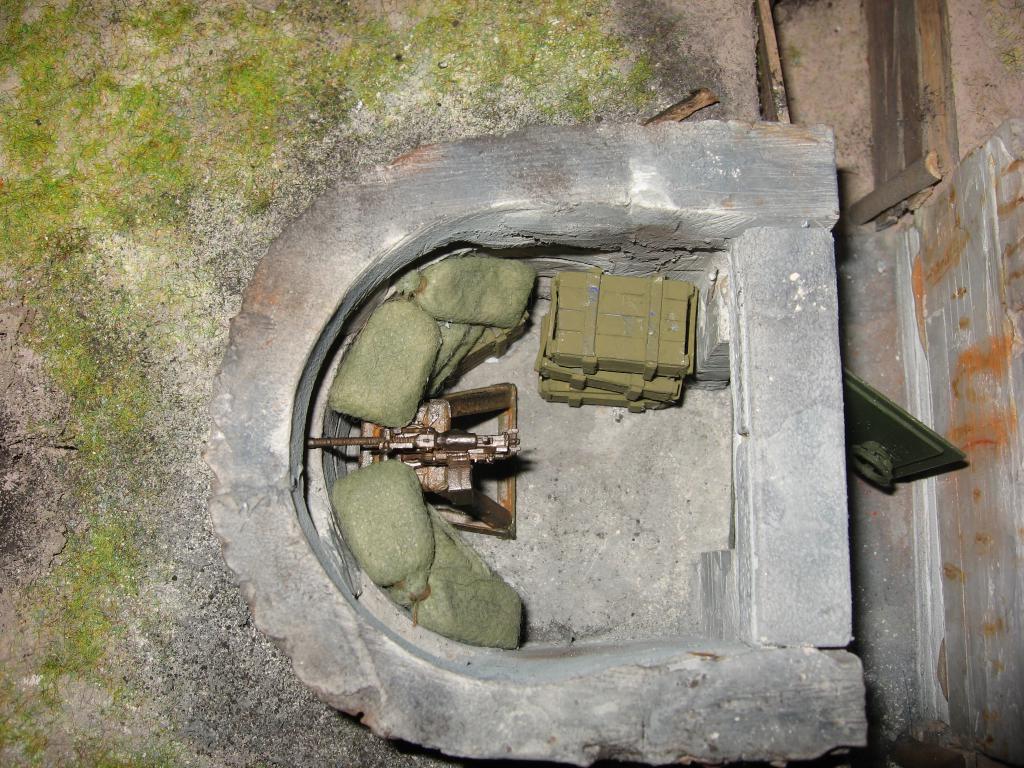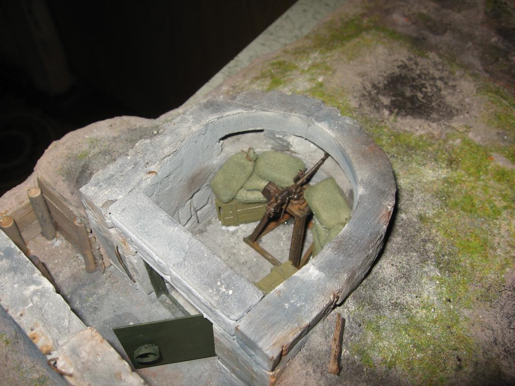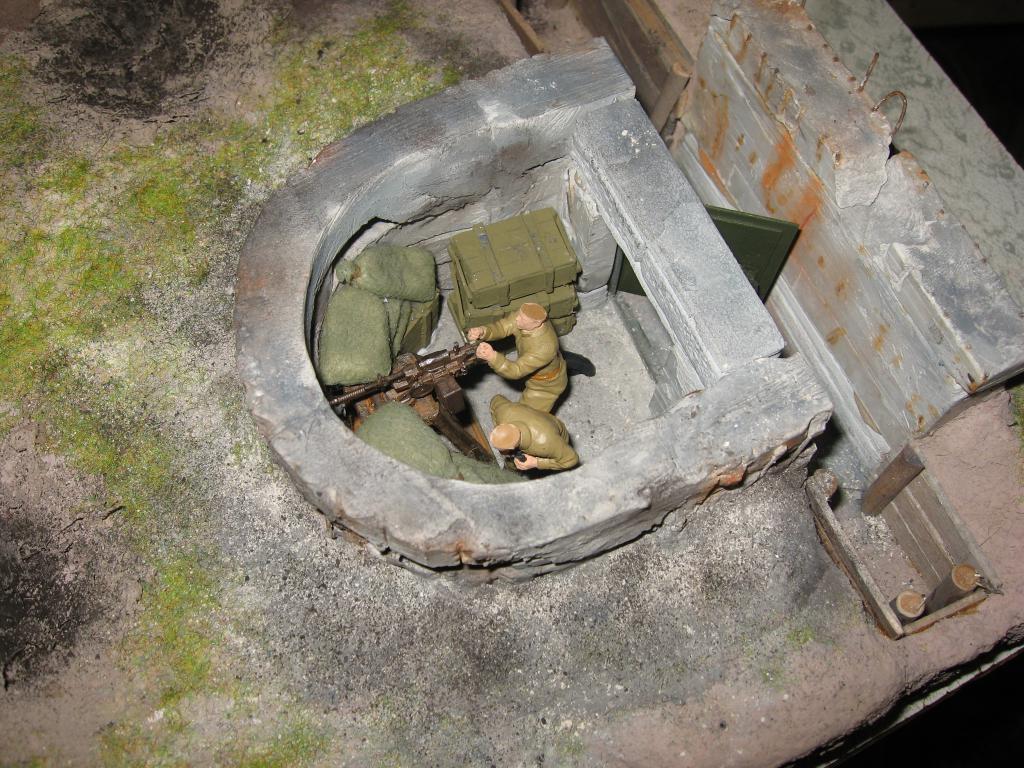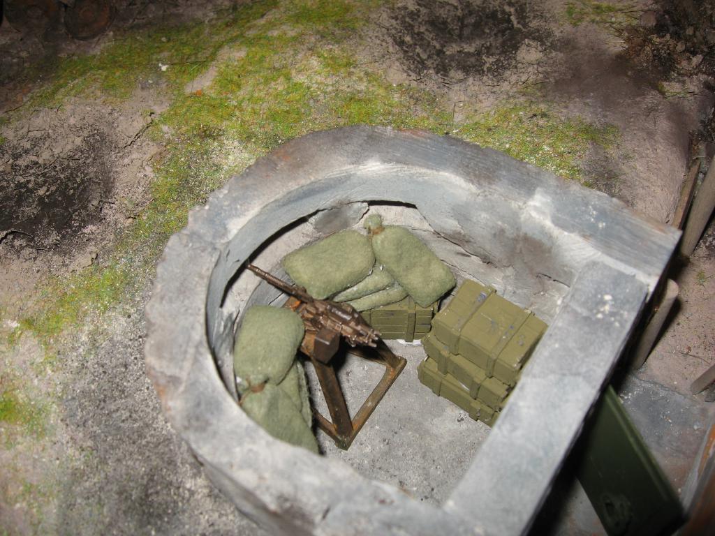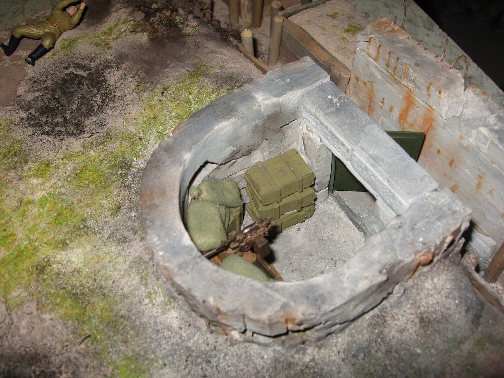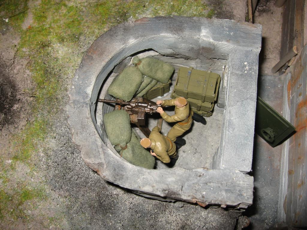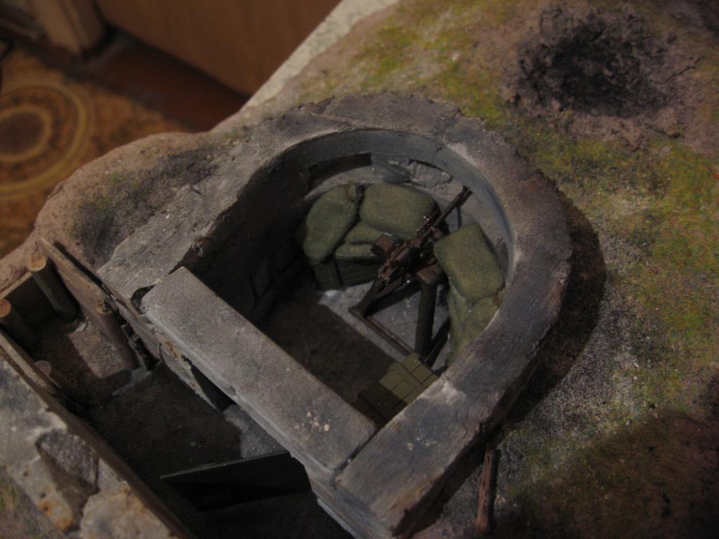 Смотрел-смотрел на диораму, да и раскурочил кусок окопа - якобы от попадания мины прямо в бруствер, где находилось пулемётное гнездо. Делал всё по тому же принципу - вырезал ножом воронку и обложил её "почвенной" смесью и набросал сверху сухих комков этой смеси. В эту воронку ещё всунул разбитый пулемёт "Максим", который валялся в коробке без дела. На фото видно, что ещё всё сырое, поэтому не пигментировал и не тонировал почву в разбитом окопе. Наверное, потом буду тонировать сразу весь окоп, когда все его фрагменты будут "окультурены" снарядами, минами, да пулями.