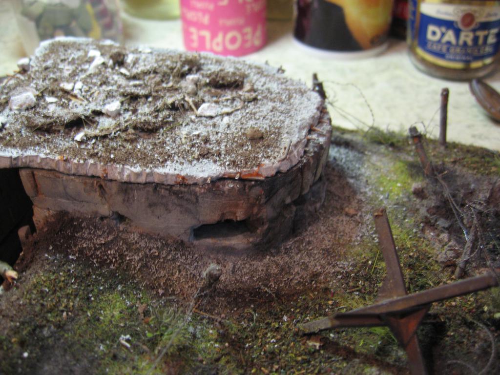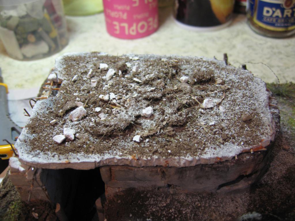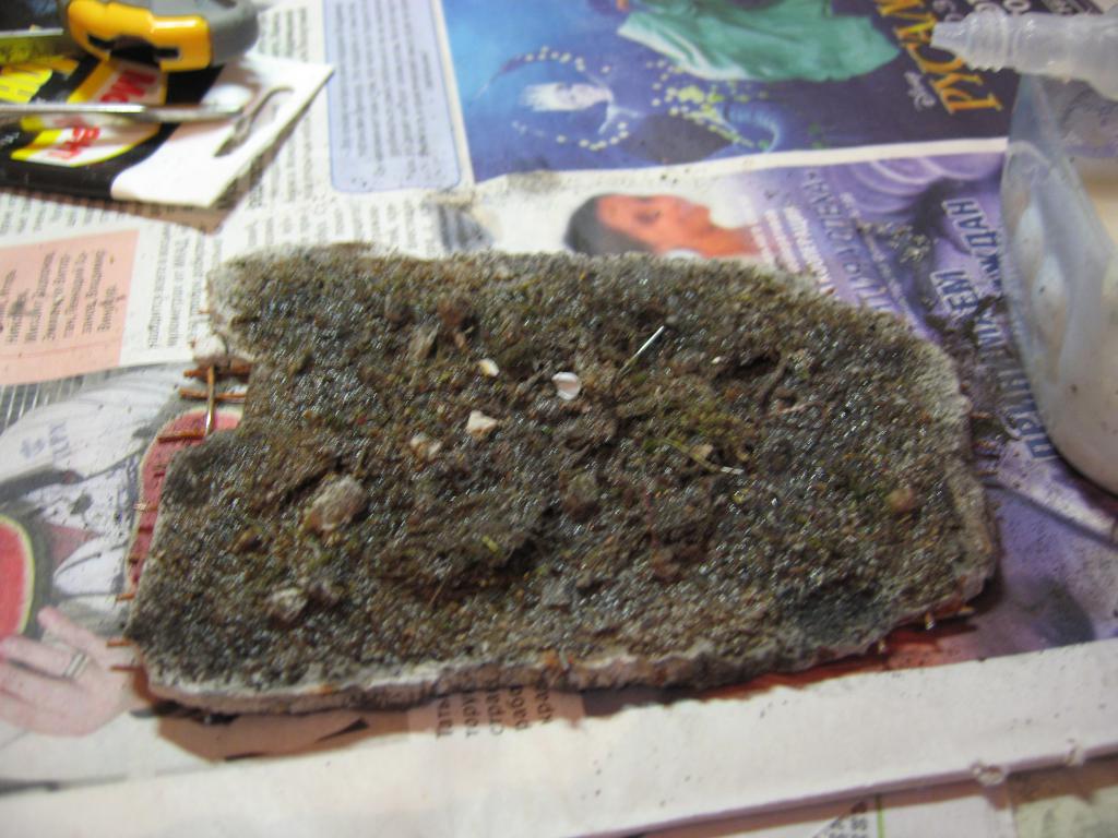 Понадеялся я, что сегодня закончу с диорамой - ан нет! Выстрелило внезапно в Беларусь сгонять на пару-тройку дней - начались сборы в дорогу. Оставляю всё до приезда. Чтоб не было скучно, снял процесс оземленения крыши ДОТа - её всё-таки забрасывало землёй, осколками, кусками бетона. Сначала налил слой ПВА. Затем на него насыпал крупные куски почвы, гипсовые осколки. Потом сверху насыпал мелкой почвы, пигментов, гипсовой крошки. И всё это с помощью пипетки прокапал смесью ПВА, воды и водки. Пока буду ездить, всё высохнет.