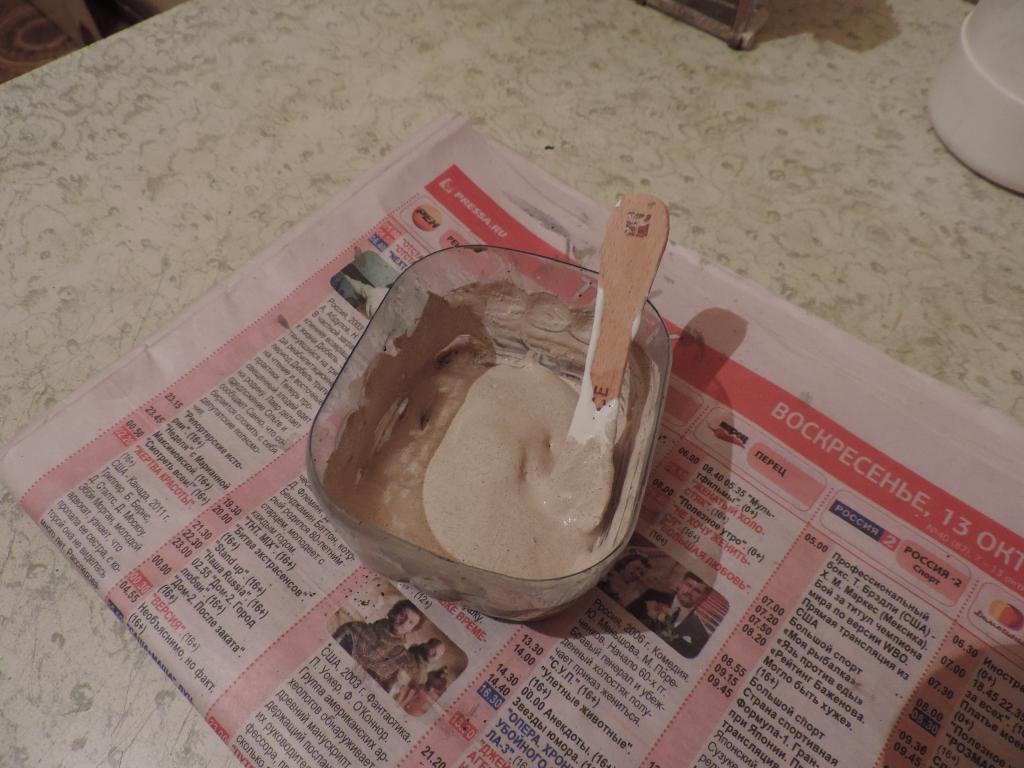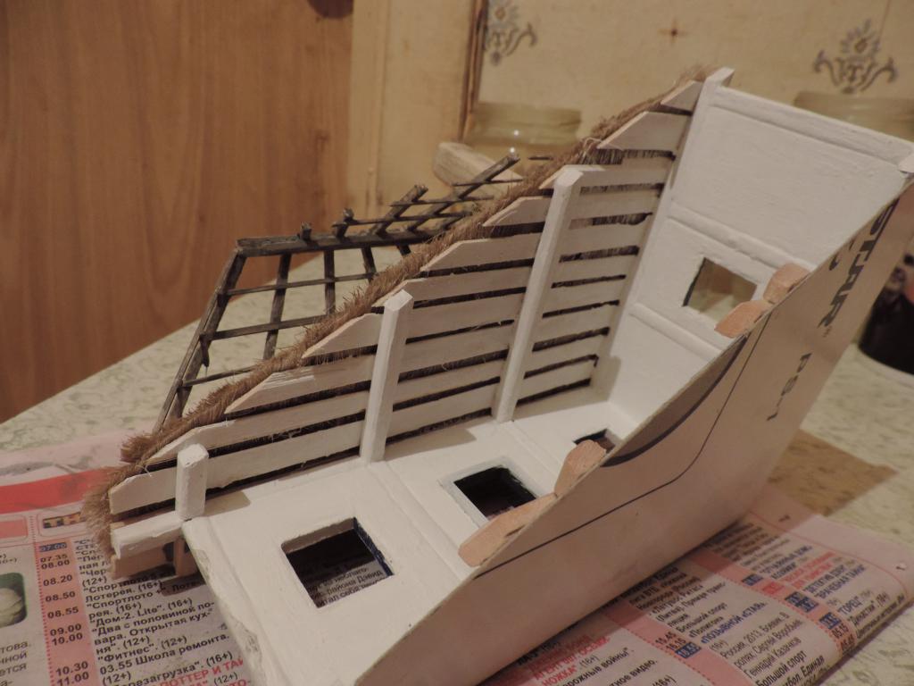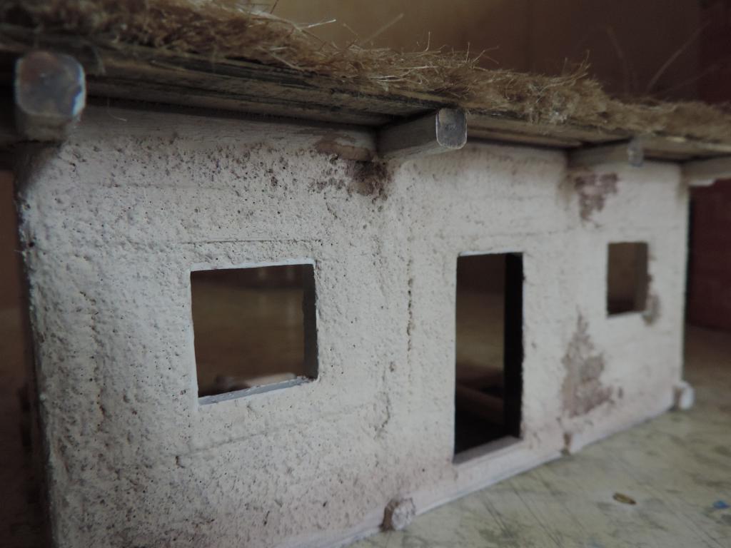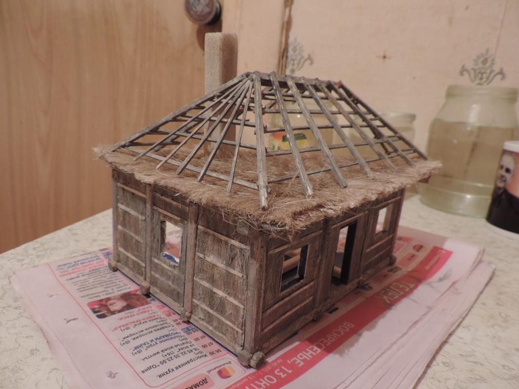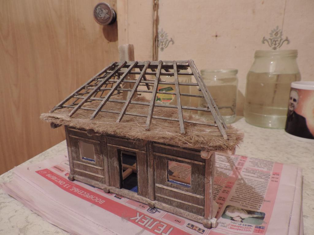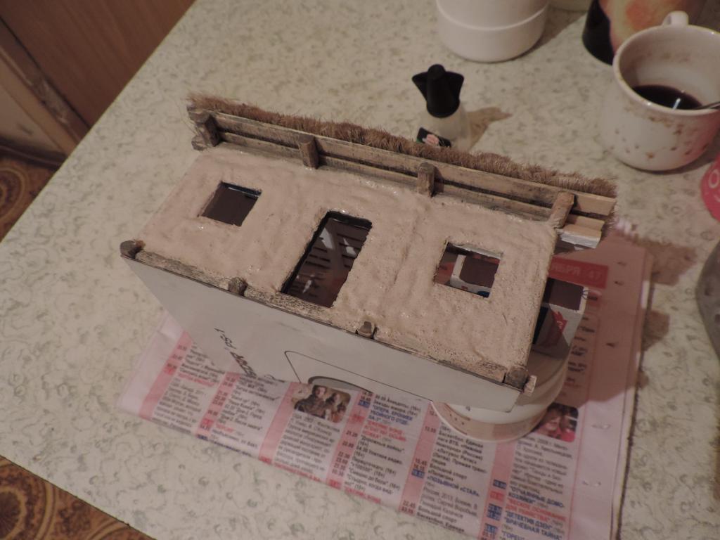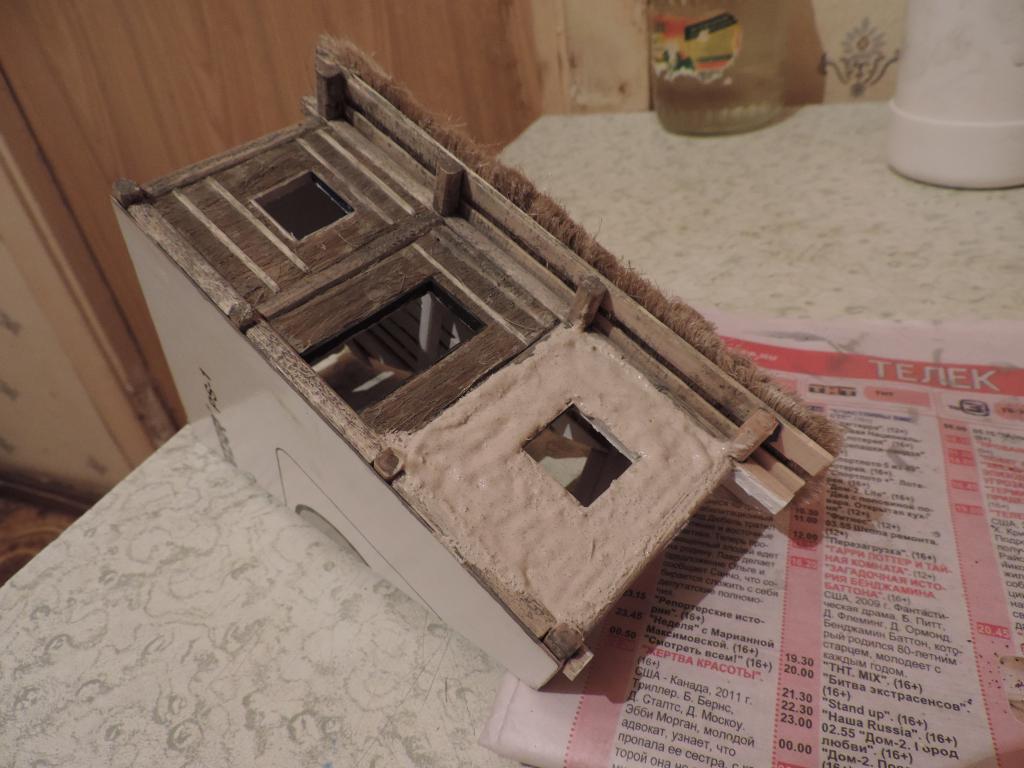 Что успел сделать сегодня: сначала "состарил" дерево на крыше и снаружи стен, а также "солому" слабым водным раствором тёмно-серой акриловой краски. "Побелил" потолочные доски хаты. Теперь нужно набросать "глины" на стены снаружи. Это будет уже знакомая нам смесь ПВА, кофе и белого акрилового грунта. Нанёс кисточкой "глину" на одну сторону хаты. Теперь ждать, когда чуть подсохнет, чтобы разровнять. А когда высохнет, уже покрывать так же и вторую сторону.