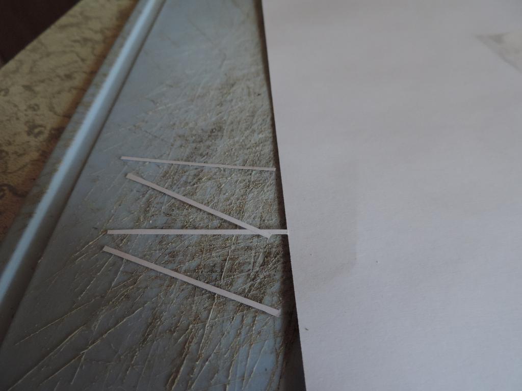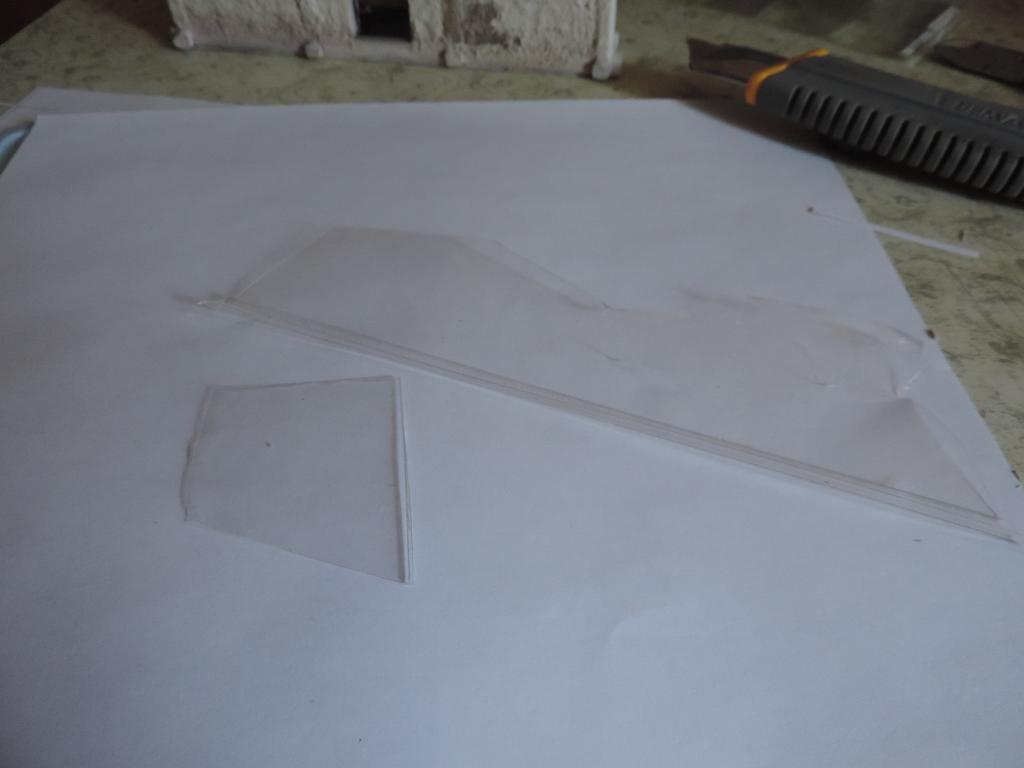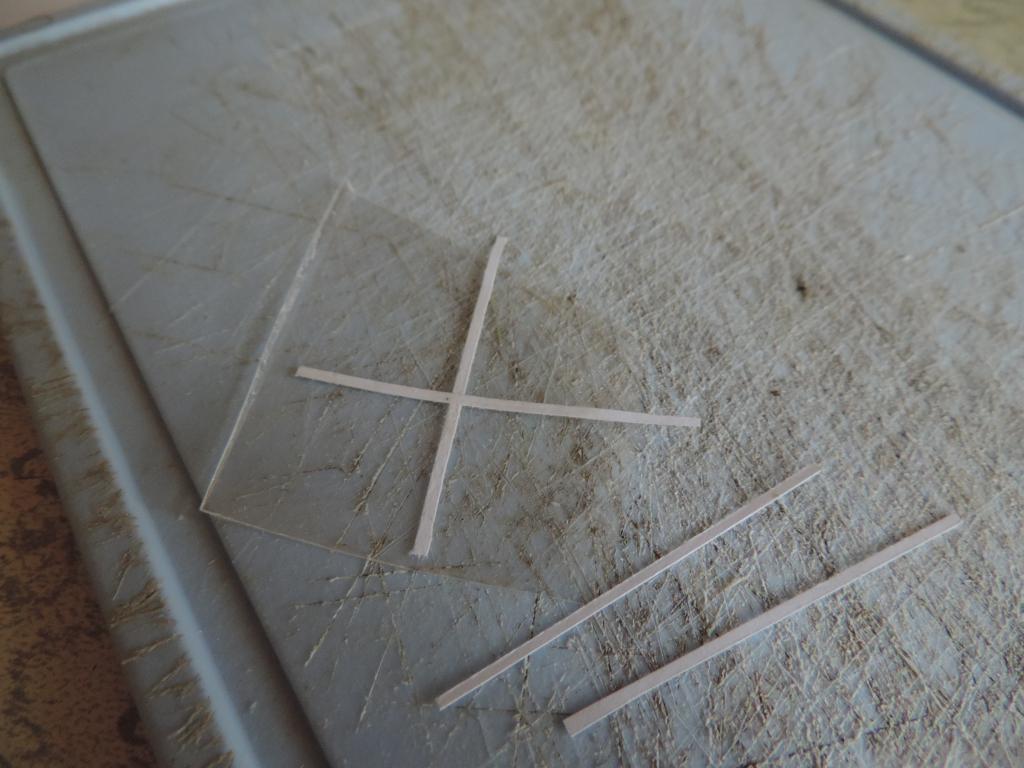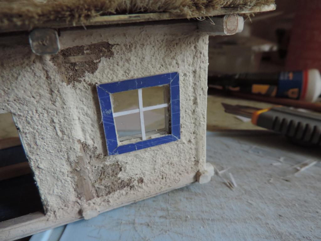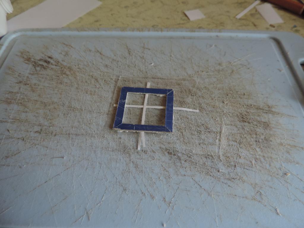 Следующая задача - вставить стёкла и рамы. Стёкла делаю из тонкой плёнки (упаковка от какого-то печенья. На неё с двух сторон в форме креста наклеиваю бумажные полоски, которые потом покрашу в коричневый цвет (типа рейки). И всё это обрамляю рамой из картона. Всё конструкцию приклеиваю к оконному проёму.