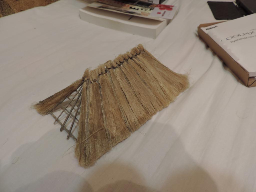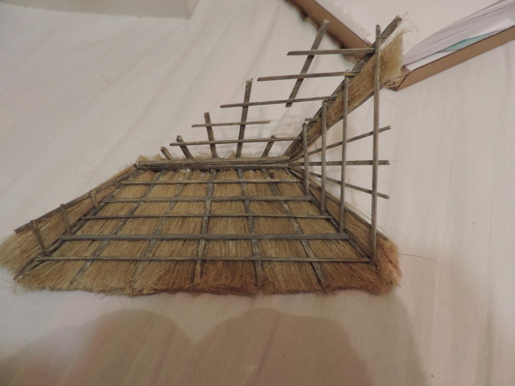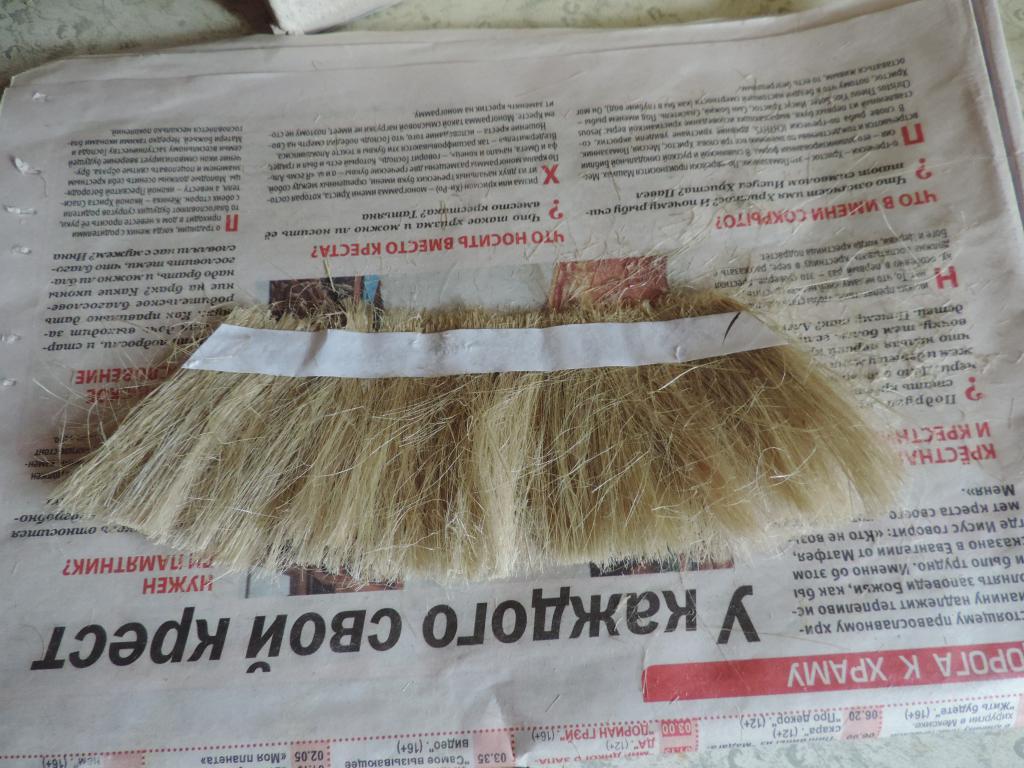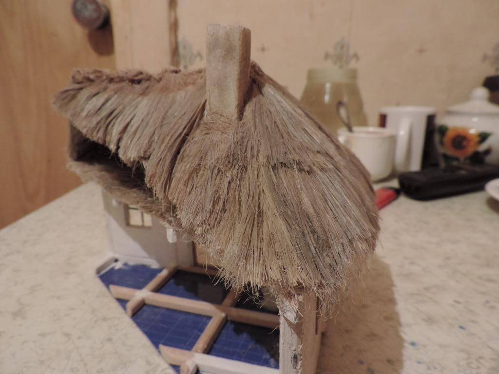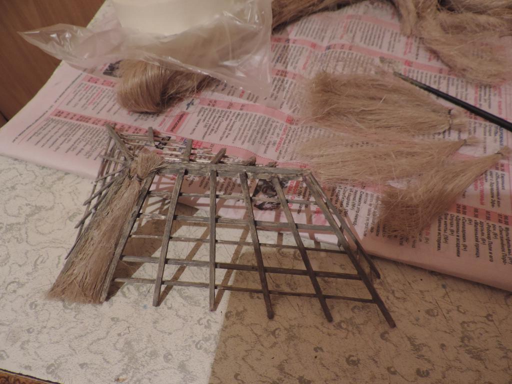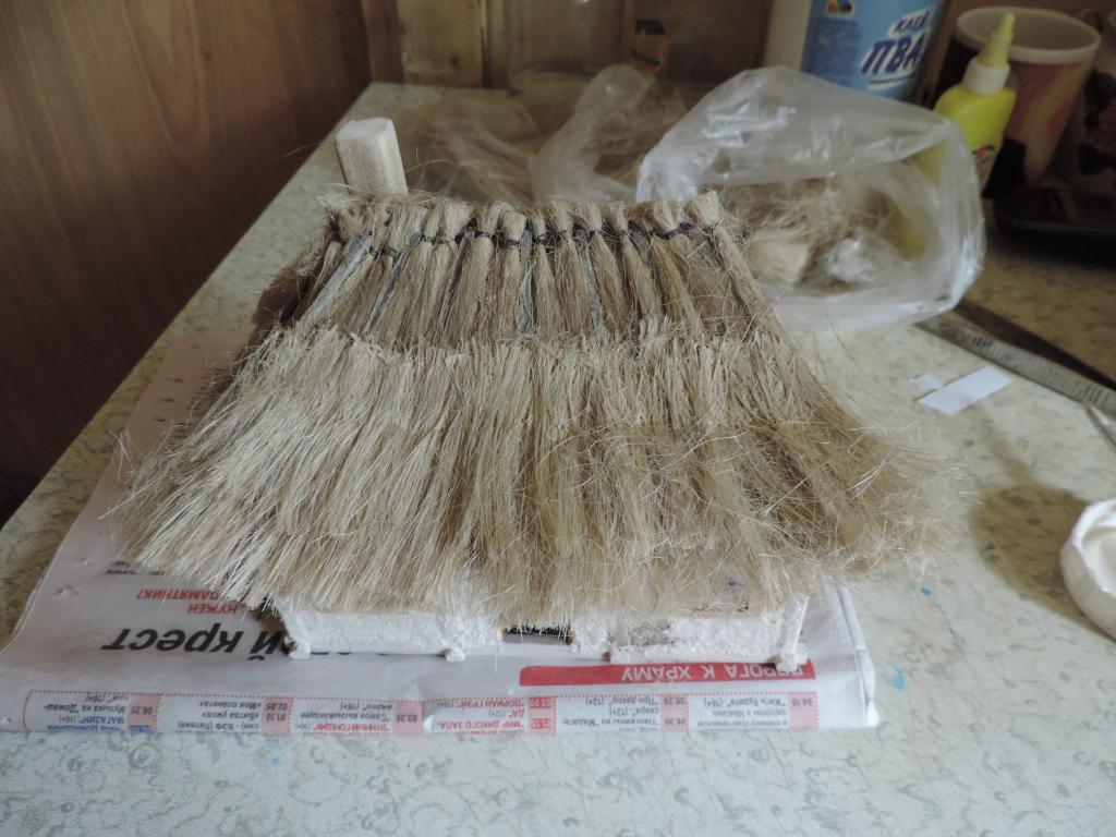 А моделизмом 1:35 кто-нибудь увлекается?-dscn0597.jpgА моделизмом 1:35 кто-нибудь увлекается?-dscn0599.jpgА моделизмом 1:35 кто-нибудь увлекается?-dscn0600.jpgА моделизмом 1:35 кто-нибудь увлекается?-dscn0601.jpgНачинаю покрывать крышу соломой. Сначала делаю пучки сантехнического льна, связывая с одного конца ниткой. Затем пучки укладываю на крышу и промазываю жидким ПВА (развожу с водой примерно 1:1). Это будет только первый слой. А вообще-то, прикидываю, что будет три слоя соломы, чтобы выглядело объёмно.