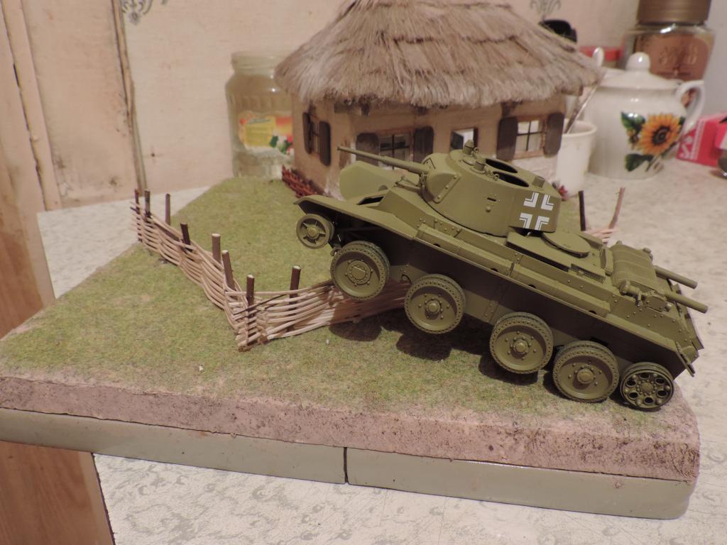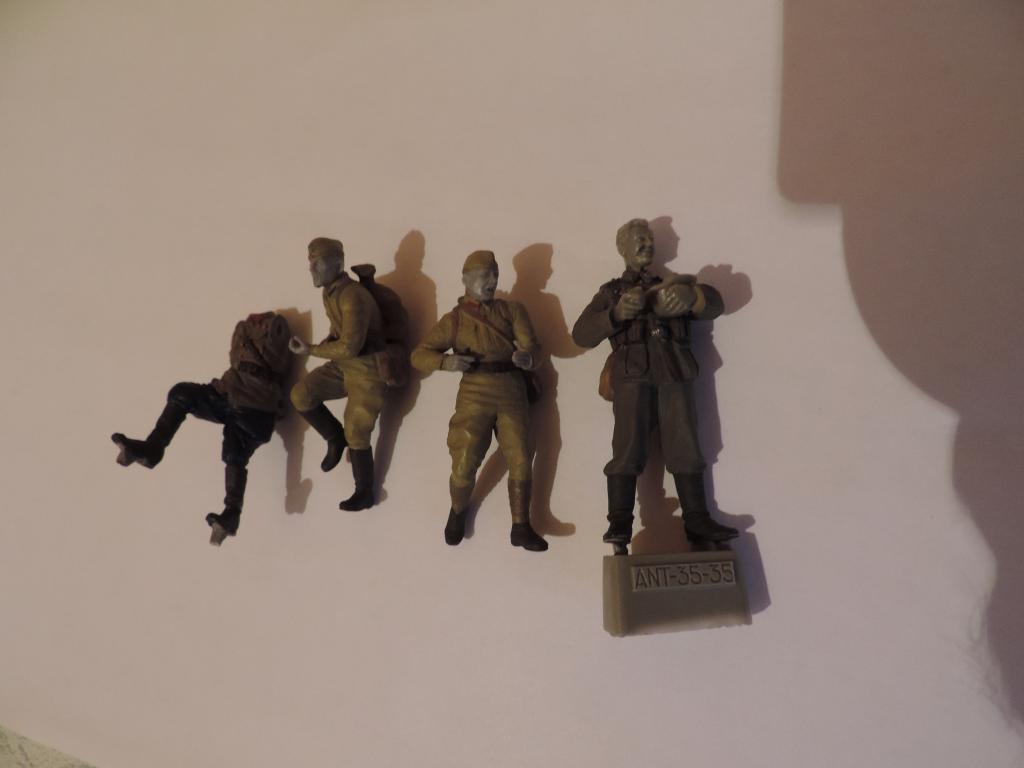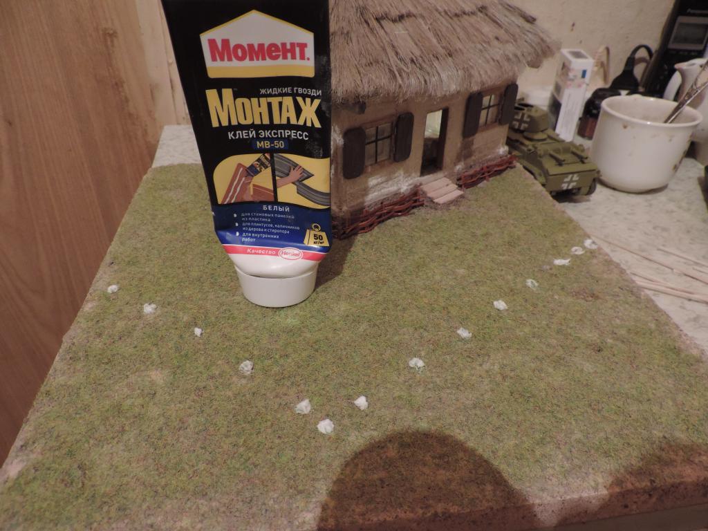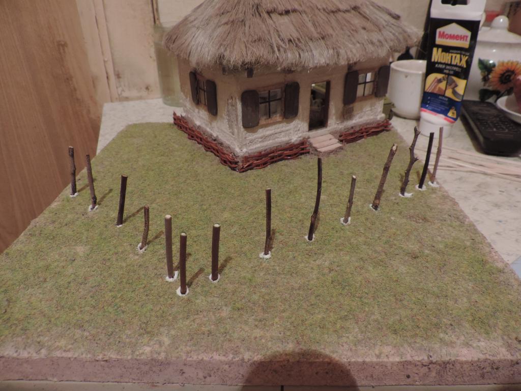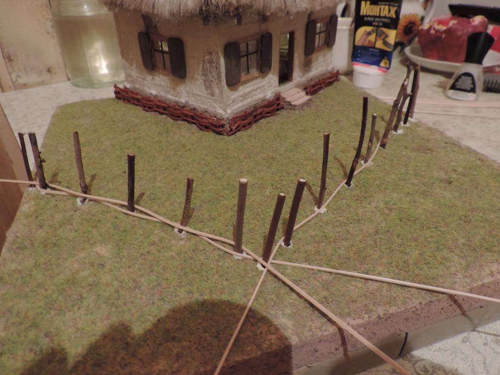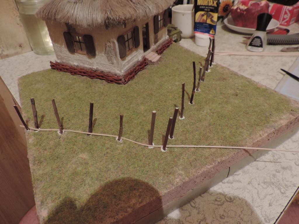 Да, и работа терзает, но всё-таки что-то делается. Хоть и маленькими шагами, но всё равно идём вперёд. Начал сооружать плетень во дворе. сначала наметил отверстия под колья и залил их клеем. Затем вставил в лунки обрезки веток от кустарника и стал их обвивать бамбуковыми палочками, извлечёнными из старого китайского коврика. Потом в нужном месте буду этот плетень ломать и пригибать под наехавший на него танк. Попутно понемногу собираю и раскрашиваю фигурки. Пока в работе первые четыре.