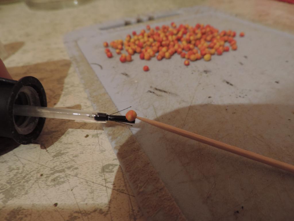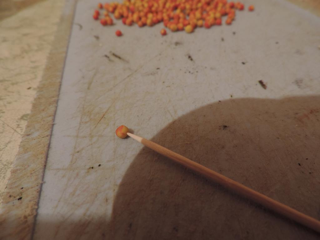 Начинаю развешивать яблоки на ветки. Накалываю слегка на зубочистку, смазываю край яблока суперклеем и на зубочистке переношу на ветку. Таких веток должно быть на этом дереве десяток.