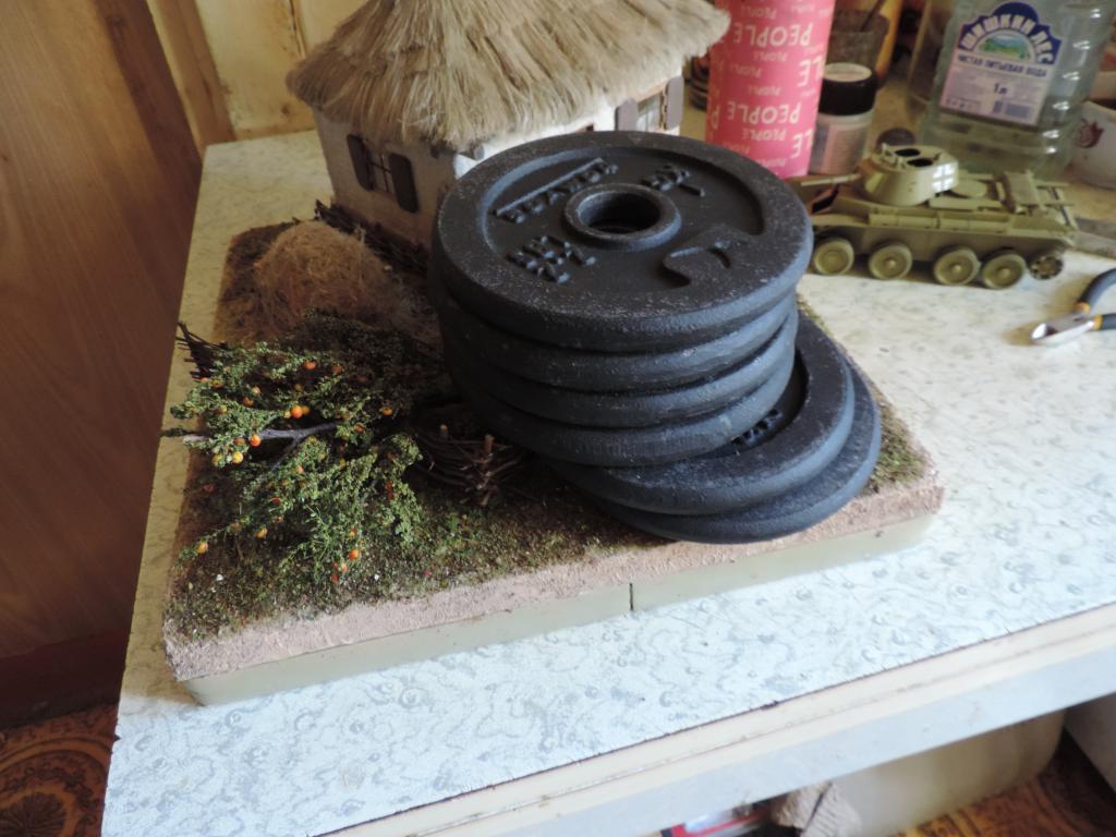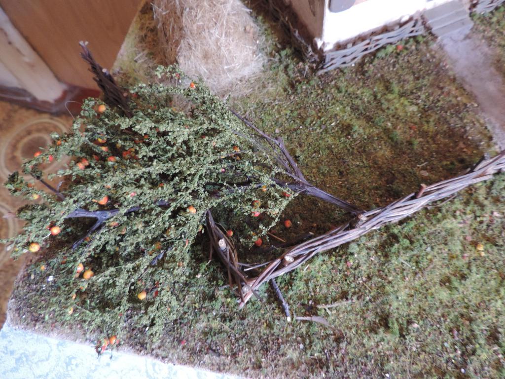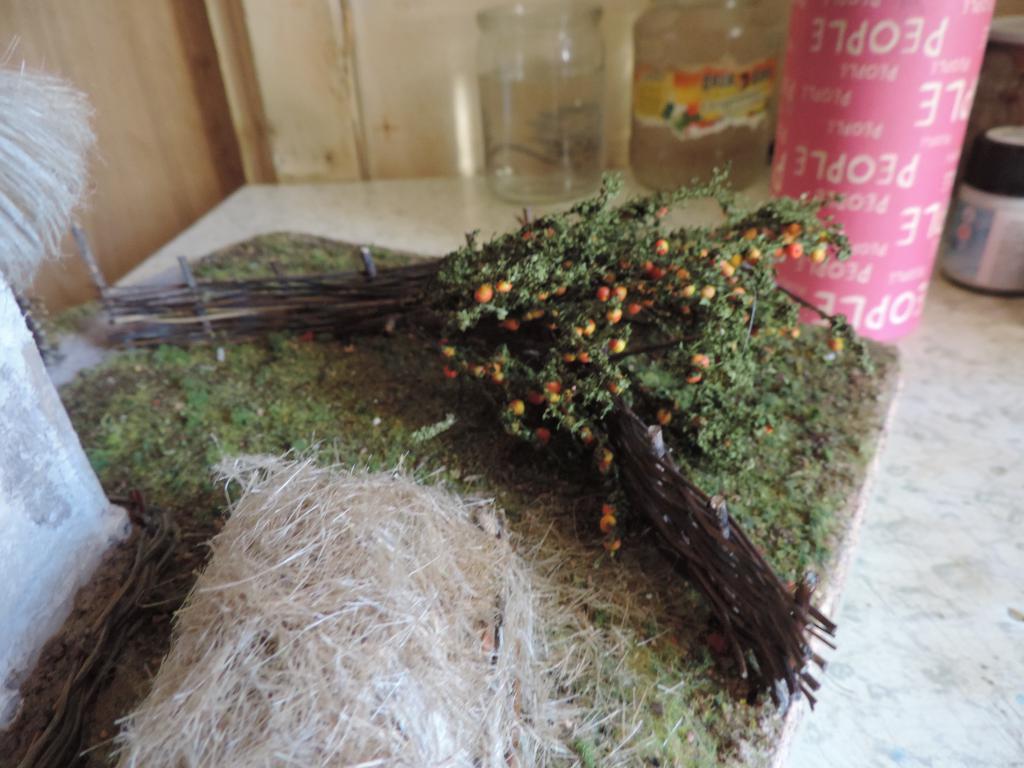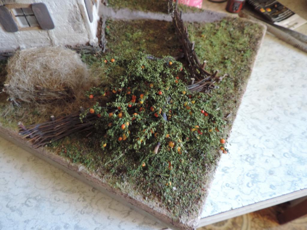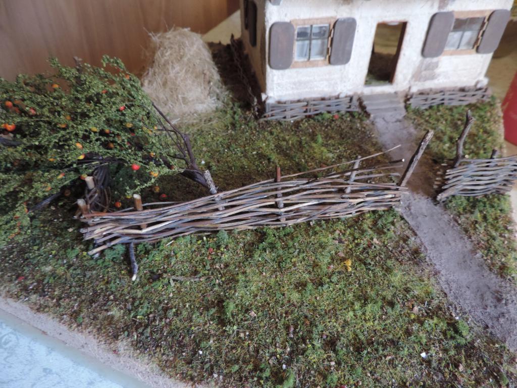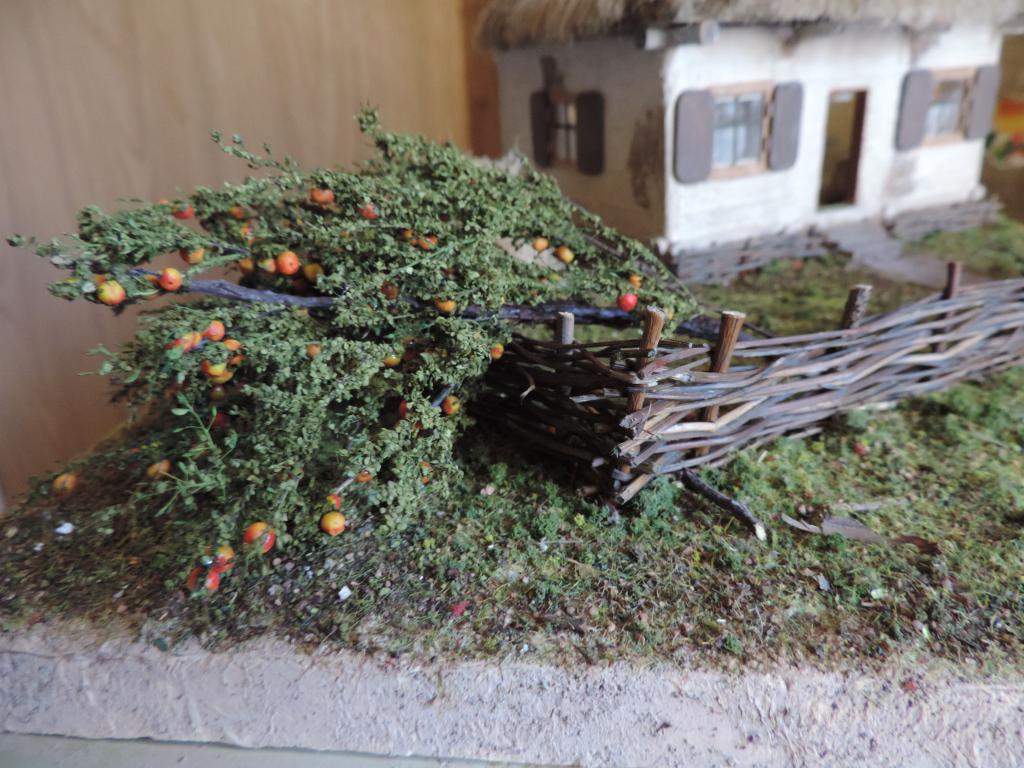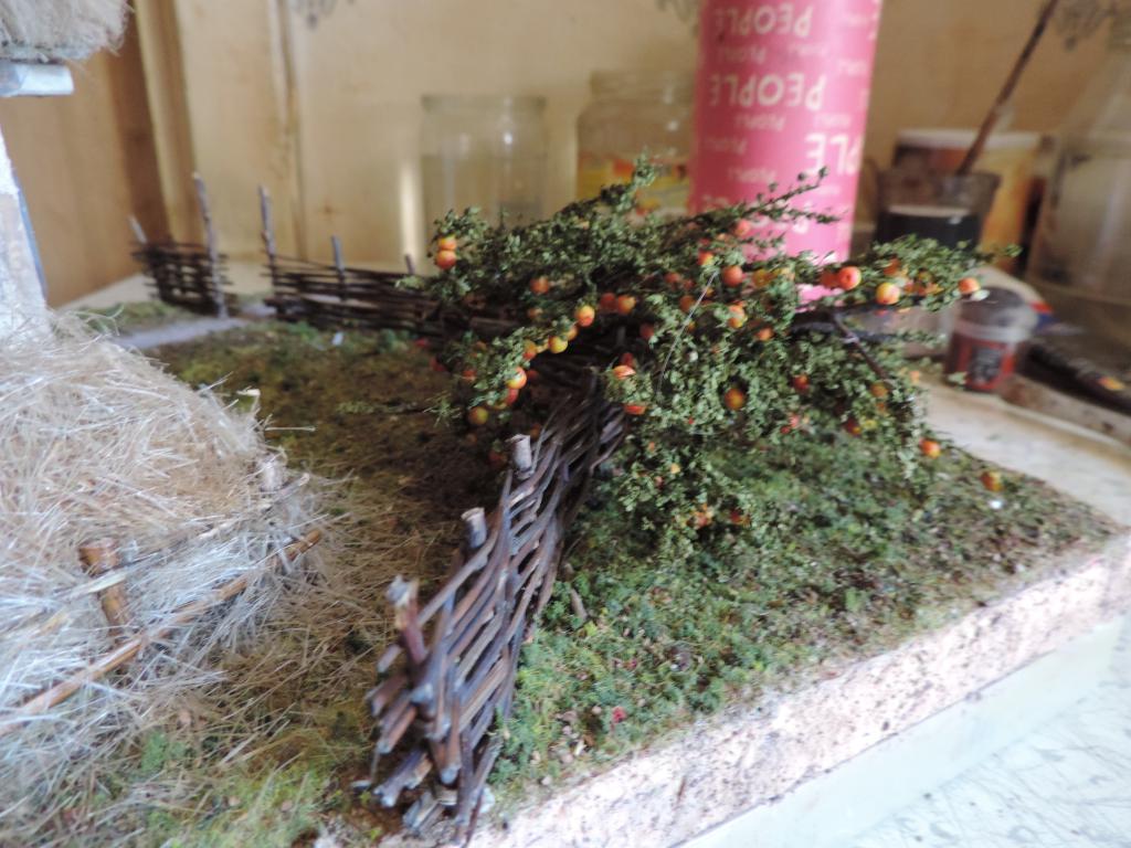 Когда все ветки украсил яблоками, приклеил их к стволу и приклеил само дерево на своё место. Заломал плетень, смазал клеем и поставил под груз высыхать.