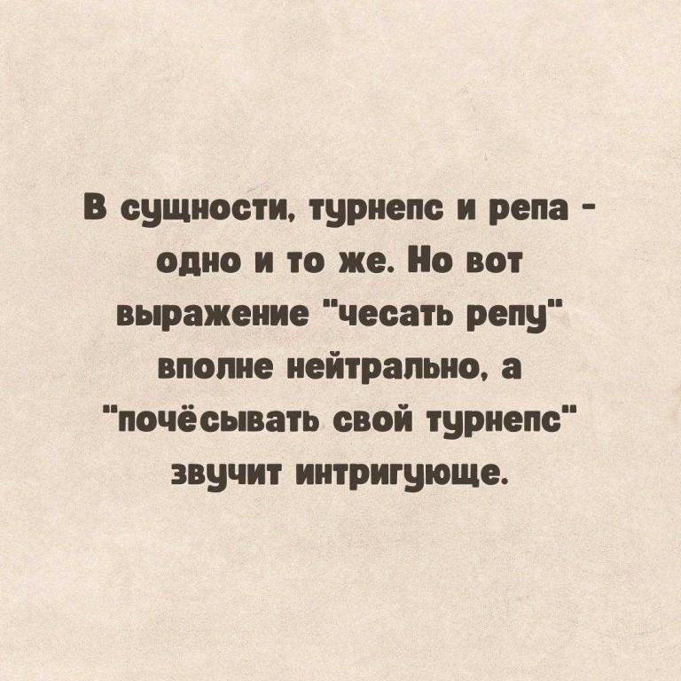 Всё-таки русские люди — интереснейший вид! В животе у них — бабочки, в голове — тараканы, в жопе — шило. В одном глазу — соринка, в другом — бревно, а в обоих сразу — душа. В ребре у них — бес, во рту — каша, за зубами — язык без костей, а зубы на полке. Губы раскатываются и закатываются. И челюсть отпадает периодически Сердце — в пятках, а в желудке — путь. ( к сердцу мужчины))) И на носу — зарубки. (заруби себе на носу) На пальцах — объяснения, а на лбу — написано. На ушах — лапша. На душе — камень, и за пазухой — тоже. В крови — молоко, в горле — кость, на себе — крест, а в печёнке — всё остальное.