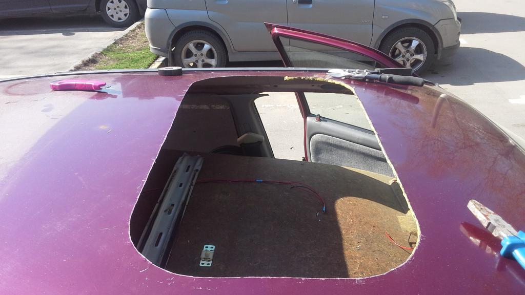 Еще на днях расковырял крышу и впихнул люк. Хоть и кондей в машине шпарит норм, люк не плохое подспорье.шаблон из миллиметровой бамаги, тщательно всё вымерил до милиметра, что бы ровно без перекосов.