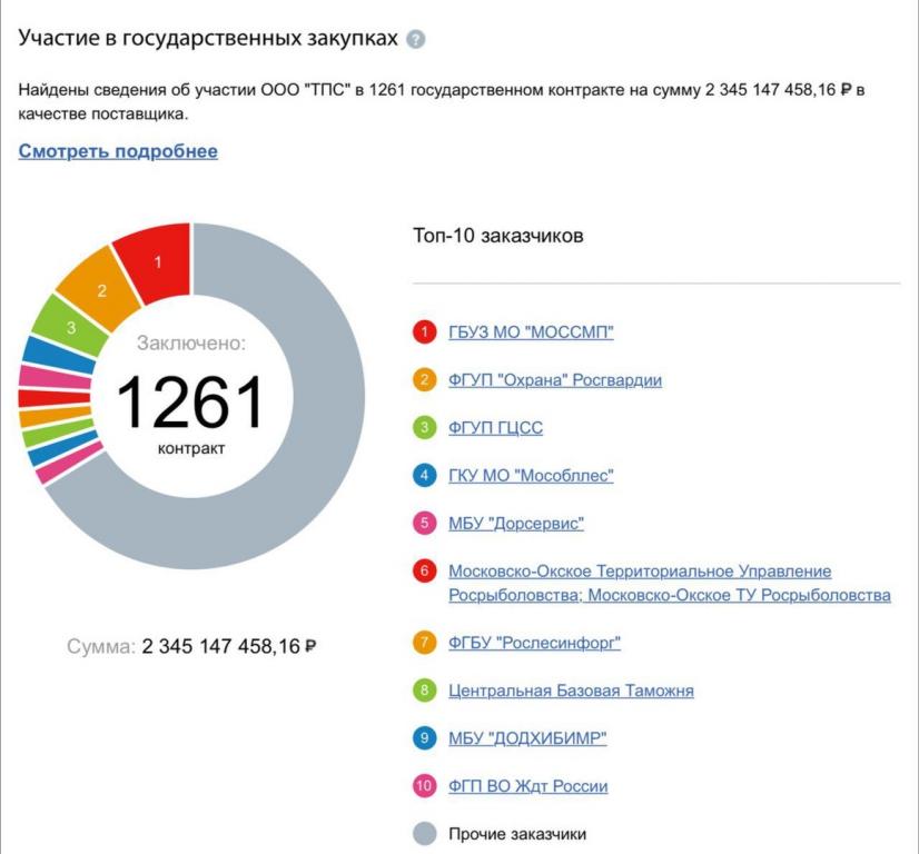 ООО «ТПС» ( "ТЕХНОЛОГИЧЕСКИЙ ПРОЦЕССИНГ И СЕРВИС") с уставным капиталом 100 тысяч рублей в качестве поставщика нефтепродуктов для госструктур заключила 1261 государственных контрактов на сумму 2 345 147 458,16 рублей.