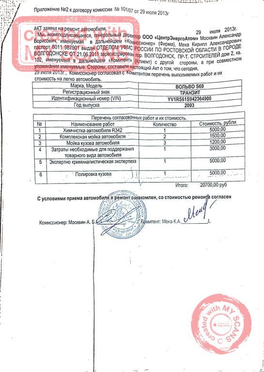 10. Приложение №2 акт заявки на ремонт. Уже с названия этой писульки ржать охота. Судя по пунктам 2 и 3 за два месяца должно быть 5 моек, соответственно если владелец заберет машину через пару дней то за неиспользованные мойки платить он не обязан. П.5 написан человеком с двойкой "па русскаму езыку", да и не имеет права комиссионер проводить экспертизы криминалистические ибо есть приказ МВД №1001, а согласно ст.780 ГК РФ исполнитель должен оказать услугу лично. Даже если какая-то экспертиза проводилась, то по ее результатам должно быть письменное заключение эксперта. В любом случае, выполненные работы должны быть оформлены актами, с противном случае платить за них не надо.