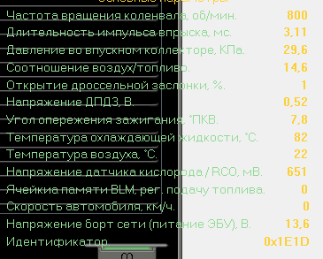 Так и не нашёл толкового мануала по диагностике. Какие параметры датчиков должны быть в норме - тайна покрытая мраком! На сколько я понял, детонация вполне может быть из за переобогащённой смеси, т.е. из за долгого впрыска. Вот параметры на ХХ, кто в курсе это норм?