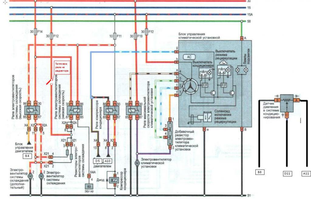 Именно так. А удаление преда компрессора решает проблему по нелепой случайности, на сколько я понял. Реле 2й скорости вентилятора имеет 4 ноги. Когда на 85 и 86 подаётся напряжение, 30 и 87 замыкаются и на вентилятор подаётся +. Так вот, на 85 ногу подан постоянный + с предохранителя компрессора, а с ЭБУ приходит - на 86 ногу. Т.е., когда преда нет, тупо не работает реле, т.к. схема не полная.