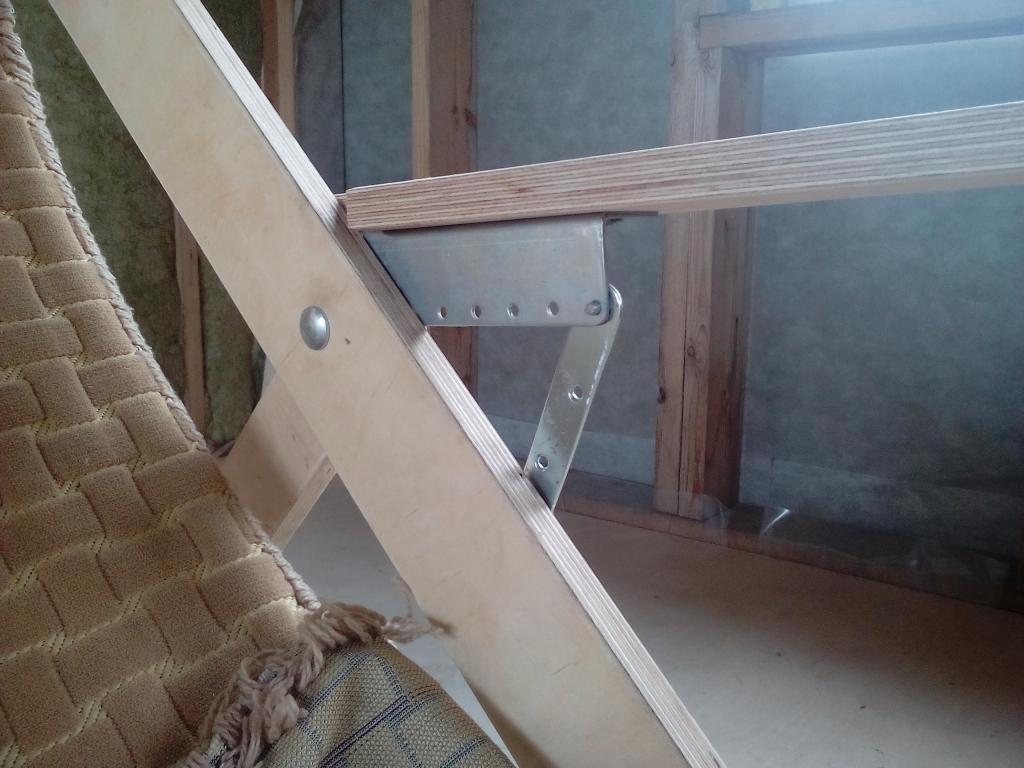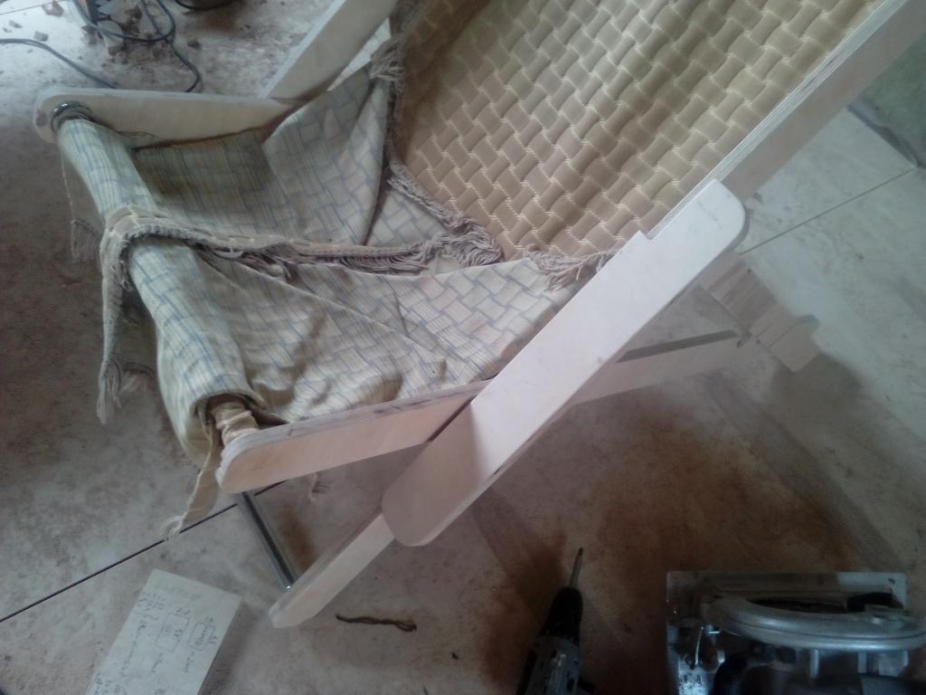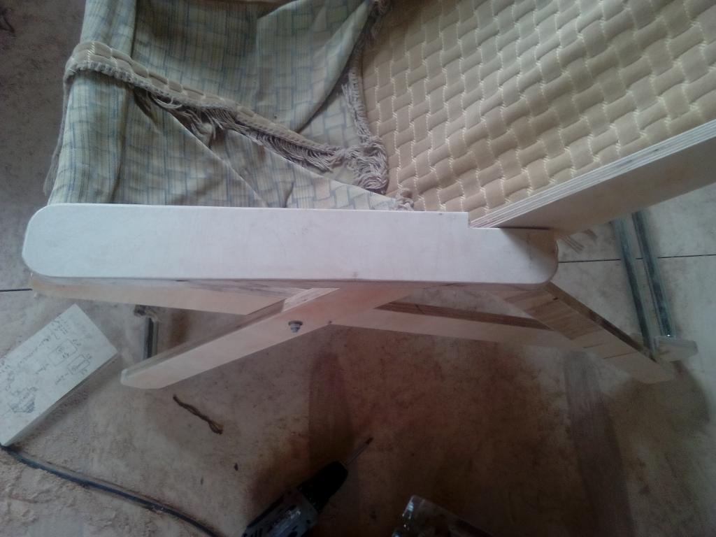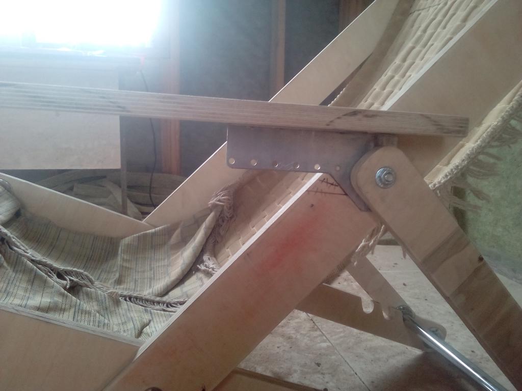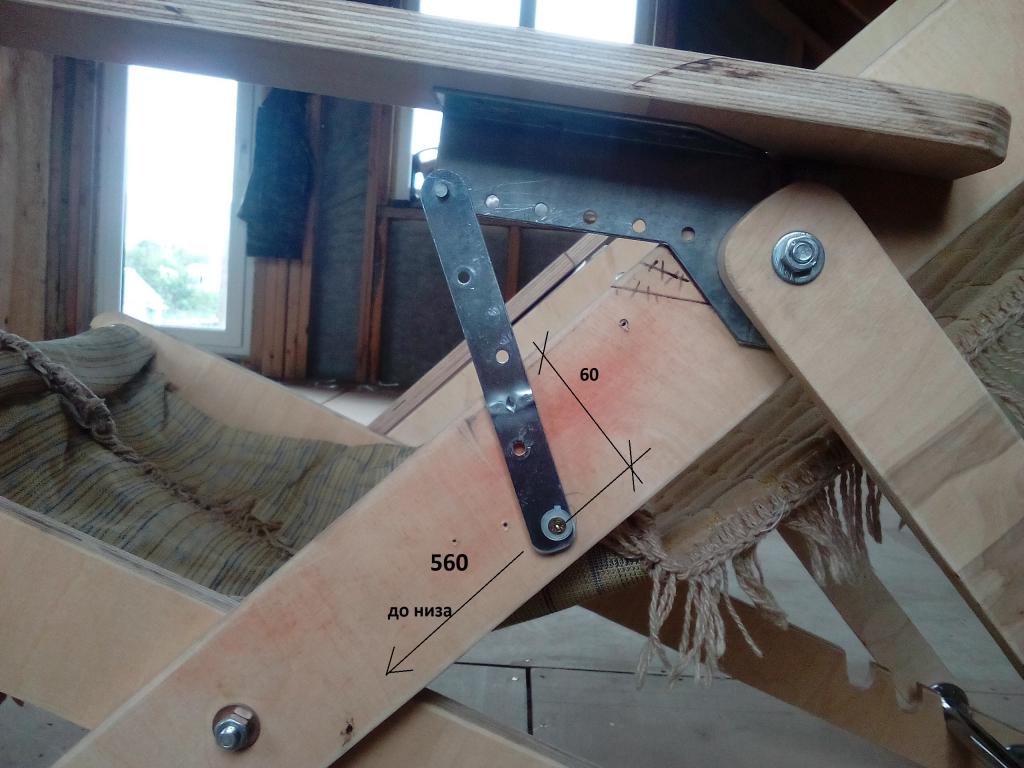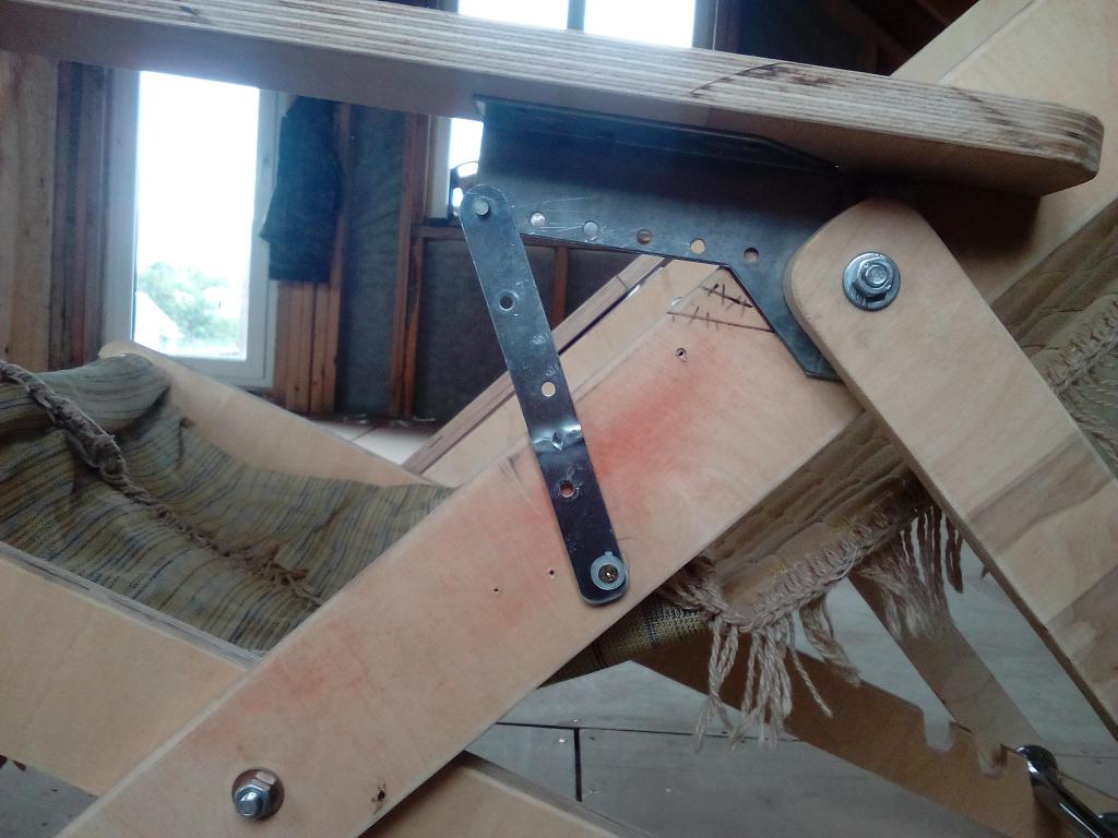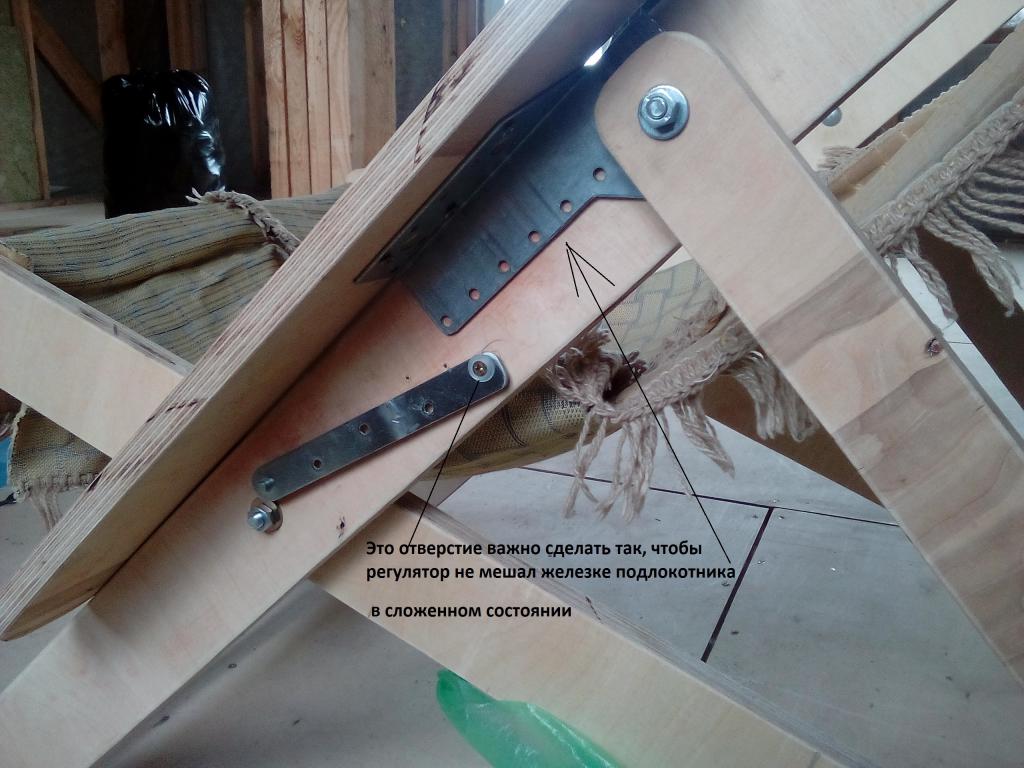 В сложенном состояниии шпилька для стопорения подлокотника в разных положениях, сделал из мебельного полкодержателя , расклепанного в отверстии планки