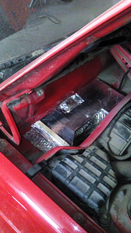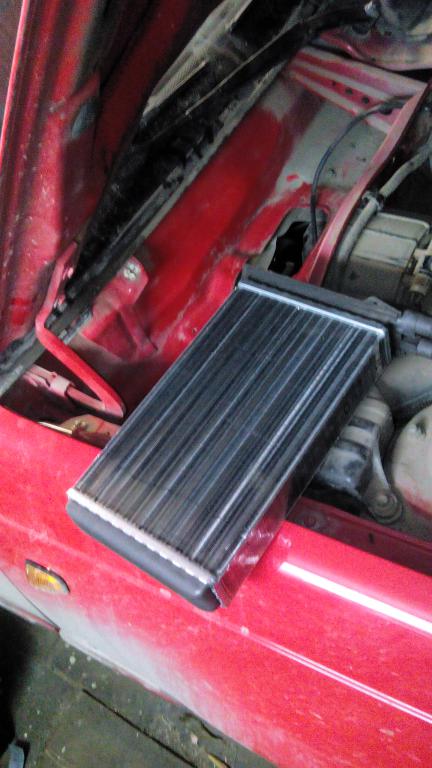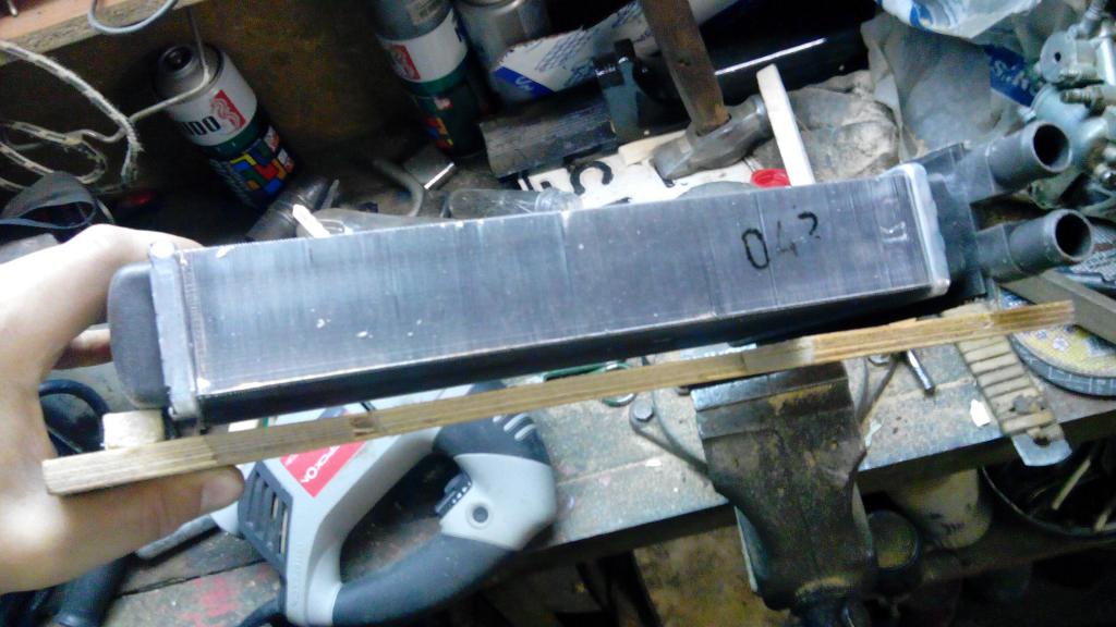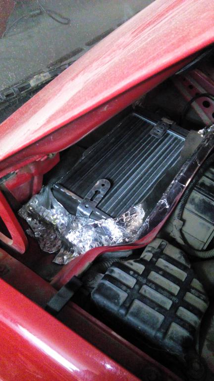 . Вчера сделал то, о чем мечтал. А именно: викинул к херам корпус салонного фильтра с заслонкой рециркуляции. Радиатор ТАЗ 2109 установлен на фанерке через брусочек. Фанерка обклеена алюминиевым скотчем. Привинчена к железу в том же месте, где крепился корпус СФ. Пригодились и оставшиеся после ВШИ материалы. Пока не подключил т.к не купил кран со шлангом, антифризу для доливки и не могу решить как подключить: к обогреву дросселя или последовательно штатной печке. Кстати посоветуйте какой кран купить и какие трубки, ершики к нему?