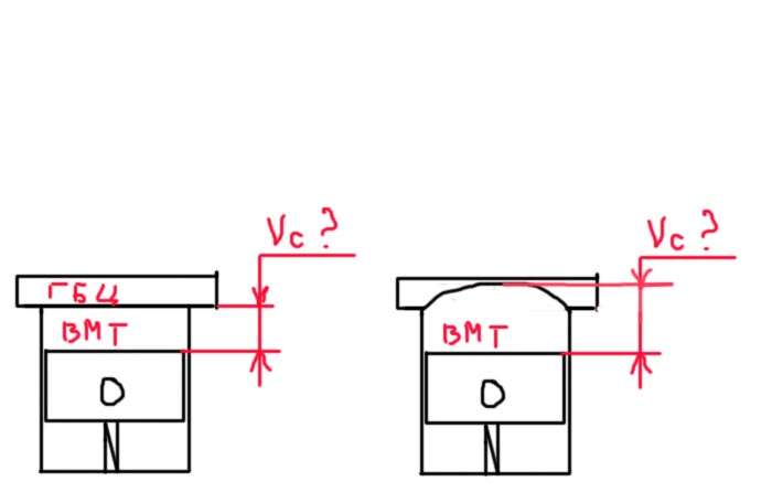 Объем камеры сгорания - это объем в ГБЦ, когда поршень в ВМТ(т.е. на правом рисунке)