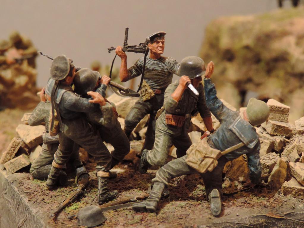 Вложение 37485Вложение 37493Вложение 37492Вложение 37491Вложение 37490Вложение 37489Вложение 37488Вложение 37487Вложение 37486Вложение 37494Привет, парни. Вот и закончил работу над очередной диорамой. Расскажу - о чём она. Диорама посвящена военным событиям летом 1942 года. 8 мая 1942 года немцы перешли в наступление на Керченском полуострове и 16 мая овладели Керчью. Войска Крымского фронта, оборонявшие город, вынуждены были эвакуироваться на Таманский полуостров. Часть войск (остатки 83-й бригады морской пехоты, 95-го погранотряда, Ярославского авиационного училища, Воронежской школы радиоспециалистов и других частей — всего свыше 10 тысяч человек), прикрывавшая отход и переправу главных сил, оказалась отрезанной и заняла оборону в Аджимушкайских каменоломнях.